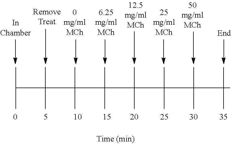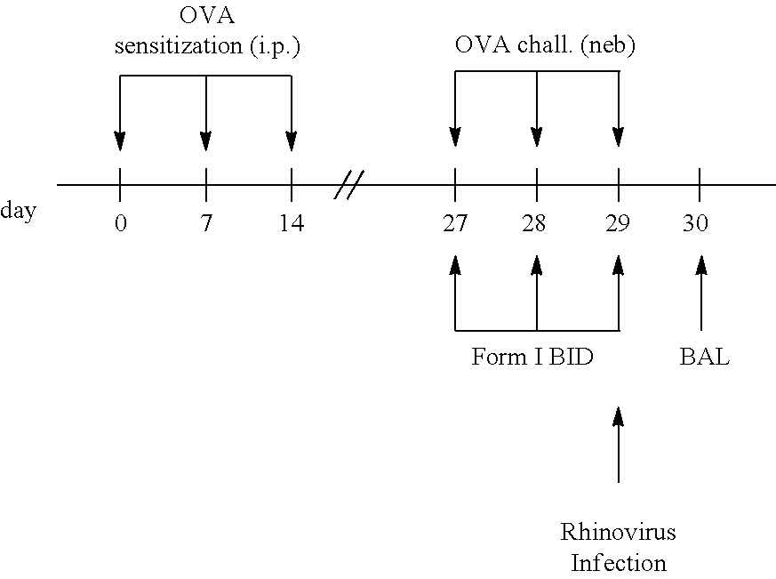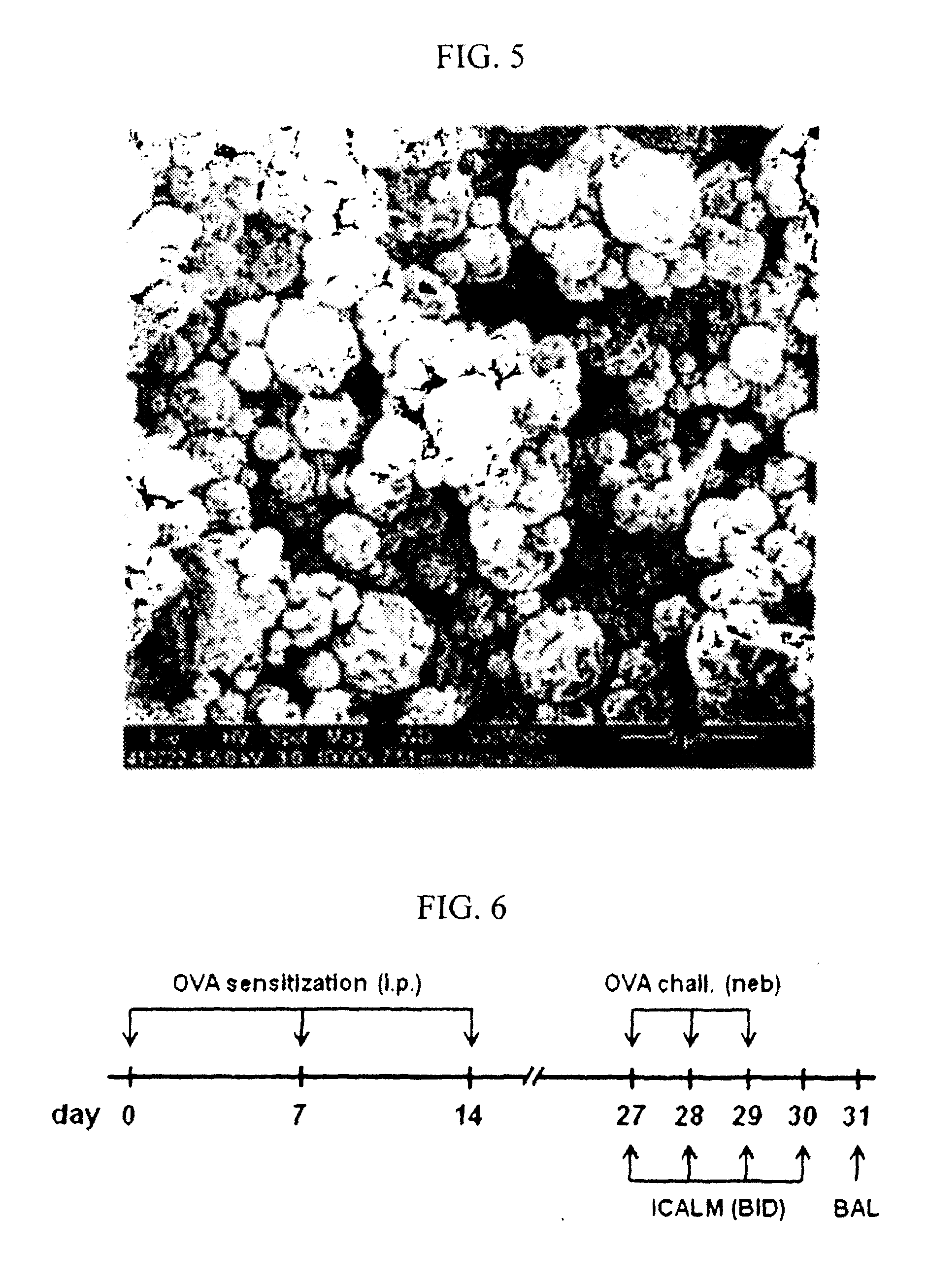 In this model, mice were sensitized to OVA over a period of two weeks and subsequently challenged, via a liquid aerosol, with OVA (FIG. 6). This challenge induced lung inflammation and increased airway hyperreactivity in response to an airway challenge. The principle change in inflammation was an increase in the number of eosinophils in the lungs. Similar changes in lung inflammation and pulmonary function have been observed in humans with asthma.