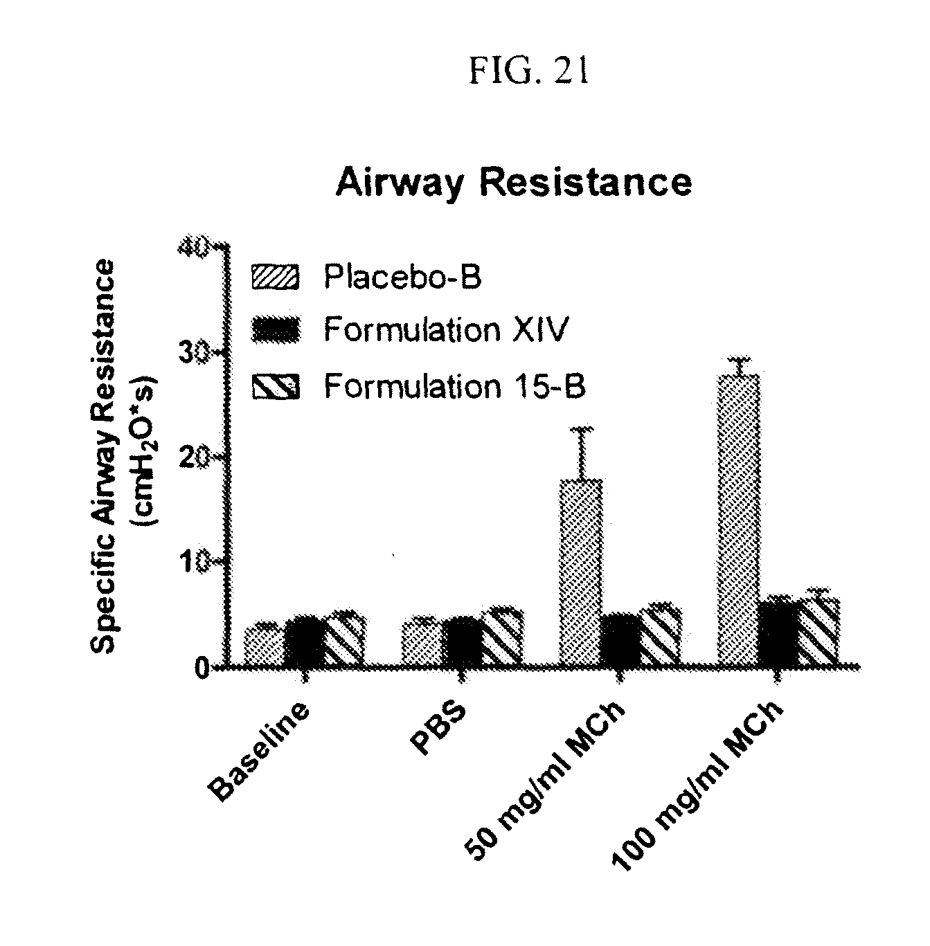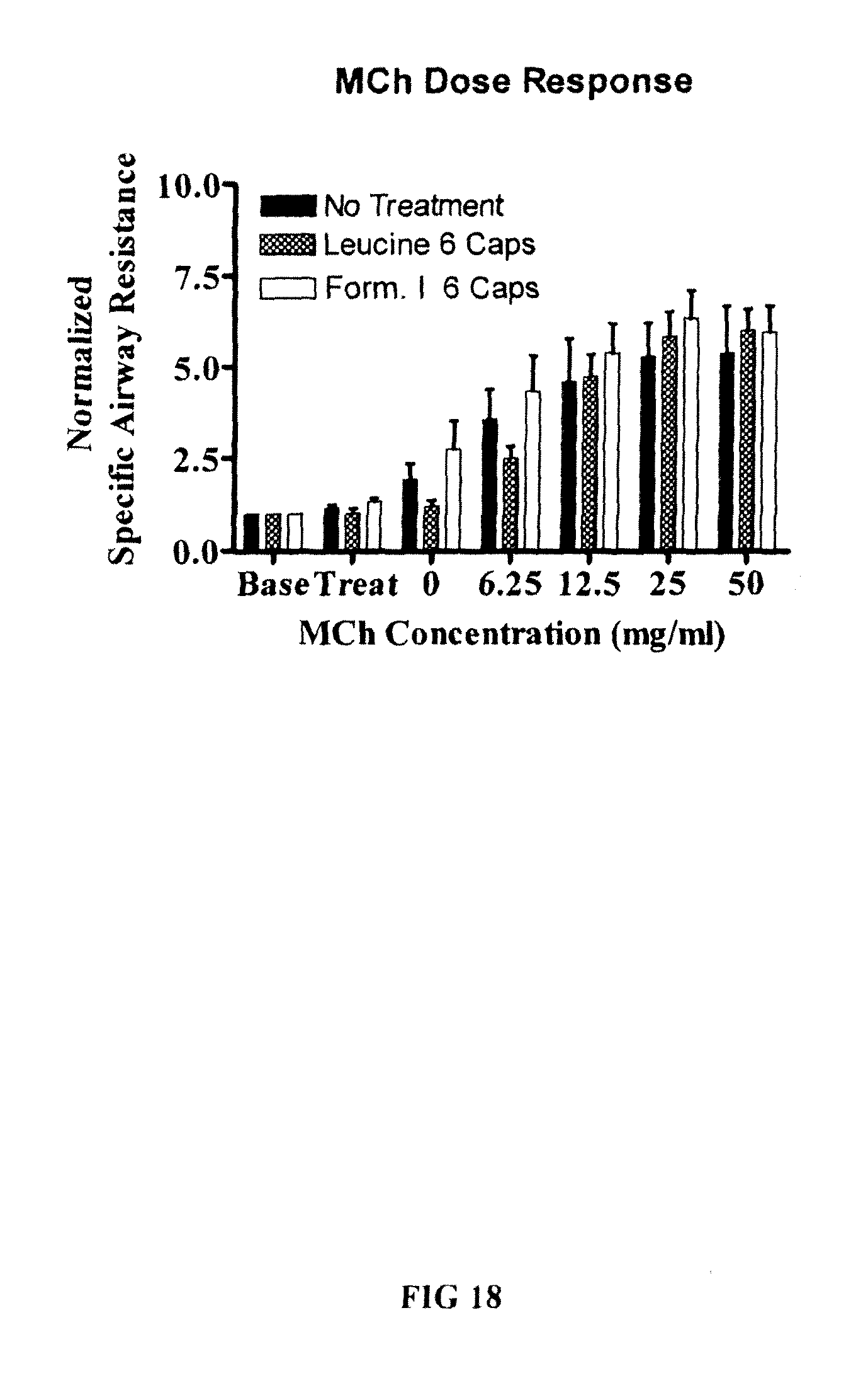 While the effects of SX and TioB on sRaw were known from the literature, the effect of co-formulating SX and TioB formulations with a calcium salt were unknown. Formulations XI (75.0% calcium lactate, 15.31% leucine, 5.0% NaCl, 4.0% fluticasone propionate and 0.58% salmeterol xinafoate, w/w on a dry basis), XIV (75.0% calcium lactate, 19.89% leucine, 5.0% NaCl, and 0.113% tiotropium bromide, w/w on a dry basis), 15-A (30% leucine, 65.4% NaCl 4.0% fluticasone propionate and 0.13% salmeterol xinafoate, w/w on a dry basis), and 15-B (34.47% leucine, 65.42% NaCl and 0.113% tiotropium bromide, w/w on a dry basis) were tested. Non-calcium containing Formulations 15-A and 15-B were tested in order to contrast the efficacies of the calcium-containing Formulations XI and XIV, respectively. Results from pulmonary function testing are shown in FIG. 20 and FIG. 21 for Formulations XI and XIV, respectively. These data show that calcium-containing Formulation XIV matched the positive control, Formulation 15-B, and completely eliminates airway hyperreactivity in response to methacholine challenge in an OVA model of allergic asthma. Treatment with Formulation XI did not match the reduction in sRaw that Formulation 15-A achieved, however, the variability within the group treated with Formulation XI overlapped that of Formulation 15-A and the mean reduction was lower than that observed with Placebo-B.