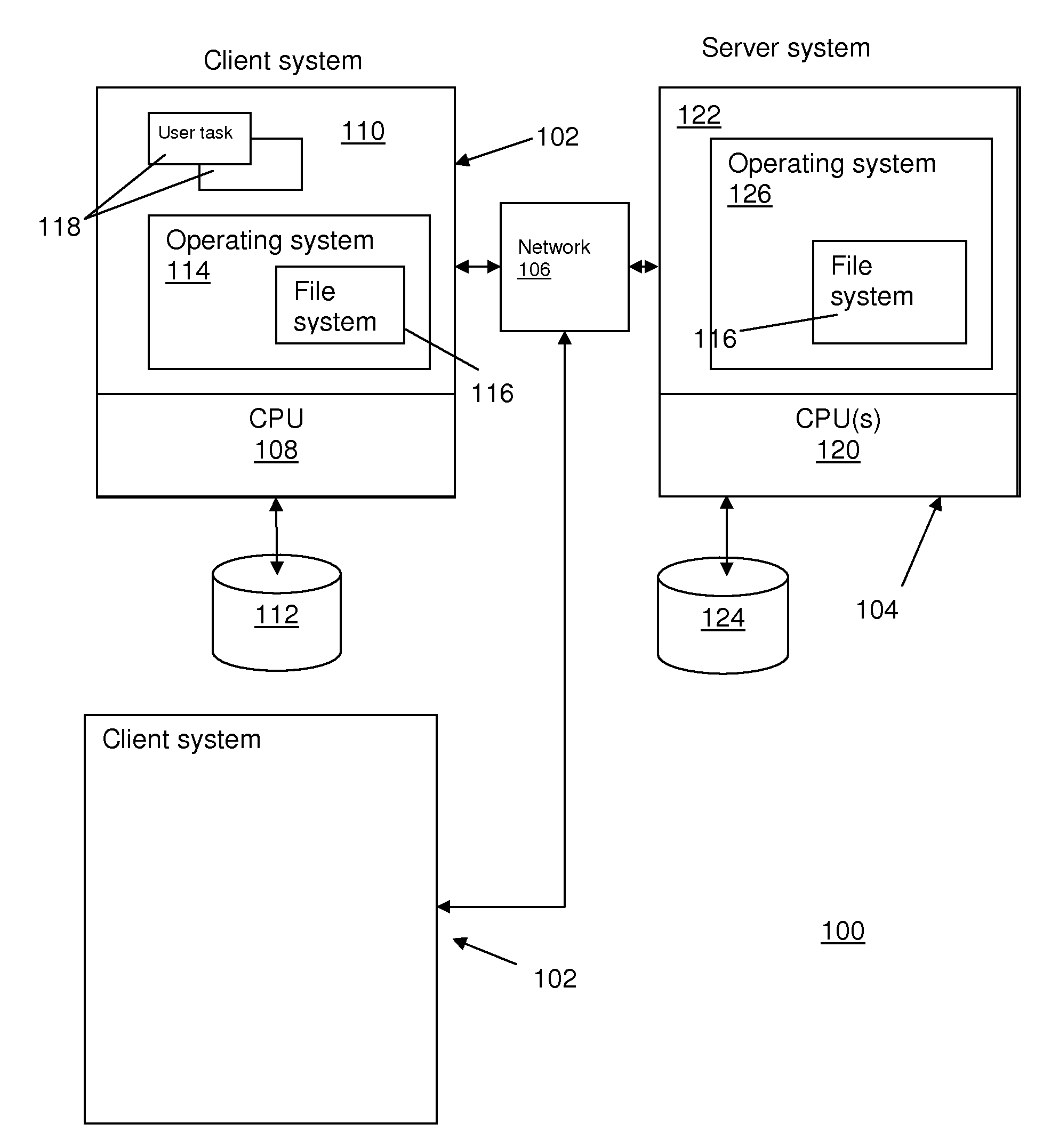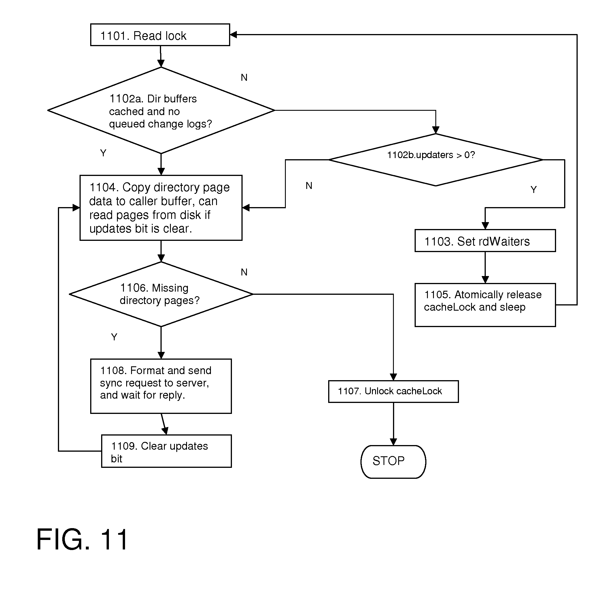 To be more specific, there is a limit to the number of bits M, that can be used in the hash value, if more names with the same hash value, using at most the M low-order bits of that value, fit in a directory page, an overflow block is linked to the page to contain the additional names. So in very rare cases, more than one block could be accessed on a lookup. The overflow pages are allocated at logical block 2M and higher. Thus the size of the directory can be used as an estimate of how many bits of the hash value are being used. Thus if it is determined that n bits of the hash value are being used, a name is hashed, the low-order n bits are used and the logical page number is examined. If that page does not exist, then the low-order n−1 bits are used to locate the logical page number, if that page does not exist, then the low-order n−2 bits are used to locate the logical page number, and so on, until the page that should contain the name is found. If the page is found, it is searched for the name. If the page has overflow blocks linked to it, they would also be searched. Since the addition or removal of a name does not normally require the split or merge of logical pages using extensible hashing, parallelism can be allowed for directory updates. To be specific, the server machine for the file system directory could use a multilevel locking scheme when making updates: there would be a main lock on the directory itself, this would be locked in read mode when reading, or making updates to the directory that affected only one directory page; this lock would be obtained in write mode if making an update that split or merged hash buckets (directory pages) or linked an overflow page to a hash bucket. Each directory page could also have a lock associated with it, this would be obtained in read mode when reading and write mode when writing. This allows for parallel updates if the changes are not changing the indirect blocks of the directory. An update that allocated or freed pages of the directory would lock the main lock in write mode guaranteeing single access. Using a flat file to store names in a directory yields slow search times, to provide fast search times by using an extensible hash directory format, allow parallel updates from client machines to a server 104, ensure the client directory pages remain cached, and minimize the probability that a lookup or readdir( ) request will need to wait for an in-progress update, the invention as described above, can be slightly modified to handle the more complicated extensible hashing layout. Applying the invention to a directory stored in the extensible hashing method for clients 102 that have direct disk read capability can be accomplished as follows: