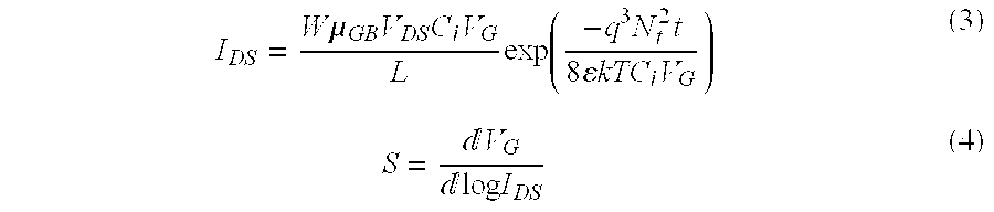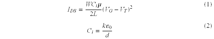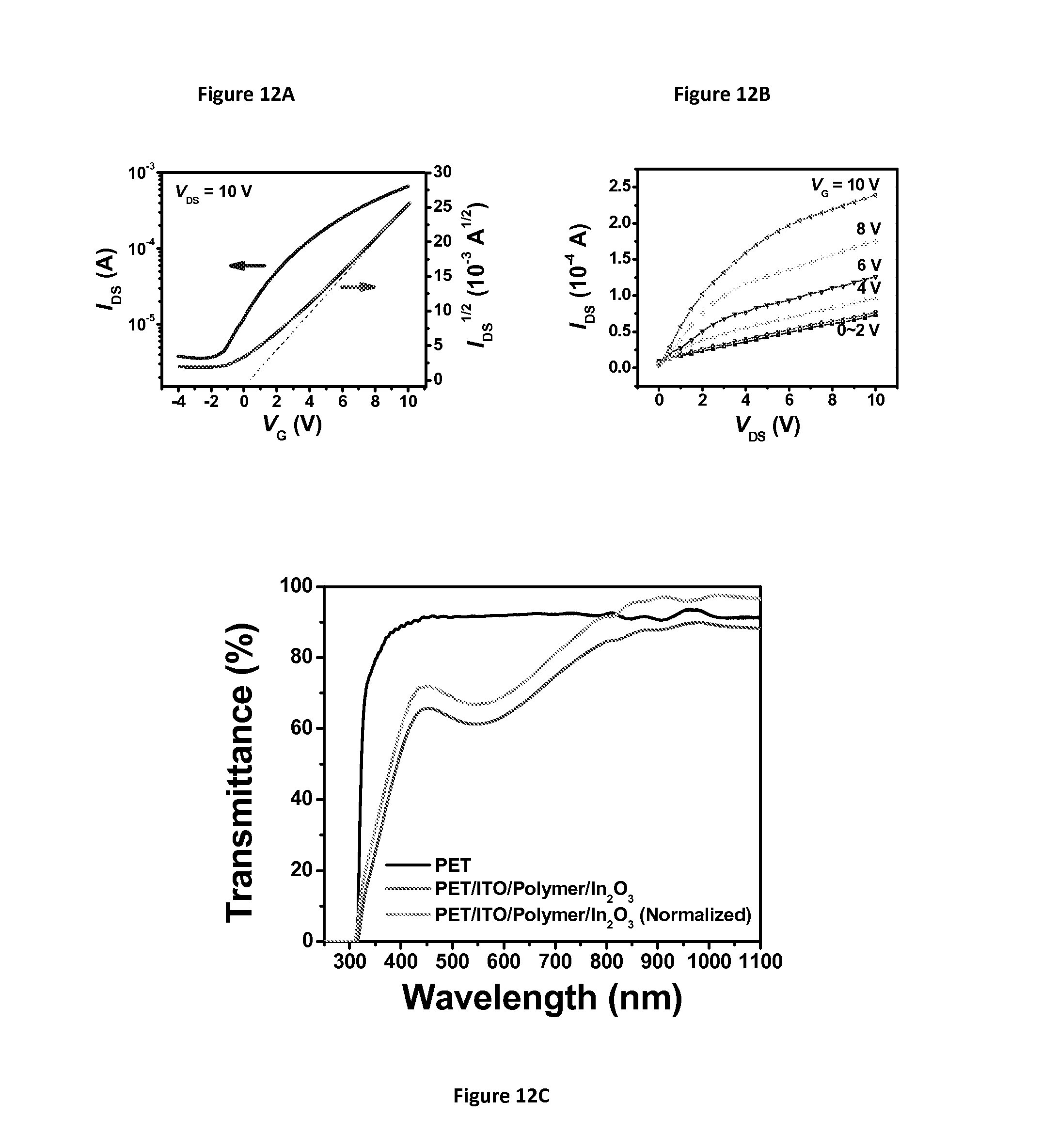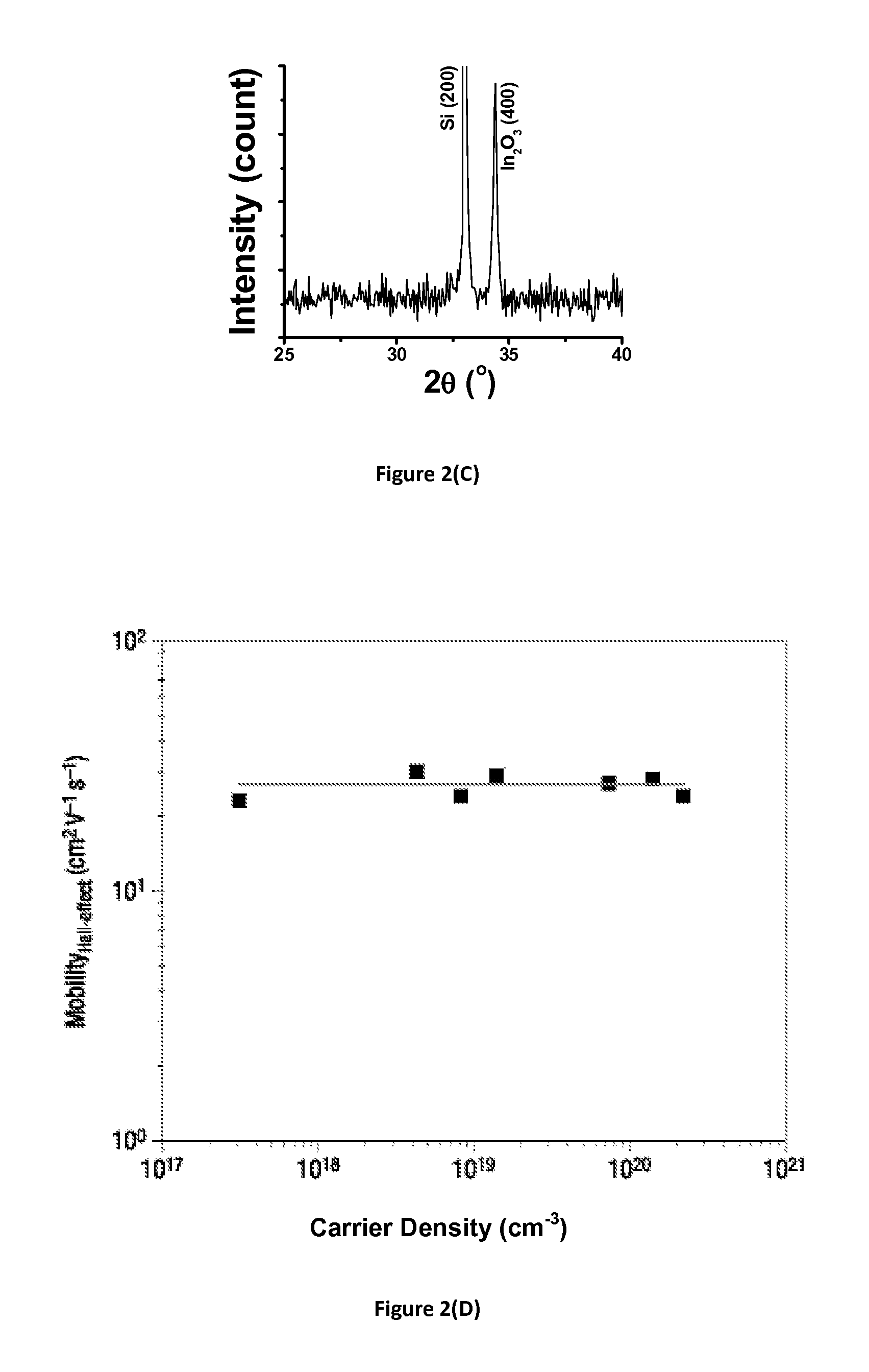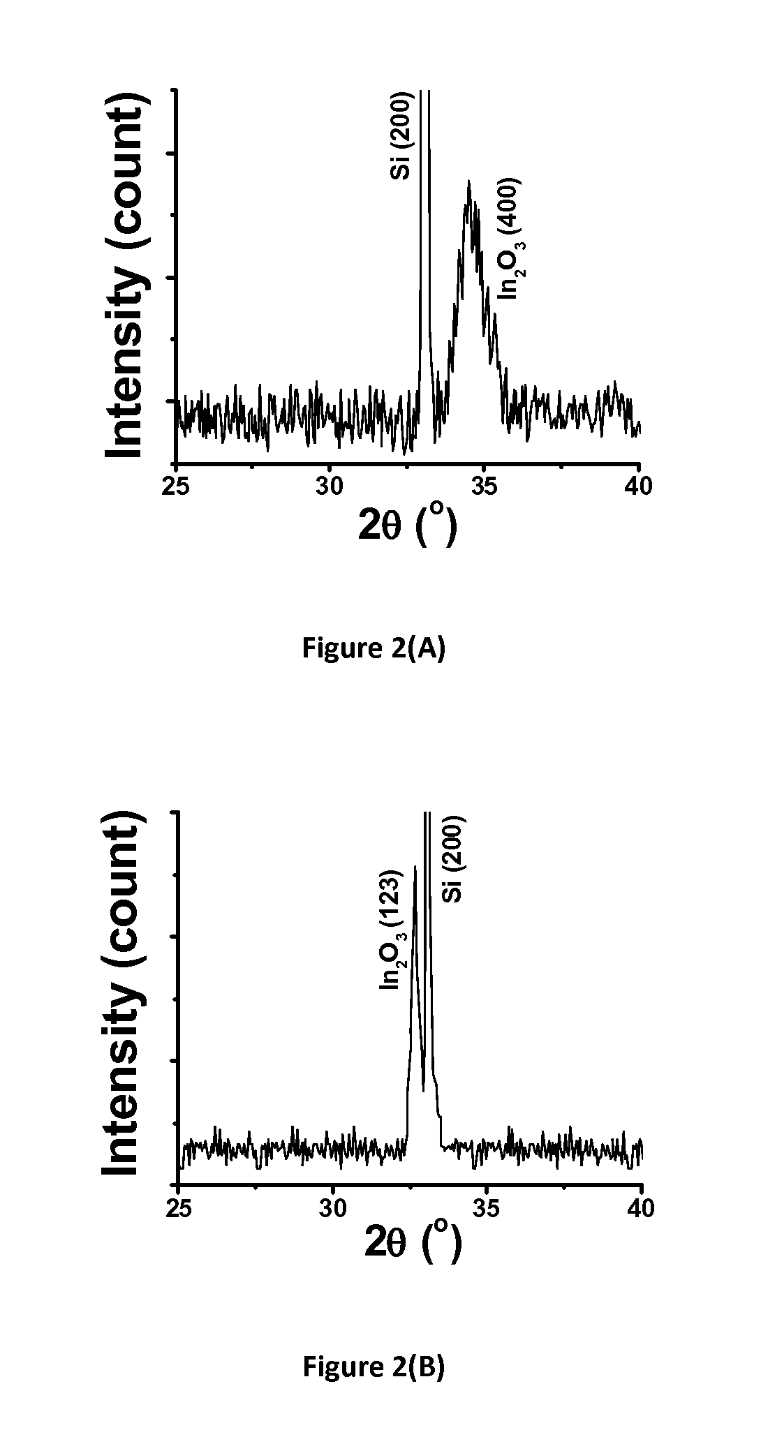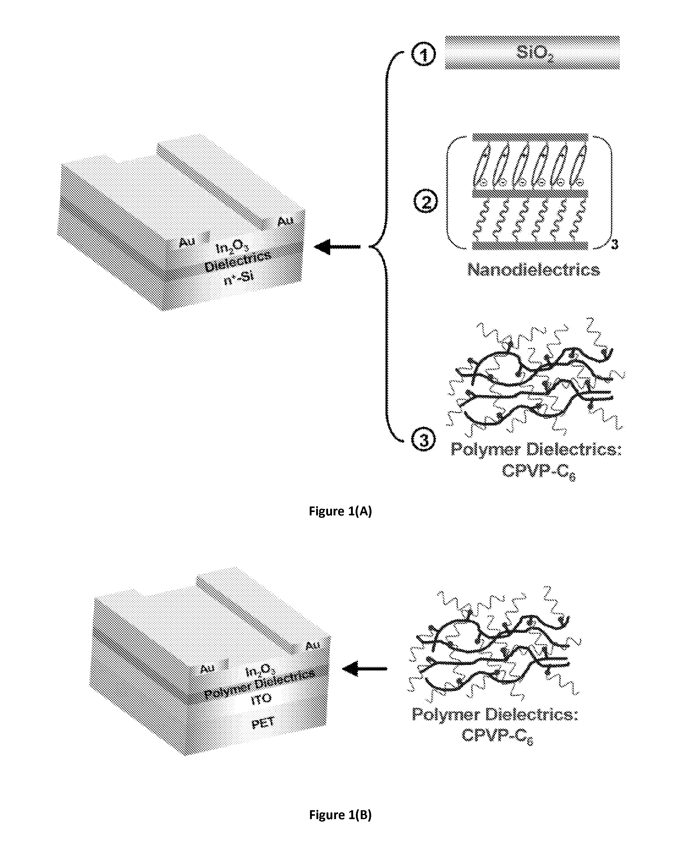 In2O3 thickness Dielectric/thickness D & S Gate (nm) (nm)/Ci (nF cm−2) electrodes 1. p+-Si 120 SiO2/300/10 Au 2. n+-Si 60 SAS*/16.5/180 Au 3. n+-Si 60 CPB†/20/250 Au 4. Glass/ITO 60 SAS*/16.5/180 Au 5. Glass/ITO 60 SAS*/16.5/180 In2O3 μFE μGB‡ Ion/ Vt Nt§ S (V per (cm2V−1s−1) (cm2V−1s−1) Ioff (V) (cm−2) decade) 1. 10 24 105 23 1.73 × 1012 5.6 2. 140 178 105 0.33 2.33 × 1011 0.15 3. 80 94 103 0 2.79 × 1011 0.41 4. 140 181 105 0.17 2.44 × 1011 0.08 5. 120 154 105 0.19 2.51 × 1011 0.09 *SAS = Self-assembled superlattice dielectric. †CPB = Poly-4-vinylphenol + 1,6-bis(trichlorosilyl)hexane dielectric. ‡μGB = Grain-boundary mobility. §Nt = Trap density. Component materials and device parameters for TFTs fabricated from In2O3 channel layers and organic CPB dielectrics on Si and PET/IAD-ITO gates using Au or In2O3 drain and source electrodes. Dielectric In2O3 Thickness Thickness (nm)/Ci D & S μFE μGB VT Gate (nm) (nF/cm2) Electrodes (cm2/V · s) (cm2/V · s) Ion/Ioff (V) Nt(cm−2) S (V/decade) n+-Si 60 70/100 Au 160 171 104 0.21 9.1 × 1011 0.24 PET/ITO 60 160/30 Au 20 26 103 0.12 2.9 × 1012 2.78 PET/ITO 60 160/30 In2O3 10 22 102 0.23 3.5 × 1012 2.98 EXAMPLES OF THE INVENTION