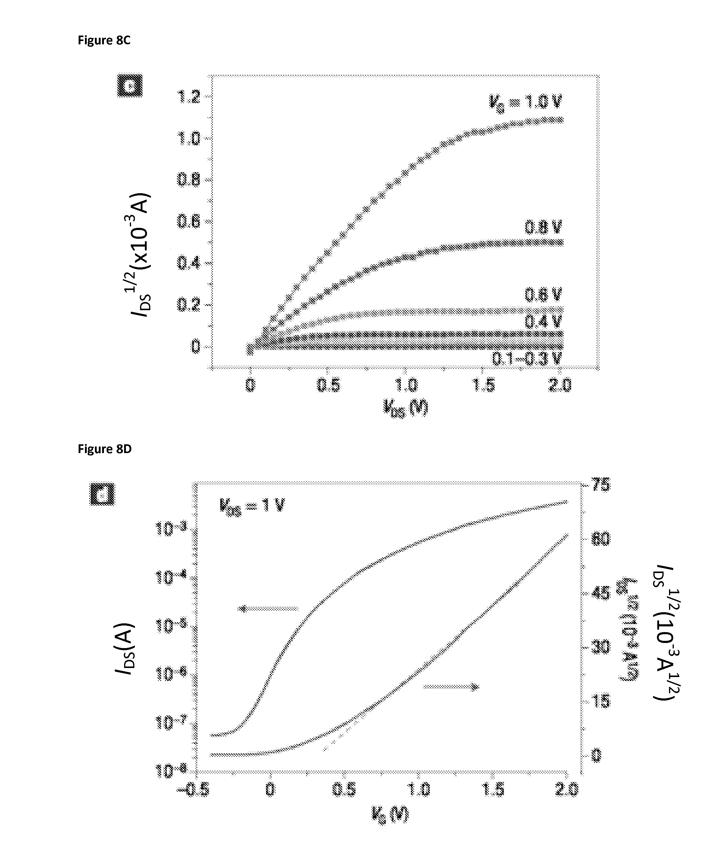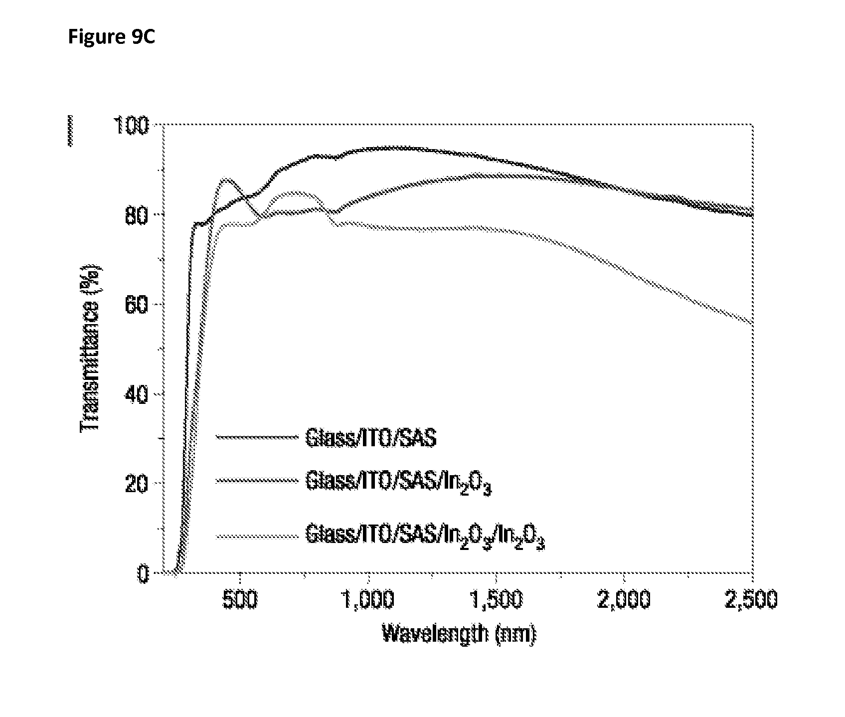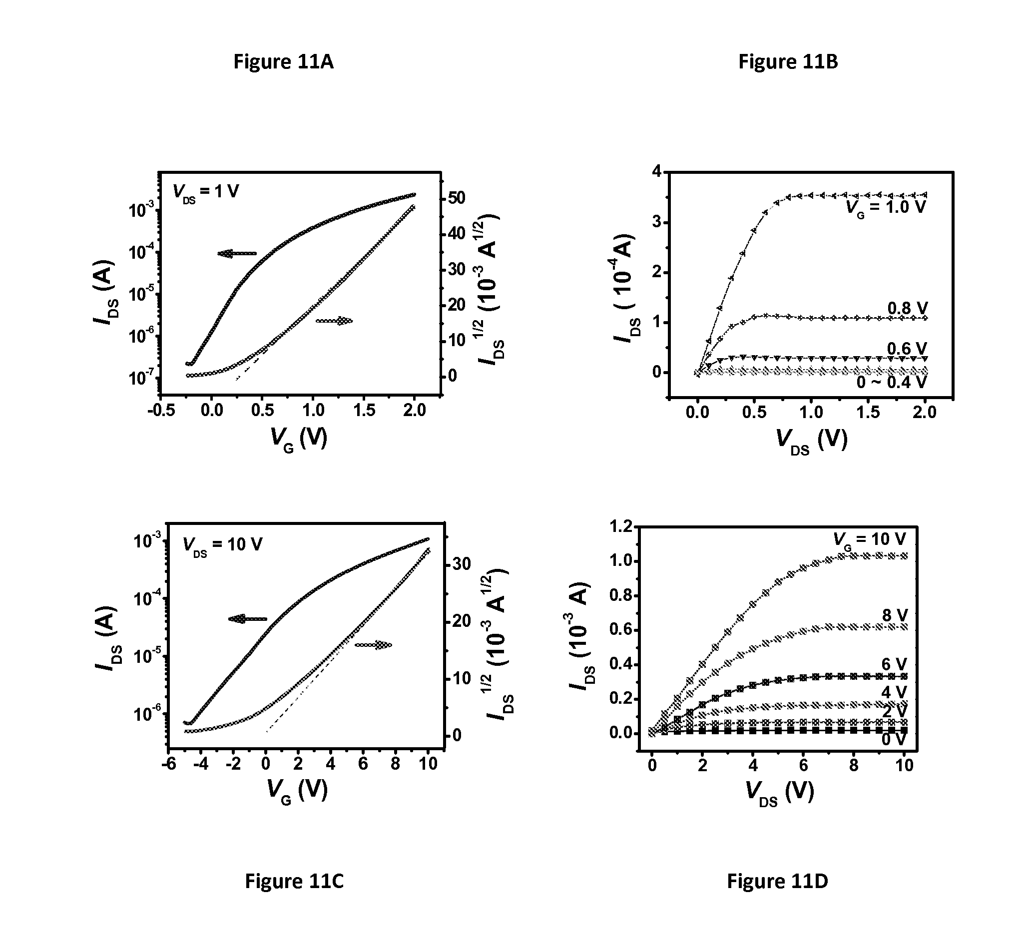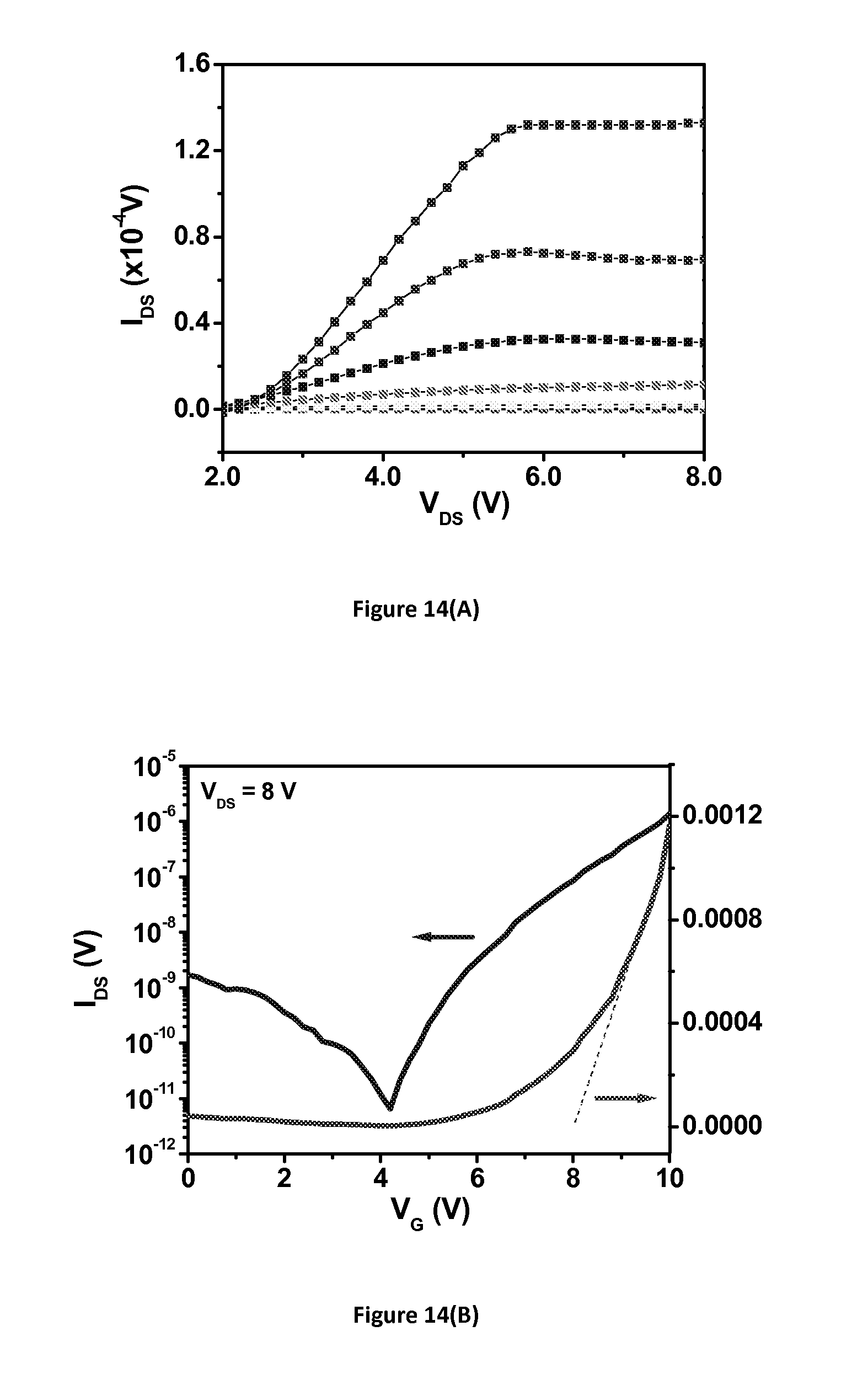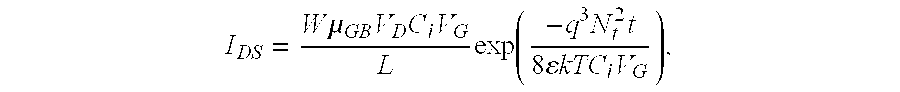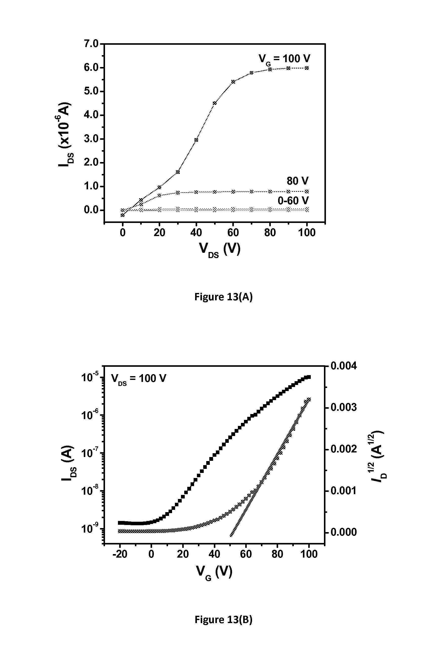 In2O3 thickness Dielectric/thickness D & S Gate (nm) (nm)/Ci (nF cm−2) electrodes 1. p+-Si 120 SiO2/300/10 Au 2. n+-Si 60 SAS*/16.5/180 Au 3. n+-Si 60 CPB†/20/250 Au 4. Glass/ITO 60 SAS*/16.5/180 Au 5. Glass/ITO 60 SAS*/16.5/180 In2O3 μFE μGB‡ Ion/ Vt Nt§ S (V per (cm2V−1s−1) (cm2V−1s−1) Ioff (V) (cm−2) decade) 1. 10 24 105 23 1.73 × 1012 5.6 2. 140 178 105 0.33 2.33 × 1011 0.15 3. 80 94 103 0 2.79 × 1011 0.41 4. 140 181 105 0.17 2.44 × 1011 0.08 5. 120 154 105 0.19 2.51 × 1011 0.09 *SAS = Self-assembled superlattice dielectric. †CPB = Poly-4-vinylphenol + 1,6-bis(trichlorosilyl)hexane dielectric. ‡μGB = Grain-boundary mobility. §Nt = Trap density. Component materials and device parameters for TFTs fabricated from In2O3 channel layers and organic CPB dielectrics on Si and PET/IAD-ITO gates using Au or In2O3 drain and source electrodes. Dielectric In2O3 Thickness Thickness (nm)/Ci D & S μFE μGB VT Gate (nm) (nF/cm2) Electrodes (cm2/V · s) (cm2/V · s) Ion/Ioff (V) Nt(cm−2) S (V/decade) n+-Si 60 70/100 Au 160 171 104 0.21 9.1 × 1011 0.24 PET/ITO 60 160/30 Au 20 26 103 0.12 2.9 × 1012 2.78 PET/ITO 60 160/30 In2O3 10 22 102 0.23 3.5 × 1012 2.98 EXAMPLES OF THE INVENTION