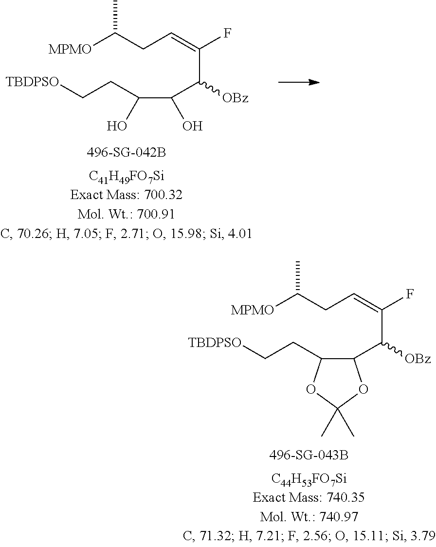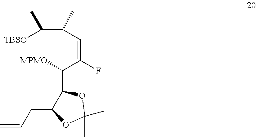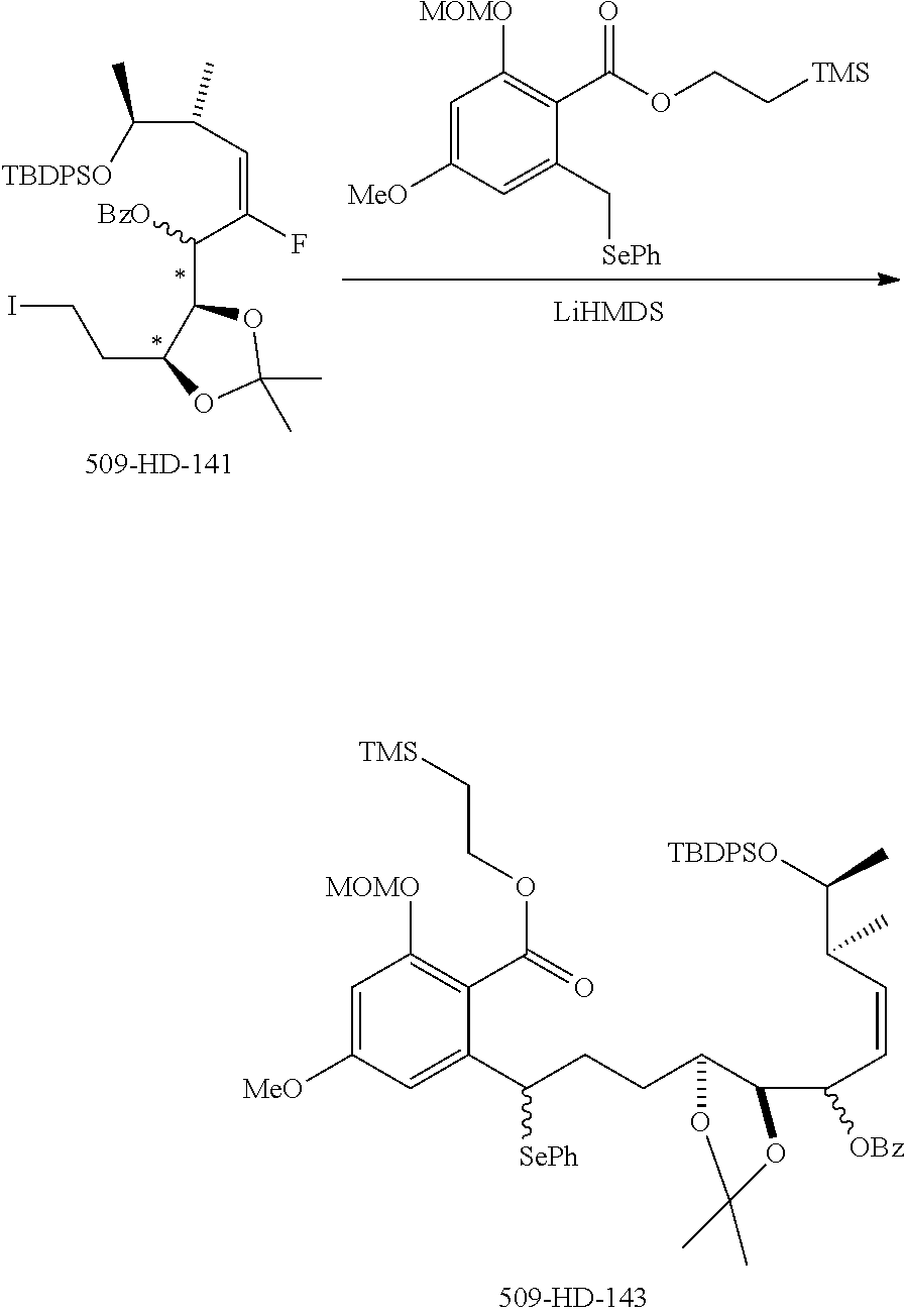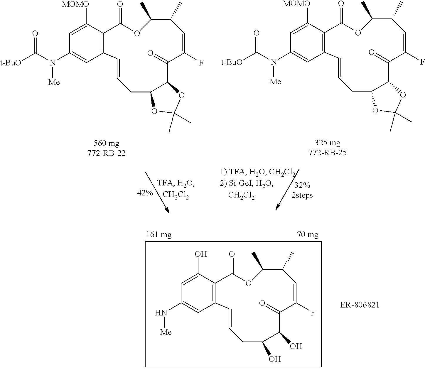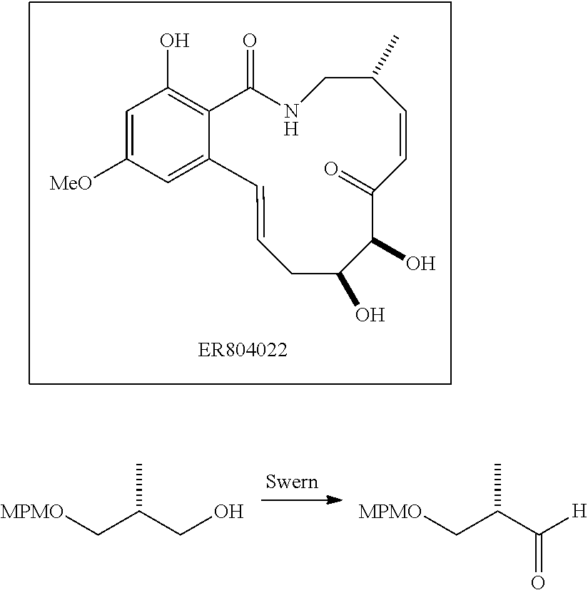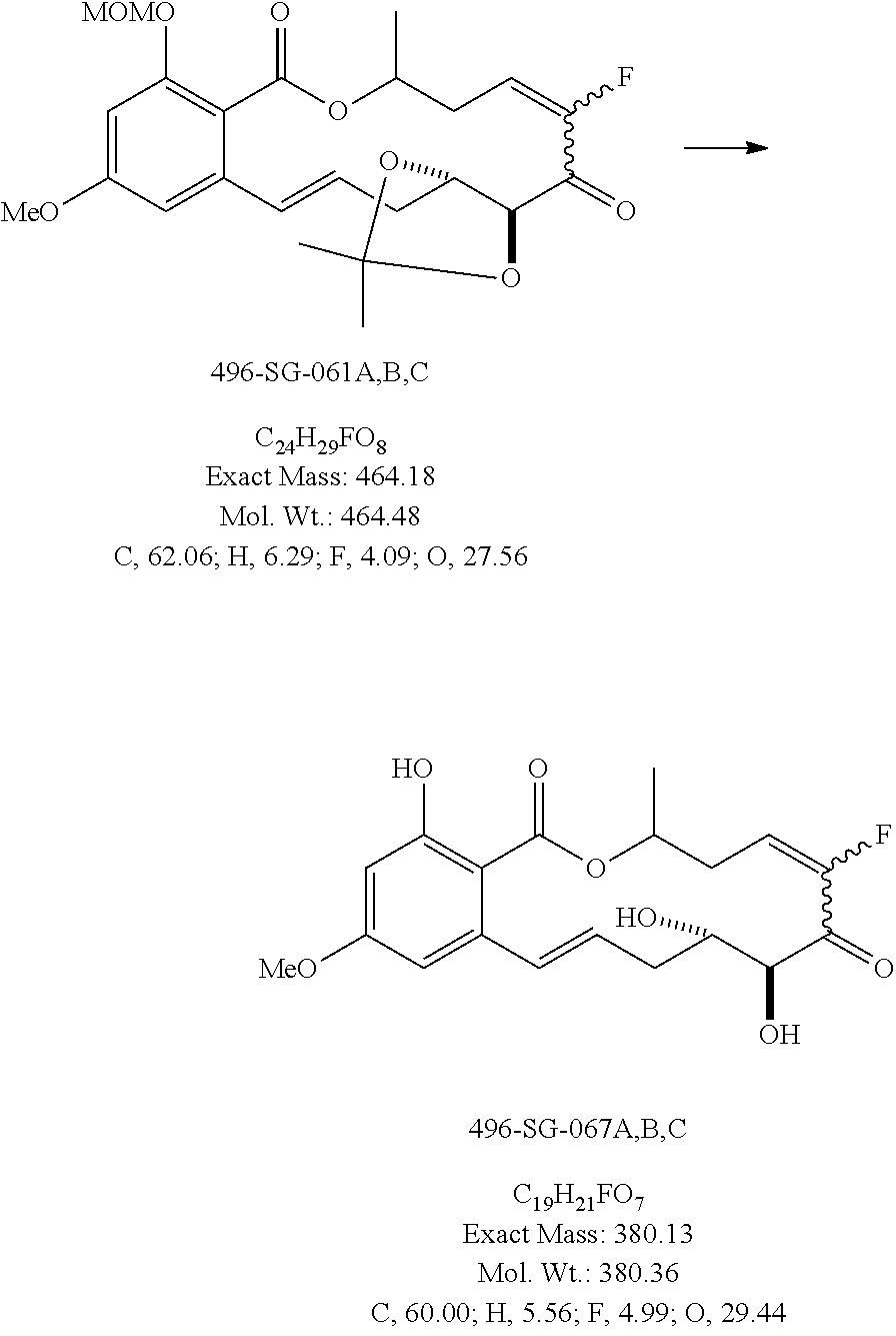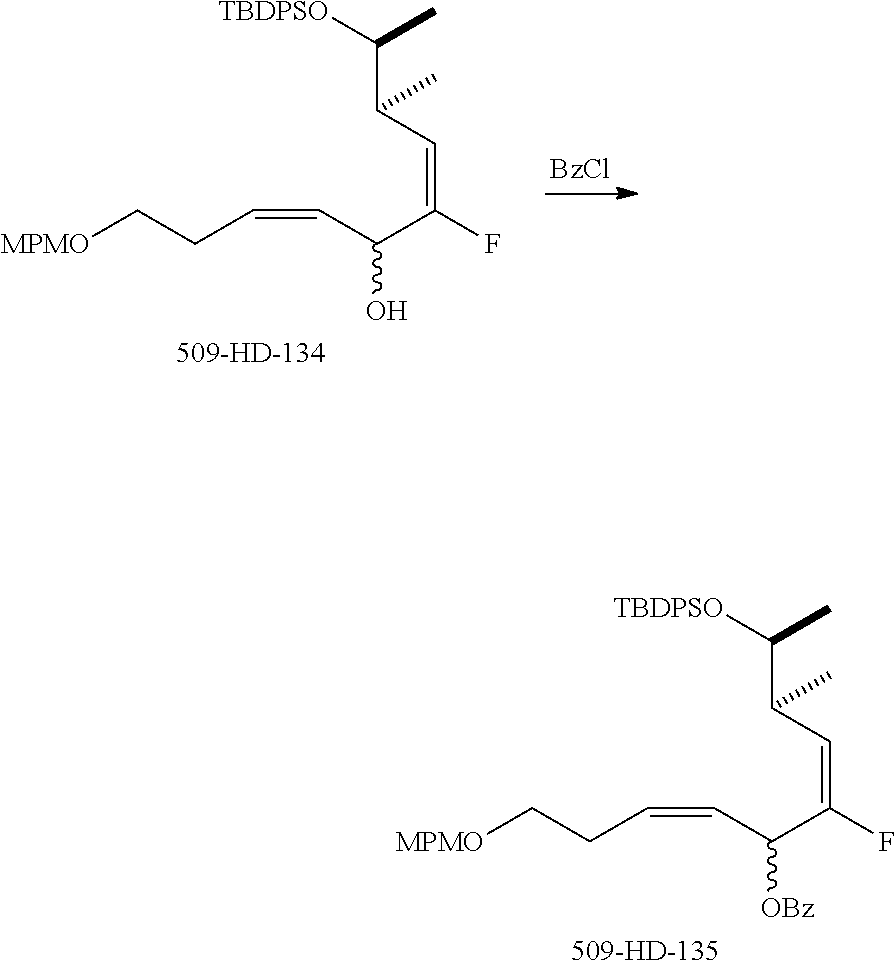 Step 4 A solution of compound 453-MS-292B (20 mg, 42 μmol) in dichloromethane (2 mL) was treated with PCC (109 mg, 0.505 mmol) in the presence of powdered 4 Å molecular sieves (109 mg). The reaction mixture was stirred vigorously for 55 minutes at room temperature. Basification with excess triethylamine, followed by chromatographic purification, gave compound 453-MS-299 (17 mg, 86%). Step 5 A solution of compound 453-MS-299 (19 mg, 0.04 mmol) in a mixture of acetonitrile (4 mL) and dichloromethane (1 mL) was treated with 48% aqueous hydrofluoric acid (1 mL). After 35 minutes the usual work up followed by chromatographic purification gave compound B2522 (9 mg, 58%) (m/z: 411.1443 measured [M+23], 411.1420 calculated). ER804018 and ER804019 (C4-F): LDA (2.0 M, 36 mL) was added to the solution of ethyl 2-fluoropropanate (7.23 g) and acetaldehyde (13.5 mL) in ether (100 mL) at −78° C. After the addition finished the reaction flask was kept in ice bath and gradually warm to room temperature. The reaction was quenched with aqueous ammonium chloride after overnight stirring. The aqueous phase was extracted with ether and the combined organic phase was dried over sodium sulfate. The solvent was stripped off and the residue was distilled in vacuo to give 541-YJ-97 (4.22 g). Chloro-t-butyldiphenylsilane was added to the mixture of 541-YJ-97 (4.22 g) and imidazole (3.5 g) in methylene chloride (50 mL) and stirred overnight. Aqueous sodium bicarbonate was added to the reaction mixture. The aqueous phase was extracted with ether and the combined organic phase was dried over sodium sulfate. The solvent was stripped off and the residue was purified with flush chromatograph (hexane/acetate 50/1) to give 541-YJ-99 (7.55 g). DIBAL-H in toluene (1.0 M, 25 ml) was added to 541-YJ-99 in toluene (85 mL) at 0° C. The reaction was quenched in one hour with methanol/water and filtrated through Celite. The residue was purified by flash chromatograph to yield 541-YJ-101 (536 mg). Dess-Martin periodinane was added to 541-YJ-101 (511 mg) in methylene chloride (15 ml) at room temperature. The mixture was diluted with ether in 40 minutes and filtrated through Celite. The filtrate was concentrated, and the residue was purified by prepTLC (hex/acetate 7/1) to give 541-Yj-105 (355 mg, 70%). Triphenylphosphine (2.08 g) was added to carbon tetrabromide (1.31 g) in methylene chloride at room temperature. After stirring for 40 minutes 541-YJ-105 was added and stirred for 2 hours. The mixture was concentrated and filtrated through silica gel (hexane/acetate 7/1) to produce 541-YJ-106 (452 mg, 89%). n-Butyllithium (2.5 M, 0.74 mL) was added to 541-YJ-106 (450 mg) in THF (10 mL) at −78° C. After one hour 541-YJ-108 was added. The reaction was kept at 0° C. for one hour and warmed to room temperature before it was quenched with aqueous ammonium chloride. The aqueous phase was extracted with ether and the combined organic phase was dried over sodium sulfate. The solvent was stripped off and the residue was purified with TLC (hexane/acetate 4/1) to 541-YJ-109 (394 mg, 54%). The suspension of Lindlar catalyst (420 mg) and 541-YJ-109 (390 mg) in hexane (8 mL) was charged with hydrogen and stirred overnight. The suspension was filtrated through Celite and rinsed with acetate. The filtrate was concentrated to give 541-YJ-111 (378 mg). Benzoyl chloride (254 mg) and DMAP (catalytic amount) was added to the solution of 541-YJ-111 (378 mg) and triethylamine (0.5 mL) in methylene chloride (7 mL) at room temperature. The mixture was kept stirring overnight and quenched with aqueous sodium bicarbonate. The aqueous phase was extracted with ether and the combined organic phase was dried over sodium sulfate. The solvent was stripped off and the residue was purified with TLC (hexane/acetate 7/1) to 541-YJ-115 (419 mg). The solution of 541-YJ-115 (419 mg) and TBAF (1.0 M, 2.2 mL) in THF (8 mL) was kept stirring overnight, and then diluted with water. The aqueous phase was extracted with ether and concentrated. The residue was purified with TLC (methylene chloride/methanol 10/1) to give 541-YJ-116 (194 mg). The solution of 541-YJ-115 (419 mg) and TBAF (1.0 M, 2.2 mL) in THF (8 mL) was kept stirring overnight, and then diluted with water. The aqueous phase was extracted with ether and concentrated. The residue was purified with TLC (methylene chloride/methanol 10/1) to give 541-YJ-116′ (21 mg). 541-YJ-116 (21 mg) was added to the reflux of 2-chloro-1-methylpyridium iodide (32 mg) and tributylamine (23 mg) in methylene chloride (4 mL). After 2 hours reflux the mixture was stirred overnight. The mixture was diluted with ether and washed with HCl (1.0 N) and water. The residue was purified with TLC (hexane/acetate 1/1) to give 541-YJ-118-1 (7.7 mg) and 541-YJ-118-2 (8.4 mg). PCC was added to 541-YJ-118-1 (7.7 mg) and MS 4 A suspension in methylene chloride (2 mL) at room temperature. The mixture was stirred for 3 hours and filtrated through silica gel. The silica gel was eluted with acetate and concentrated to give 541-YJ-119 (3.3 mg). PCC was added to 541-YJ-118-2 (8.4 mg) and MS 4 A suspension in methylene chloride (2 mL) at room temperature. The mixture was stirred for 3 hours and filtrated through silica gel. The silica gel was eluted with acetate and concentrated to give 541-YJ-120 (3.0 mg). Hydrofluoric acid (49%, 1 mL) was added to 541-YJ-119 (8.0 mg) in acetonitrile (3 mL) and stirred for 15 minutes. The mixture was diluted with water and extracted with methylene chloride. The organic phase was concentrated and purified with a short silica gel pad to produce 541-YJ-126 (5.1 mg, ER-804018). Hydrofluoric acid (49%, 1 mL) was added to 541-YJ-120 (6.0 mg) in acetonitrile (3 mL) and stirred for 15 minutes. The mixture was diluted with water and extracted with methylene chloride. The organic phase was concentrated and purified with a short silica gel pad to produce 541-YJ-126 (3.1 mg, ER-804019). Preparation of ER804142 and ER804143, C4-