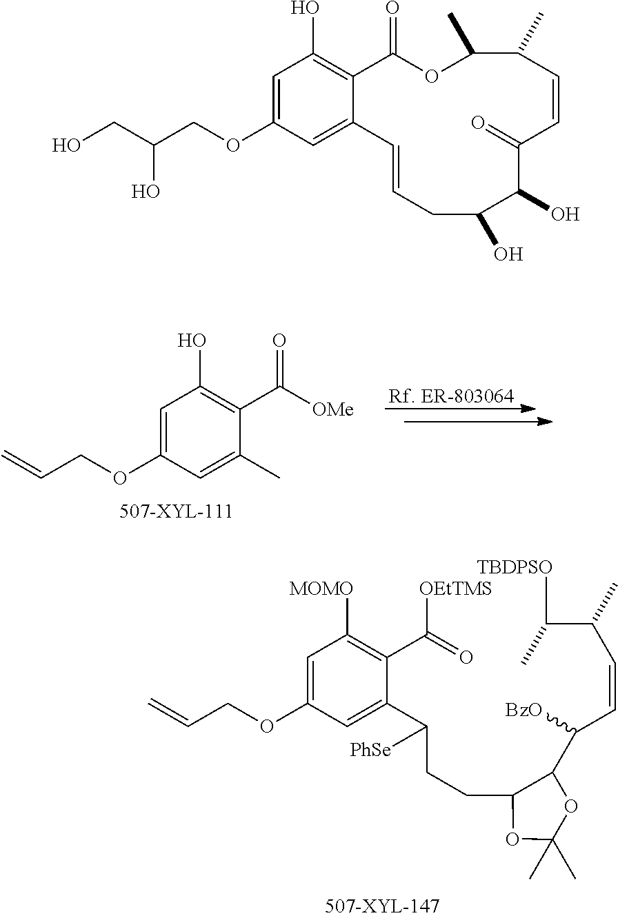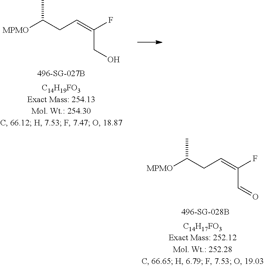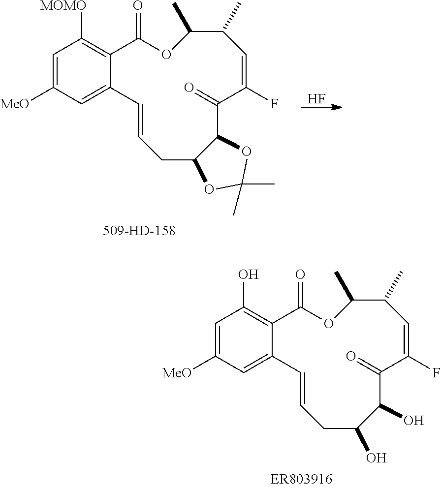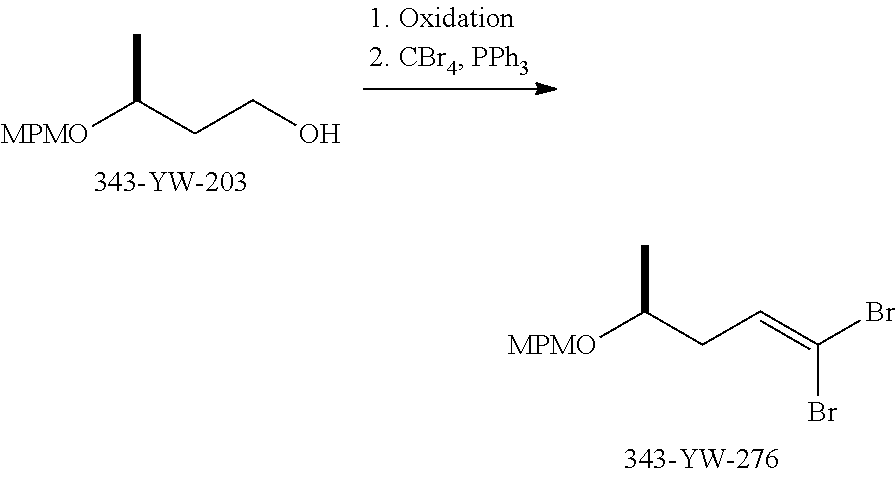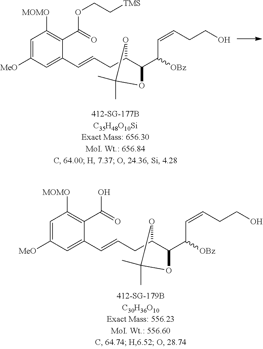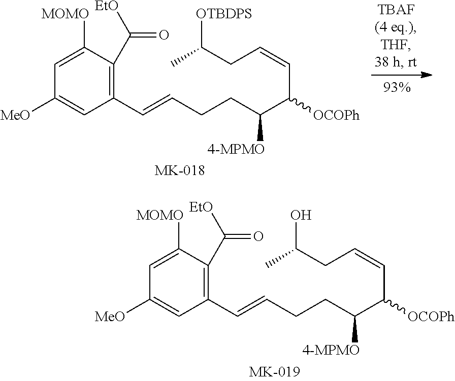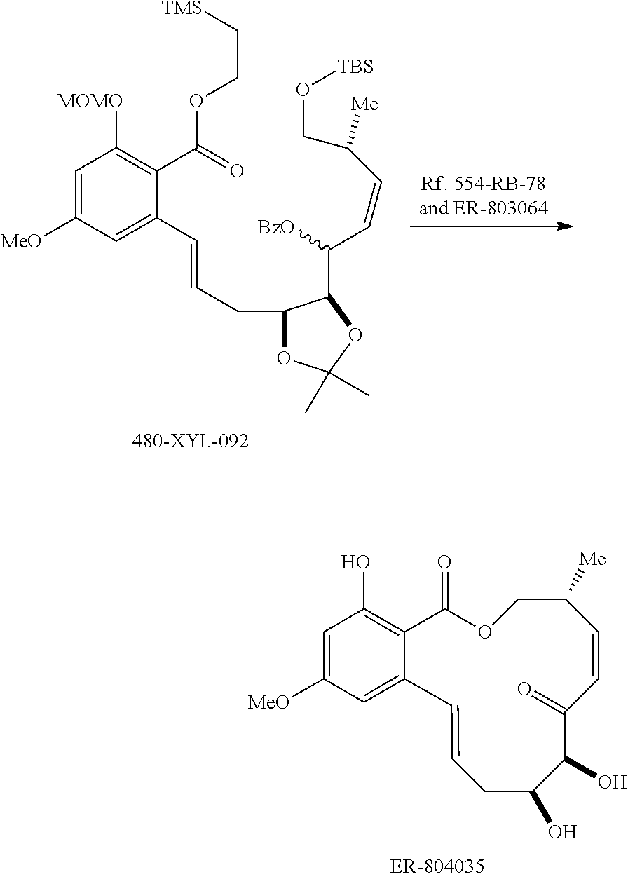 Step 4 A solution of compound 453-MS-292B (20 mg, 42 μmol) in dichloromethane (2 mL) was treated with PCC (109 mg, 0.505 mmol) in the presence of powdered 4 Å molecular sieves (109 mg). The reaction mixture was stirred vigorously for 55 minutes at room temperature. Basification with excess triethylamine, followed by chromatographic purification, gave compound 453-MS-299 (17 mg, 86%). Step 5 A solution of compound 453-MS-299 (19 mg, 0.04 mmol) in a mixture of acetonitrile (4 mL) and dichloromethane (1 mL) was treated with 48% aqueous hydrofluoric acid (1 mL). After 35 minutes the usual work up followed by chromatographic purification gave compound B2522 (9 mg, 58%) (m/z: 411.1443 measured [M+23], 411.1420 calculated). ER804018 and ER804019 (C4-F): LDA (2.0 M, 36 mL) was added to the solution of ethyl 2-fluoropropanate (7.23 g) and acetaldehyde (13.5 mL) in ether (100 mL) at −78° C. After the addition finished the reaction flask was kept in ice bath and gradually warm to room temperature. The reaction was quenched with aqueous ammonium chloride after overnight stirring. The aqueous phase was extracted with ether and the combined organic phase was dried over sodium sulfate. The solvent was stripped off and the residue was distilled in vacuo to give 541-YJ-97 (4.22 g). Chloro-t-butyldiphenylsilane was added to the mixture of 541-YJ-97 (4.22 g) and imidazole (3.5 g) in methylene chloride (50 mL) and stirred overnight. Aqueous sodium bicarbonate was added to the reaction mixture. The aqueous phase was extracted with ether and the combined organic phase was dried over sodium sulfate. The solvent was stripped off and the residue was purified with flush chromatograph (hexane/acetate 50/1) to give 541-YJ-99 (7.55 g). DIBAL-H in toluene (1.0 M, 25 ml) was added to 541-YJ-99 in toluene (85 mL) at 0° C. The reaction was quenched in one hour with methanol/water and filtrated through Celite. The residue was purified by flash chromatograph to yield 541-YJ-101 (536 mg). Dess-Martin periodinane was added to 541-YJ-101 (511 mg) in methylene chloride (15 ml) at room temperature. The mixture was diluted with ether in 40 minutes and filtrated through Celite. The filtrate was concentrated, and the residue was purified by prepTLC (hex/acetate 7/1) to give 541-Yj-105 (355 mg, 70%). Triphenylphosphine (2.08 g) was added to carbon tetrabromide (1.31 g) in methylene chloride at room temperature. After stirring for 40 minutes 541-YJ-105 was added and stirred for 2 hours. The mixture was concentrated and filtrated through silica gel (hexane/acetate 7/1) to produce 541-YJ-106 (452 mg, 89%). n-Butyllithium (2.5 M, 0.74 mL) was added to 541-YJ-106 (450 mg) in THF (10 mL) at −78° C. After one hour 541-YJ-108 was added. The reaction was kept at 0° C. for one hour and warmed to room temperature before it was quenched with aqueous ammonium chloride. The aqueous phase was extracted with ether and the combined organic phase was dried over sodium sulfate. The solvent was stripped off and the residue was purified with TLC (hexane/acetate 4/1) to 541-YJ-109 (394 mg, 54%). The suspension of Lindlar catalyst (420 mg) and 541-YJ-109 (390 mg) in hexane (8 mL) was charged with hydrogen and stirred overnight. The suspension was filtrated through Celite and rinsed with acetate. The filtrate was concentrated to give 541-YJ-111 (378 mg). Benzoyl chloride (254 mg) and DMAP (catalytic amount) was added to the solution of 541-YJ-111 (378 mg) and triethylamine (0.5 mL) in methylene chloride (7 mL) at room temperature. The mixture was kept stirring overnight and quenched with aqueous sodium bicarbonate. The aqueous phase was extracted with ether and the combined organic phase was dried over sodium sulfate. The solvent was stripped off and the residue was purified with TLC (hexane/acetate 7/1) to 541-YJ-115 (419 mg). The solution of 541-YJ-115 (419 mg) and TBAF (1.0 M, 2.2 mL) in THF (8 mL) was kept stirring overnight, and then diluted with water. The aqueous phase was extracted with ether and concentrated. The residue was purified with TLC (methylene chloride/methanol 10/1) to give 541-YJ-116 (194 mg). The solution of 541-YJ-115 (419 mg) and TBAF (1.0 M, 2.2 mL) in THF (8 mL) was kept stirring overnight, and then diluted with water. The aqueous phase was extracted with ether and concentrated. The residue was purified with TLC (methylene chloride/methanol 10/1) to give 541-YJ-116′ (21 mg). 541-YJ-116 (21 mg) was added to the reflux of 2-chloro-1-methylpyridium iodide (32 mg) and tributylamine (23 mg) in methylene chloride (4 mL). After 2 hours reflux the mixture was stirred overnight. The mixture was diluted with ether and washed with HCl (1.0 N) and water. The residue was purified with TLC (hexane/acetate 1/1) to give 541-YJ-118-1 (7.7 mg) and 541-YJ-118-2 (8.4 mg). PCC was added to 541-YJ-118-1 (7.7 mg) and MS 4 A suspension in methylene chloride (2 mL) at room temperature. The mixture was stirred for 3 hours and filtrated through silica gel. The silica gel was eluted with acetate and concentrated to give 541-YJ-119 (3.3 mg). PCC was added to 541-YJ-118-2 (8.4 mg) and MS 4 A suspension in methylene chloride (2 mL) at room temperature. The mixture was stirred for 3 hours and filtrated through silica gel. The silica gel was eluted with acetate and concentrated to give 541-YJ-120 (3.0 mg). Hydrofluoric acid (49%, 1 mL) was added to 541-YJ-119 (8.0 mg) in acetonitrile (3 mL) and stirred for 15 minutes. The mixture was diluted with water and extracted with methylene chloride. The organic phase was concentrated and purified with a short silica gel pad to produce 541-YJ-126 (5.1 mg, ER-804018). Hydrofluoric acid (49%, 1 mL) was added to 541-YJ-120 (6.0 mg) in acetonitrile (3 mL) and stirred for 15 minutes. The mixture was diluted with water and extracted with methylene chloride. The organic phase was concentrated and purified with a short silica gel pad to produce 541-YJ-126 (3.1 mg, ER-804019). Preparation of ER804142 and ER804143, C4-
