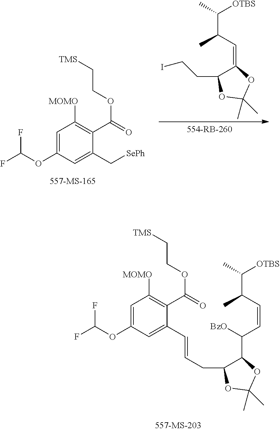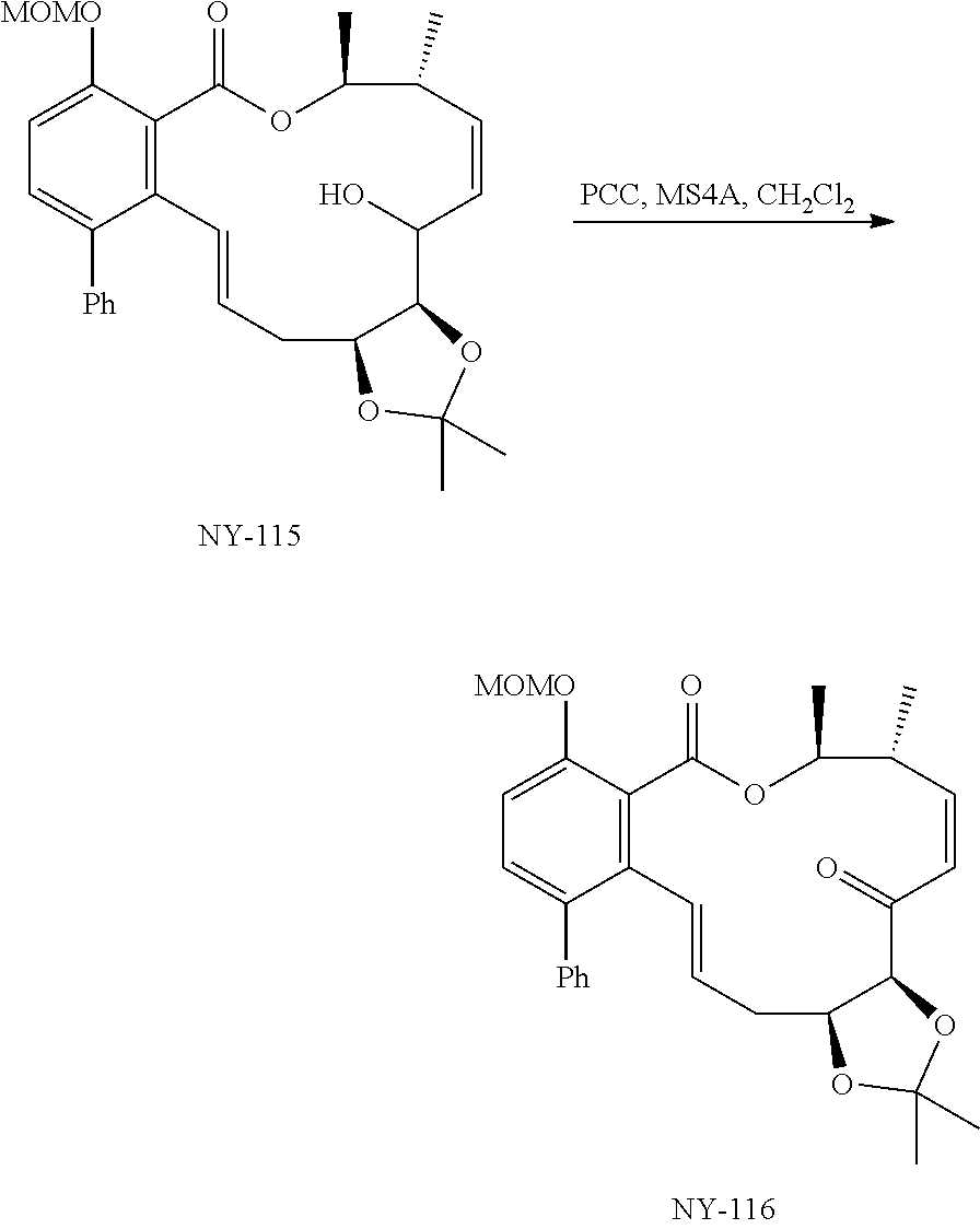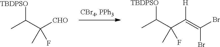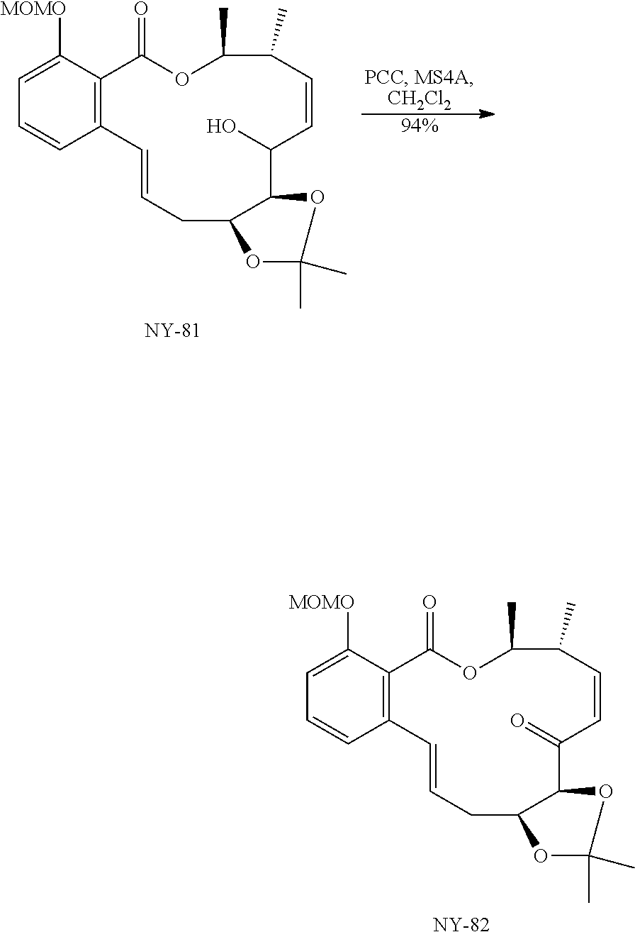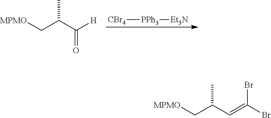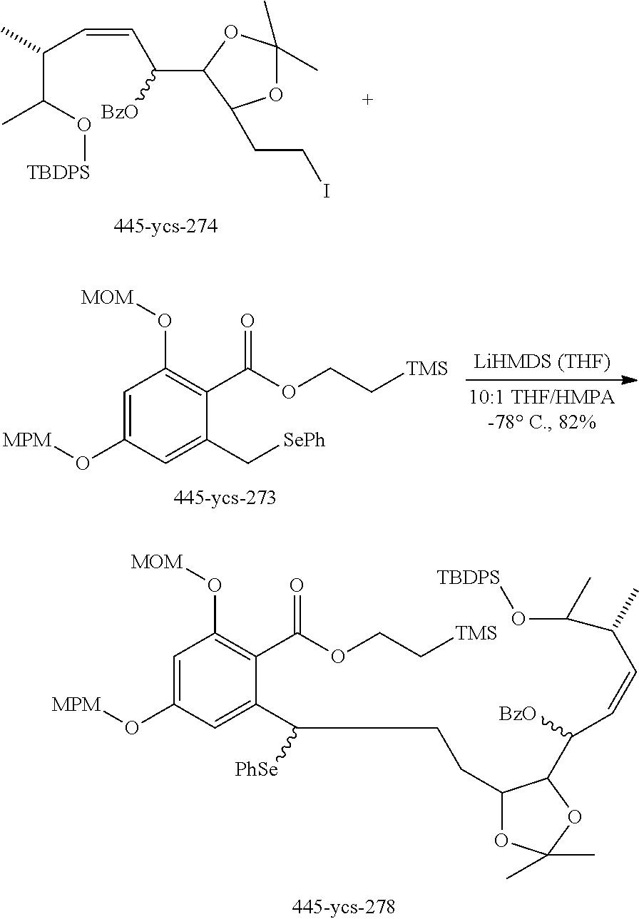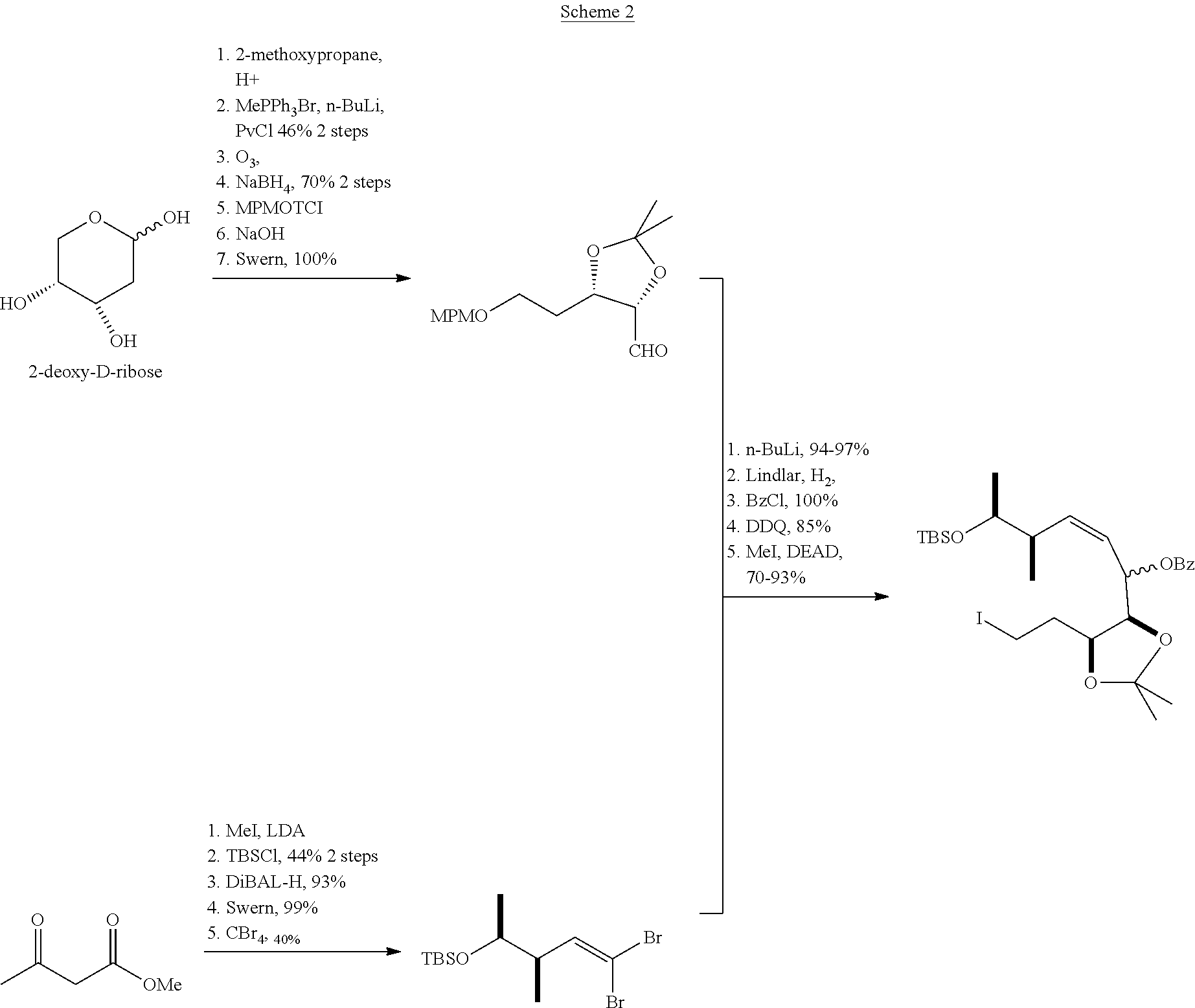 Step 4 A solution of compound 453-MS-292B (20 mg, 42 μmol) in dichloromethane (2 mL) was treated with PCC (109 mg, 0.505 mmol) in the presence of powdered 4 Å molecular sieves (109 mg). The reaction mixture was stirred vigorously for 55 minutes at room temperature. Basification with excess triethylamine, followed by chromatographic purification, gave compound 453-MS-299 (17 mg, 86%). Step 5 A solution of compound 453-MS-299 (19 mg, 0.04 mmol) in a mixture of acetonitrile (4 mL) and dichloromethane (1 mL) was treated with 48% aqueous hydrofluoric acid (1 mL). After 35 minutes the usual work up followed by chromatographic purification gave compound B2522 (9 mg, 58%) (m/z: 411.1443 measured [M+23], 411.1420 calculated). ER804018 and ER804019 (C4-F): LDA (2.0 M, 36 mL) was added to the solution of ethyl 2-fluoropropanate (7.23 g) and acetaldehyde (13.5 mL) in ether (100 mL) at −78° C. After the addition finished the reaction flask was kept in ice bath and gradually warm to room temperature. The reaction was quenched with aqueous ammonium chloride after overnight stirring. The aqueous phase was extracted with ether and the combined organic phase was dried over sodium sulfate. The solvent was stripped off and the residue was distilled in vacuo to give 541-YJ-97 (4.22 g). Chloro-t-butyldiphenylsilane was added to the mixture of 541-YJ-97 (4.22 g) and imidazole (3.5 g) in methylene chloride (50 mL) and stirred overnight. Aqueous sodium bicarbonate was added to the reaction mixture. The aqueous phase was extracted with ether and the combined organic phase was dried over sodium sulfate. The solvent was stripped off and the residue was purified with flush chromatograph (hexane/acetate 50/1) to give 541-YJ-99 (7.55 g). DIBAL-H in toluene (1.0 M, 25 ml) was added to 541-YJ-99 in toluene (85 mL) at 0° C. The reaction was quenched in one hour with methanol/water and filtrated through Celite. The residue was purified by flash chromatograph to yield 541-YJ-101 (536 mg). Dess-Martin periodinane was added to 541-YJ-101 (511 mg) in methylene chloride (15 ml) at room temperature. The mixture was diluted with ether in 40 minutes and filtrated through Celite. The filtrate was concentrated, and the residue was purified by prepTLC (hex/acetate 7/1) to give 541-Yj-105 (355 mg, 70%). Triphenylphosphine (2.08 g) was added to carbon tetrabromide (1.31 g) in methylene chloride at room temperature. After stirring for 40 minutes 541-YJ-105 was added and stirred for 2 hours. The mixture was concentrated and filtrated through silica gel (hexane/acetate 7/1) to produce 541-YJ-106 (452 mg, 89%). n-Butyllithium (2.5 M, 0.74 mL) was added to 541-YJ-106 (450 mg) in THF (10 mL) at −78° C. After one hour 541-YJ-108 was added. The reaction was kept at 0° C. for one hour and warmed to room temperature before it was quenched with aqueous ammonium chloride. The aqueous phase was extracted with ether and the combined organic phase was dried over sodium sulfate. The solvent was stripped off and the residue was purified with TLC (hexane/acetate 4/1) to 541-YJ-109 (394 mg, 54%). The suspension of Lindlar catalyst (420 mg) and 541-YJ-109 (390 mg) in hexane (8 mL) was charged with hydrogen and stirred overnight. The suspension was filtrated through Celite and rinsed with acetate. The filtrate was concentrated to give 541-YJ-111 (378 mg). Benzoyl chloride (254 mg) and DMAP (catalytic amount) was added to the solution of 541-YJ-111 (378 mg) and triethylamine (0.5 mL) in methylene chloride (7 mL) at room temperature. The mixture was kept stirring overnight and quenched with aqueous sodium bicarbonate. The aqueous phase was extracted with ether and the combined organic phase was dried over sodium sulfate. The solvent was stripped off and the residue was purified with TLC (hexane/acetate 7/1) to 541-YJ-115 (419 mg). The solution of 541-YJ-115 (419 mg) and TBAF (1.0 M, 2.2 mL) in THF (8 mL) was kept stirring overnight, and then diluted with water. The aqueous phase was extracted with ether and concentrated. The residue was purified with TLC (methylene chloride/methanol 10/1) to give 541-YJ-116 (194 mg). The solution of 541-YJ-115 (419 mg) and TBAF (1.0 M, 2.2 mL) in THF (8 mL) was kept stirring overnight, and then diluted with water. The aqueous phase was extracted with ether and concentrated. The residue was purified with TLC (methylene chloride/methanol 10/1) to give 541-YJ-116′ (21 mg). 541-YJ-116 (21 mg) was added to the reflux of 2-chloro-1-methylpyridium iodide (32 mg) and tributylamine (23 mg) in methylene chloride (4 mL). After 2 hours reflux the mixture was stirred overnight. The mixture was diluted with ether and washed with HCl (1.0 N) and water. The residue was purified with TLC (hexane/acetate 1/1) to give 541-YJ-118-1 (7.7 mg) and 541-YJ-118-2 (8.4 mg). PCC was added to 541-YJ-118-1 (7.7 mg) and MS 4 A suspension in methylene chloride (2 mL) at room temperature. The mixture was stirred for 3 hours and filtrated through silica gel. The silica gel was eluted with acetate and concentrated to give 541-YJ-119 (3.3 mg). PCC was added to 541-YJ-118-2 (8.4 mg) and MS 4 A suspension in methylene chloride (2 mL) at room temperature. The mixture was stirred for 3 hours and filtrated through silica gel. The silica gel was eluted with acetate and concentrated to give 541-YJ-120 (3.0 mg). Hydrofluoric acid (49%, 1 mL) was added to 541-YJ-119 (8.0 mg) in acetonitrile (3 mL) and stirred for 15 minutes. The mixture was diluted with water and extracted with methylene chloride. The organic phase was concentrated and purified with a short silica gel pad to produce 541-YJ-126 (5.1 mg, ER-804018). Hydrofluoric acid (49%, 1 mL) was added to 541-YJ-120 (6.0 mg) in acetonitrile (3 mL) and stirred for 15 minutes. The mixture was diluted with water and extracted with methylene chloride. The organic phase was concentrated and purified with a short silica gel pad to produce 541-YJ-126 (3.1 mg, ER-804019). Preparation of ER804142 and ER804143, C4-