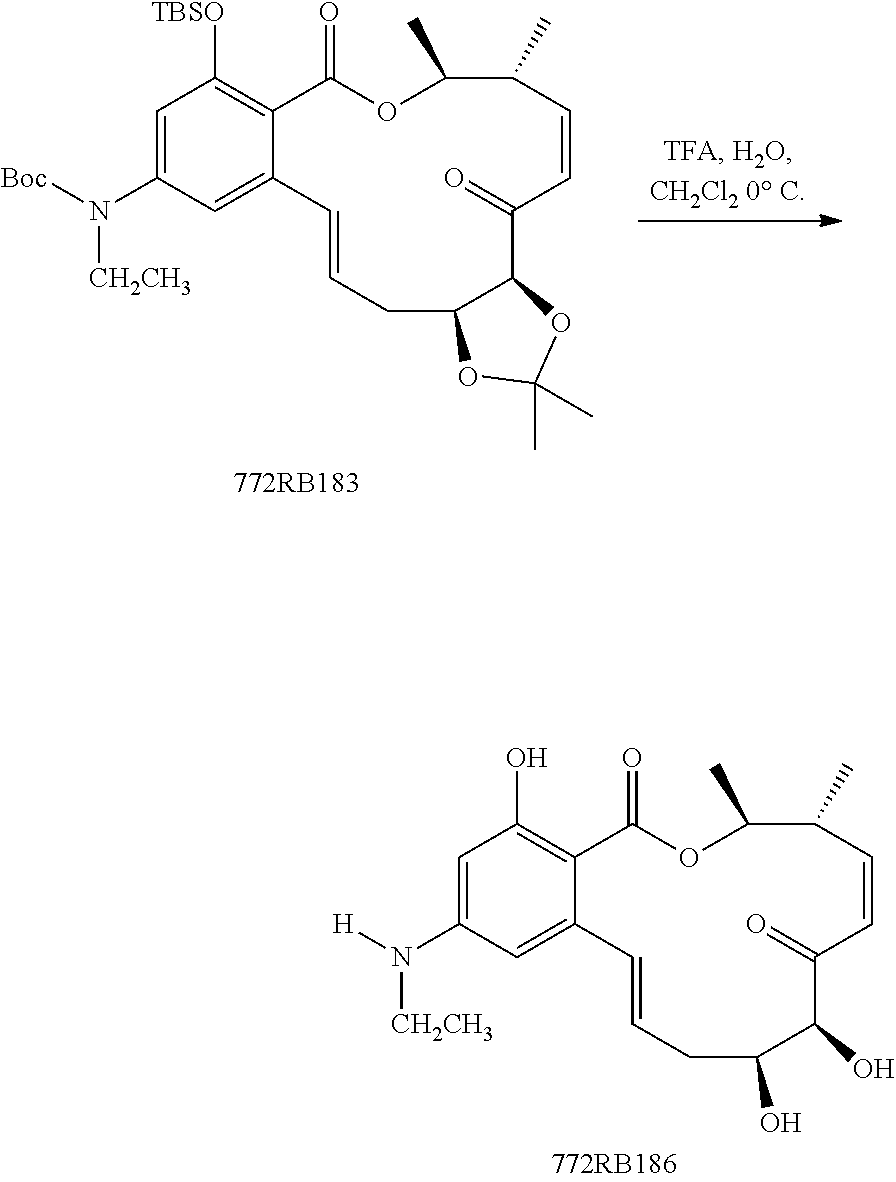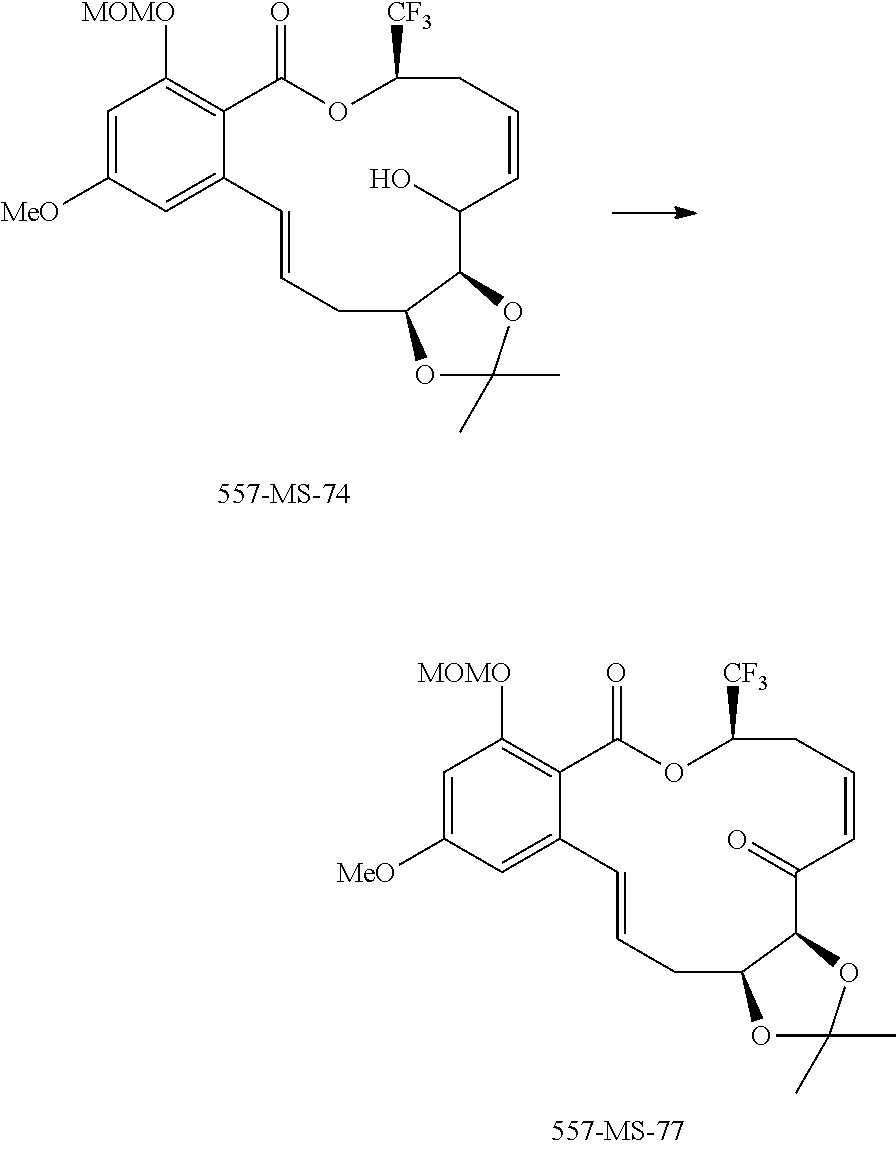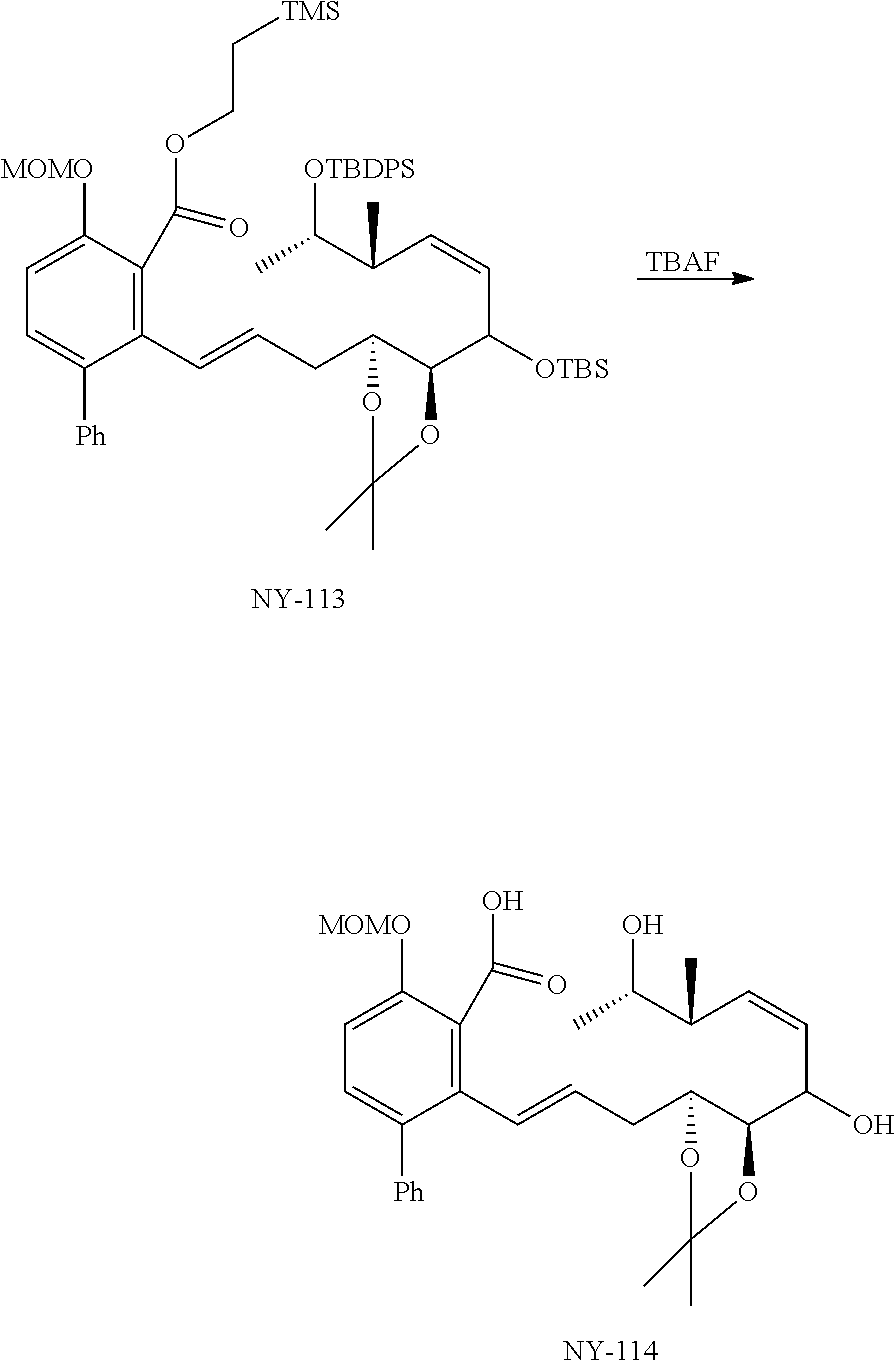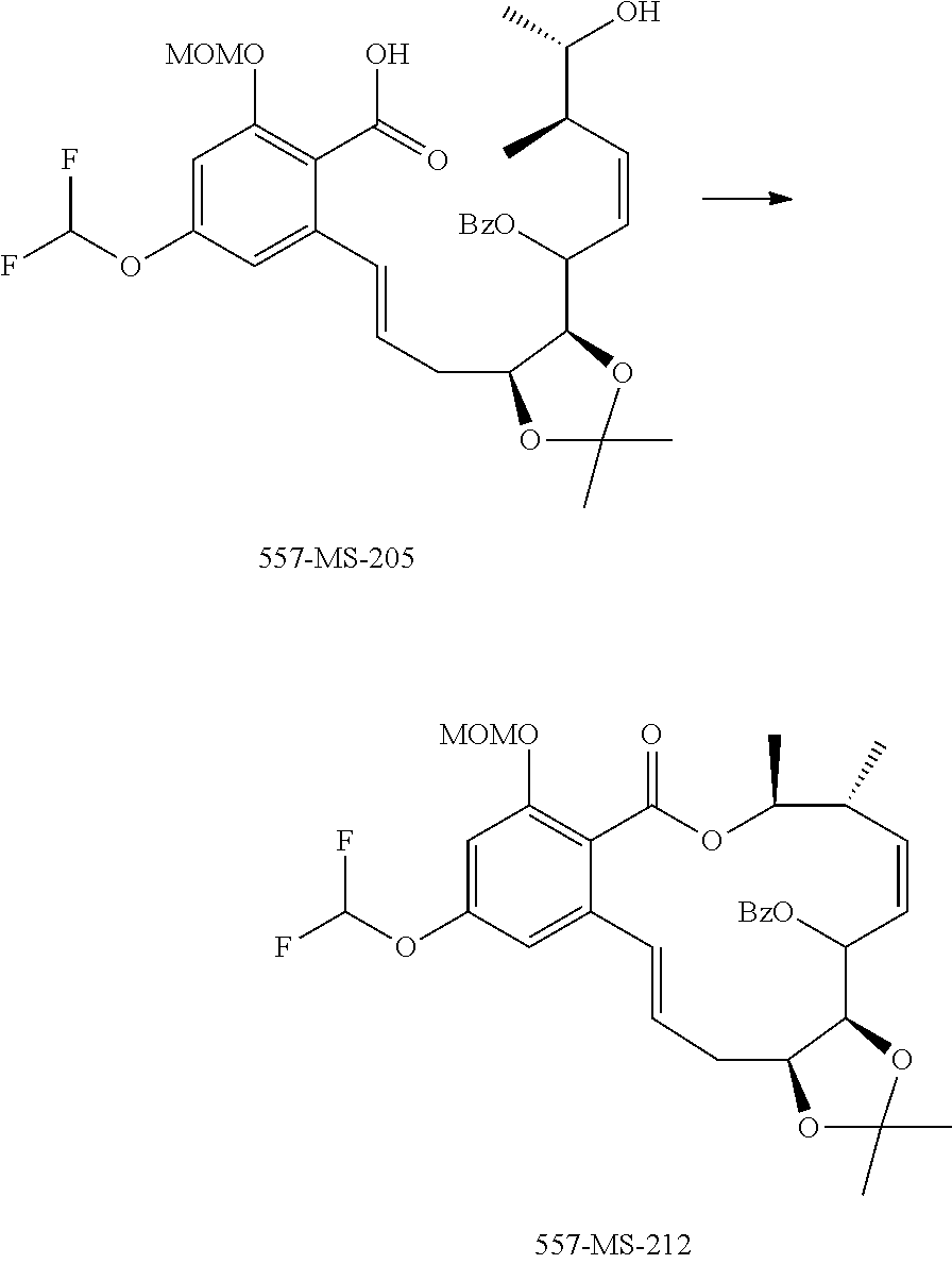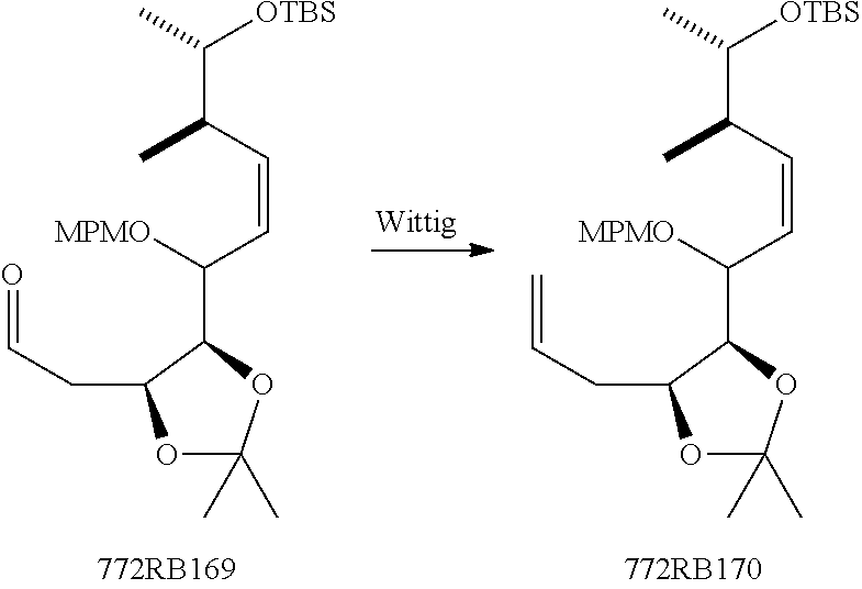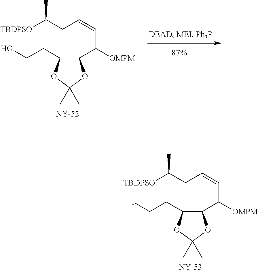 Step 4 A solution of compound 453-MS-292B (20 mg, 42 μmol) in dichloromethane (2 mL) was treated with PCC (109 mg, 0.505 mmol) in the presence of powdered 4 Å molecular sieves (109 mg). The reaction mixture was stirred vigorously for 55 minutes at room temperature. Basification with excess triethylamine, followed by chromatographic purification, gave compound 453-MS-299 (17 mg, 86%). Step 5 A solution of compound 453-MS-299 (19 mg, 0.04 mmol) in a mixture of acetonitrile (4 mL) and dichloromethane (1 mL) was treated with 48% aqueous hydrofluoric acid (1 mL). After 35 minutes the usual work up followed by chromatographic purification gave compound B2522 (9 mg, 58%) (m/z: 411.1443 measured [M+23], 411.1420 calculated). ER804018 and ER804019 (C4-F): LDA (2.0 M, 36 mL) was added to the solution of ethyl 2-fluoropropanate (7.23 g) and acetaldehyde (13.5 mL) in ether (100 mL) at −78° C. After the addition finished the reaction flask was kept in ice bath and gradually warm to room temperature. The reaction was quenched with aqueous ammonium chloride after overnight stirring. The aqueous phase was extracted with ether and the combined organic phase was dried over sodium sulfate. The solvent was stripped off and the residue was distilled in vacuo to give 541-YJ-97 (4.22 g). Chloro-t-butyldiphenylsilane was added to the mixture of 541-YJ-97 (4.22 g) and imidazole (3.5 g) in methylene chloride (50 mL) and stirred overnight. Aqueous sodium bicarbonate was added to the reaction mixture. The aqueous phase was extracted with ether and the combined organic phase was dried over sodium sulfate. The solvent was stripped off and the residue was purified with flush chromatograph (hexane/acetate 50/1) to give 541-YJ-99 (7.55 g). DIBAL-H in toluene (1.0 M, 25 ml) was added to 541-YJ-99 in toluene (85 mL) at 0° C. The reaction was quenched in one hour with methanol/water and filtrated through Celite. The residue was purified by flash chromatograph to yield 541-YJ-101 (536 mg). Dess-Martin periodinane was added to 541-YJ-101 (511 mg) in methylene chloride (15 ml) at room temperature. The mixture was diluted with ether in 40 minutes and filtrated through Celite. The filtrate was concentrated, and the residue was purified by prepTLC (hex/acetate 7/1) to give 541-Yj-105 (355 mg, 70%). Triphenylphosphine (2.08 g) was added to carbon tetrabromide (1.31 g) in methylene chloride at room temperature. After stirring for 40 minutes 541-YJ-105 was added and stirred for 2 hours. The mixture was concentrated and filtrated through silica gel (hexane/acetate 7/1) to produce 541-YJ-106 (452 mg, 89%). n-Butyllithium (2.5 M, 0.74 mL) was added to 541-YJ-106 (450 mg) in THF (10 mL) at −78° C. After one hour 541-YJ-108 was added. The reaction was kept at 0° C. for one hour and warmed to room temperature before it was quenched with aqueous ammonium chloride. The aqueous phase was extracted with ether and the combined organic phase was dried over sodium sulfate. The solvent was stripped off and the residue was purified with TLC (hexane/acetate 4/1) to 541-YJ-109 (394 mg, 54%). The suspension of Lindlar catalyst (420 mg) and 541-YJ-109 (390 mg) in hexane (8 mL) was charged with hydrogen and stirred overnight. The suspension was filtrated through Celite and rinsed with acetate. The filtrate was concentrated to give 541-YJ-111 (378 mg). Benzoyl chloride (254 mg) and DMAP (catalytic amount) was added to the solution of 541-YJ-111 (378 mg) and triethylamine (0.5 mL) in methylene chloride (7 mL) at room temperature. The mixture was kept stirring overnight and quenched with aqueous sodium bicarbonate. The aqueous phase was extracted with ether and the combined organic phase was dried over sodium sulfate. The solvent was stripped off and the residue was purified with TLC (hexane/acetate 7/1) to 541-YJ-115 (419 mg). The solution of 541-YJ-115 (419 mg) and TBAF (1.0 M, 2.2 mL) in THF (8 mL) was kept stirring overnight, and then diluted with water. The aqueous phase was extracted with ether and concentrated. The residue was purified with TLC (methylene chloride/methanol 10/1) to give 541-YJ-116 (194 mg). The solution of 541-YJ-115 (419 mg) and TBAF (1.0 M, 2.2 mL) in THF (8 mL) was kept stirring overnight, and then diluted with water. The aqueous phase was extracted with ether and concentrated. The residue was purified with TLC (methylene chloride/methanol 10/1) to give 541-YJ-116′ (21 mg). 541-YJ-116 (21 mg) was added to the reflux of 2-chloro-1-methylpyridium iodide (32 mg) and tributylamine (23 mg) in methylene chloride (4 mL). After 2 hours reflux the mixture was stirred overnight. The mixture was diluted with ether and washed with HCl (1.0 N) and water. The residue was purified with TLC (hexane/acetate 1/1) to give 541-YJ-118-1 (7.7 mg) and 541-YJ-118-2 (8.4 mg). PCC was added to 541-YJ-118-1 (7.7 mg) and MS 4 A suspension in methylene chloride (2 mL) at room temperature. The mixture was stirred for 3 hours and filtrated through silica gel. The silica gel was eluted with acetate and concentrated to give 541-YJ-119 (3.3 mg). PCC was added to 541-YJ-118-2 (8.4 mg) and MS 4 A suspension in methylene chloride (2 mL) at room temperature. The mixture was stirred for 3 hours and filtrated through silica gel. The silica gel was eluted with acetate and concentrated to give 541-YJ-120 (3.0 mg). Hydrofluoric acid (49%, 1 mL) was added to 541-YJ-119 (8.0 mg) in acetonitrile (3 mL) and stirred for 15 minutes. The mixture was diluted with water and extracted with methylene chloride. The organic phase was concentrated and purified with a short silica gel pad to produce 541-YJ-126 (5.1 mg, ER-804018). Hydrofluoric acid (49%, 1 mL) was added to 541-YJ-120 (6.0 mg) in acetonitrile (3 mL) and stirred for 15 minutes. The mixture was diluted with water and extracted with methylene chloride. The organic phase was concentrated and purified with a short silica gel pad to produce 541-YJ-126 (3.1 mg, ER-804019). Preparation of ER804142 and ER804143, C4-