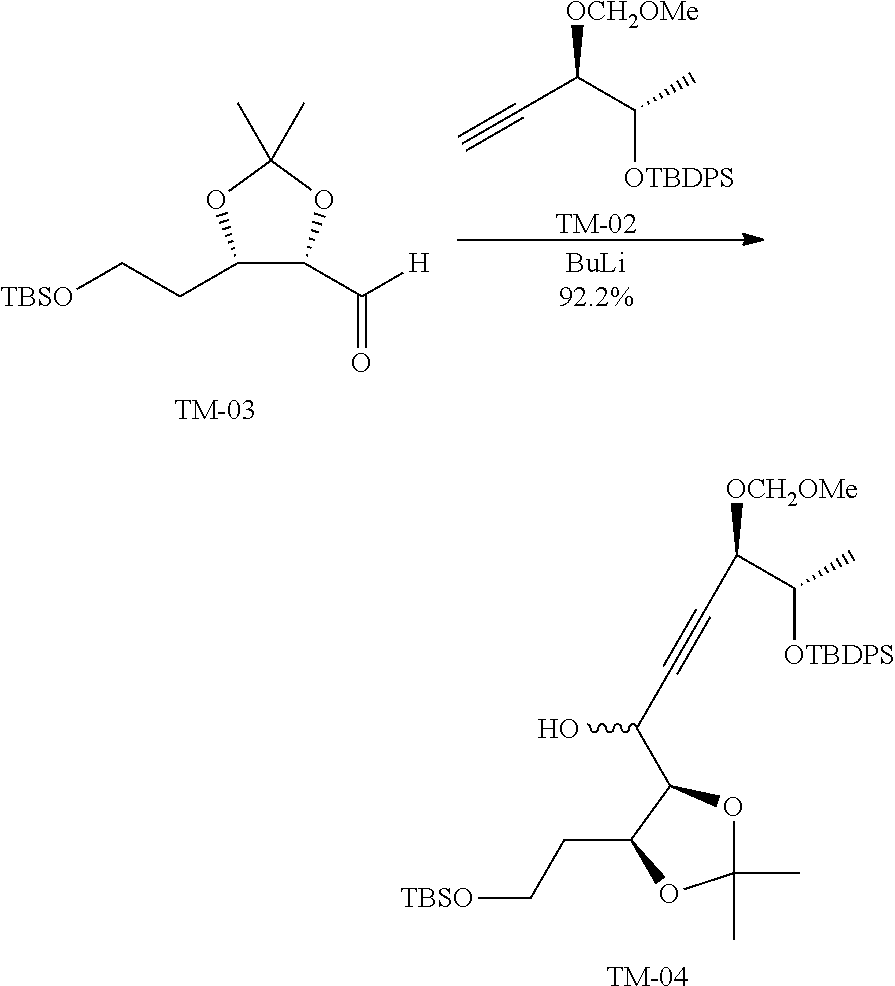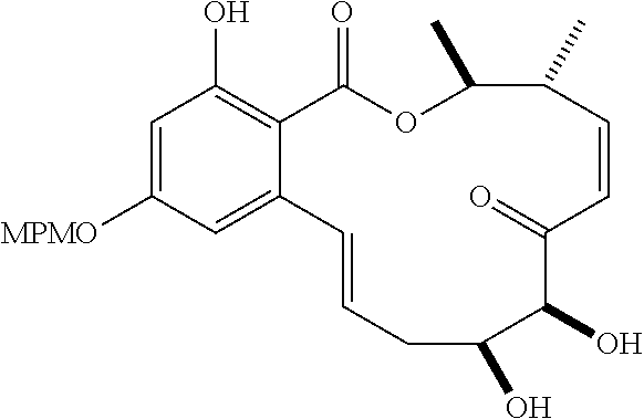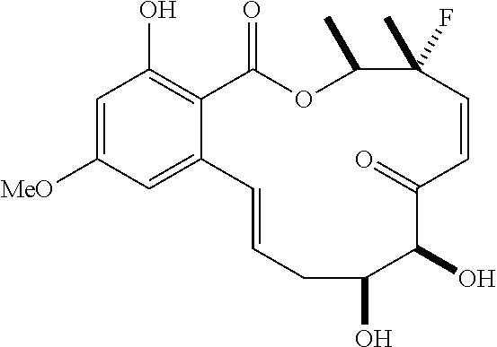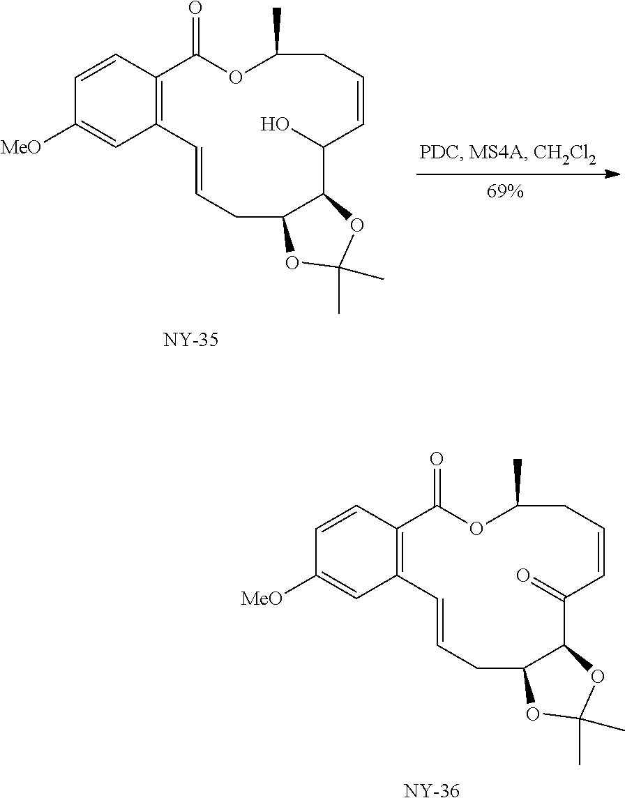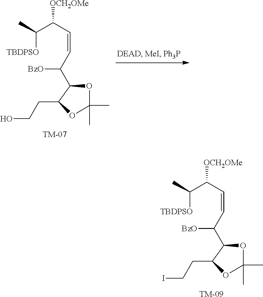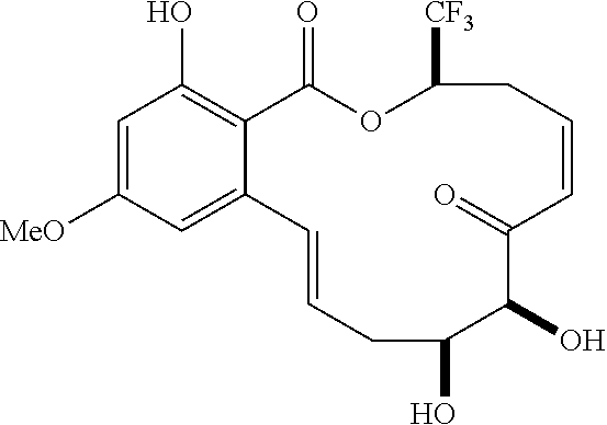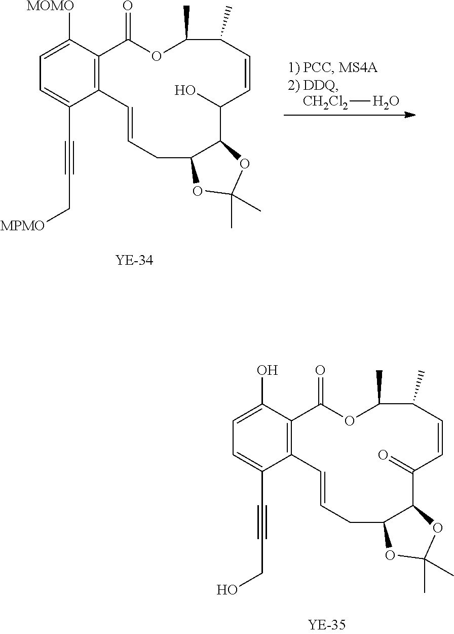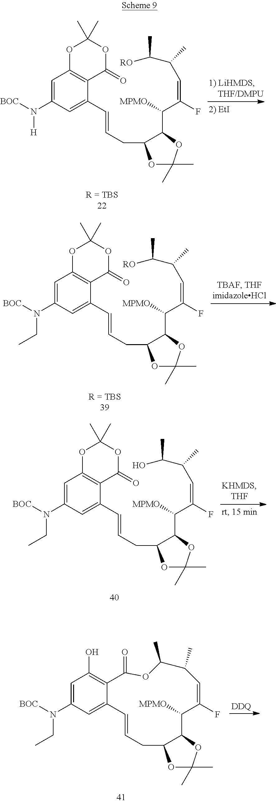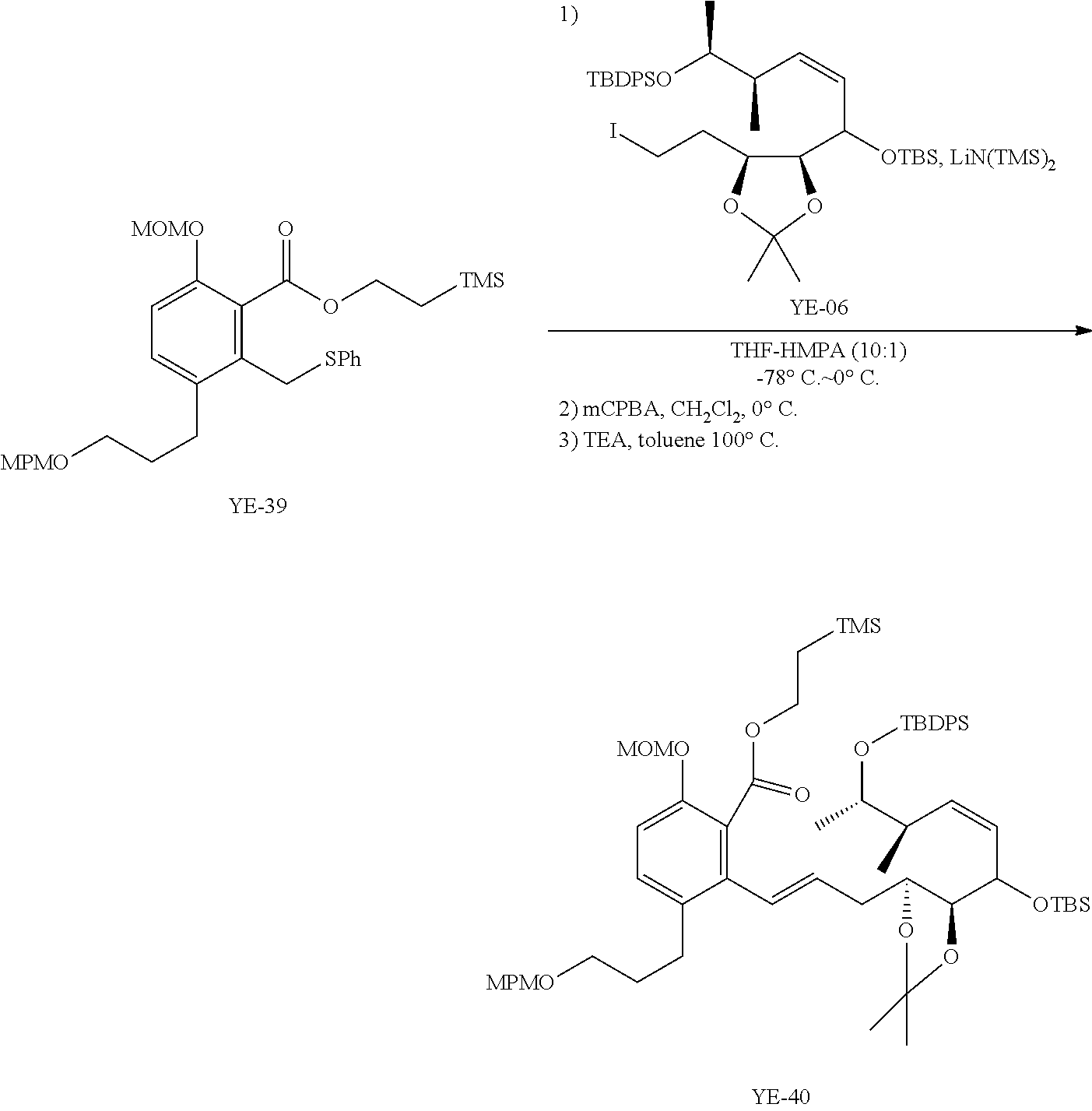 Step 4 A solution of compound 453-MS-292B (20 mg, 42 μmol) in dichloromethane (2 mL) was treated with PCC (109 mg, 0.505 mmol) in the presence of powdered 4 Å molecular sieves (109 mg). The reaction mixture was stirred vigorously for 55 minutes at room temperature. Basification with excess triethylamine, followed by chromatographic purification, gave compound 453-MS-299 (17 mg, 86%). Step 5 A solution of compound 453-MS-299 (19 mg, 0.04 mmol) in a mixture of acetonitrile (4 mL) and dichloromethane (1 mL) was treated with 48% aqueous hydrofluoric acid (1 mL). After 35 minutes the usual work up followed by chromatographic purification gave compound B2522 (9 mg, 58%) (m/z: 411.1443 measured [M+23], 411.1420 calculated). ER804018 and ER804019 (C4-F): LDA (2.0 M, 36 mL) was added to the solution of ethyl 2-fluoropropanate (7.23 g) and acetaldehyde (13.5 mL) in ether (100 mL) at −78° C. After the addition finished the reaction flask was kept in ice bath and gradually warm to room temperature. The reaction was quenched with aqueous ammonium chloride after overnight stirring. The aqueous phase was extracted with ether and the combined organic phase was dried over sodium sulfate. The solvent was stripped off and the residue was distilled in vacuo to give 541-YJ-97 (4.22 g). Chloro-t-butyldiphenylsilane was added to the mixture of 541-YJ-97 (4.22 g) and imidazole (3.5 g) in methylene chloride (50 mL) and stirred overnight. Aqueous sodium bicarbonate was added to the reaction mixture. The aqueous phase was extracted with ether and the combined organic phase was dried over sodium sulfate. The solvent was stripped off and the residue was purified with flush chromatograph (hexane/acetate 50/1) to give 541-YJ-99 (7.55 g). DIBAL-H in toluene (1.0 M, 25 ml) was added to 541-YJ-99 in toluene (85 mL) at 0° C. The reaction was quenched in one hour with methanol/water and filtrated through Celite. The residue was purified by flash chromatograph to yield 541-YJ-101 (536 mg). Dess-Martin periodinane was added to 541-YJ-101 (511 mg) in methylene chloride (15 ml) at room temperature. The mixture was diluted with ether in 40 minutes and filtrated through Celite. The filtrate was concentrated, and the residue was purified by prepTLC (hex/acetate 7/1) to give 541-Yj-105 (355 mg, 70%). Triphenylphosphine (2.08 g) was added to carbon tetrabromide (1.31 g) in methylene chloride at room temperature. After stirring for 40 minutes 541-YJ-105 was added and stirred for 2 hours. The mixture was concentrated and filtrated through silica gel (hexane/acetate 7/1) to produce 541-YJ-106 (452 mg, 89%). n-Butyllithium (2.5 M, 0.74 mL) was added to 541-YJ-106 (450 mg) in THF (10 mL) at −78° C. After one hour 541-YJ-108 was added. The reaction was kept at 0° C. for one hour and warmed to room temperature before it was quenched with aqueous ammonium chloride. The aqueous phase was extracted with ether and the combined organic phase was dried over sodium sulfate. The solvent was stripped off and the residue was purified with TLC (hexane/acetate 4/1) to 541-YJ-109 (394 mg, 54%). The suspension of Lindlar catalyst (420 mg) and 541-YJ-109 (390 mg) in hexane (8 mL) was charged with hydrogen and stirred overnight. The suspension was filtrated through Celite and rinsed with acetate. The filtrate was concentrated to give 541-YJ-111 (378 mg). Benzoyl chloride (254 mg) and DMAP (catalytic amount) was added to the solution of 541-YJ-111 (378 mg) and triethylamine (0.5 mL) in methylene chloride (7 mL) at room temperature. The mixture was kept stirring overnight and quenched with aqueous sodium bicarbonate. The aqueous phase was extracted with ether and the combined organic phase was dried over sodium sulfate. The solvent was stripped off and the residue was purified with TLC (hexane/acetate 7/1) to 541-YJ-115 (419 mg). The solution of 541-YJ-115 (419 mg) and TBAF (1.0 M, 2.2 mL) in THF (8 mL) was kept stirring overnight, and then diluted with water. The aqueous phase was extracted with ether and concentrated. The residue was purified with TLC (methylene chloride/methanol 10/1) to give 541-YJ-116 (194 mg). The solution of 541-YJ-115 (419 mg) and TBAF (1.0 M, 2.2 mL) in THF (8 mL) was kept stirring overnight, and then diluted with water. The aqueous phase was extracted with ether and concentrated. The residue was purified with TLC (methylene chloride/methanol 10/1) to give 541-YJ-116′ (21 mg). 541-YJ-116 (21 mg) was added to the reflux of 2-chloro-1-methylpyridium iodide (32 mg) and tributylamine (23 mg) in methylene chloride (4 mL). After 2 hours reflux the mixture was stirred overnight. The mixture was diluted with ether and washed with HCl (1.0 N) and water. The residue was purified with TLC (hexane/acetate 1/1) to give 541-YJ-118-1 (7.7 mg) and 541-YJ-118-2 (8.4 mg). PCC was added to 541-YJ-118-1 (7.7 mg) and MS 4 A suspension in methylene chloride (2 mL) at room temperature. The mixture was stirred for 3 hours and filtrated through silica gel. The silica gel was eluted with acetate and concentrated to give 541-YJ-119 (3.3 mg). PCC was added to 541-YJ-118-2 (8.4 mg) and MS 4 A suspension in methylene chloride (2 mL) at room temperature. The mixture was stirred for 3 hours and filtrated through silica gel. The silica gel was eluted with acetate and concentrated to give 541-YJ-120 (3.0 mg). Hydrofluoric acid (49%, 1 mL) was added to 541-YJ-119 (8.0 mg) in acetonitrile (3 mL) and stirred for 15 minutes. The mixture was diluted with water and extracted with methylene chloride. The organic phase was concentrated and purified with a short silica gel pad to produce 541-YJ-126 (5.1 mg, ER-804018). Hydrofluoric acid (49%, 1 mL) was added to 541-YJ-120 (6.0 mg) in acetonitrile (3 mL) and stirred for 15 minutes. The mixture was diluted with water and extracted with methylene chloride. The organic phase was concentrated and purified with a short silica gel pad to produce 541-YJ-126 (3.1 mg, ER-804019). Preparation of ER804142 and ER804143, C4-