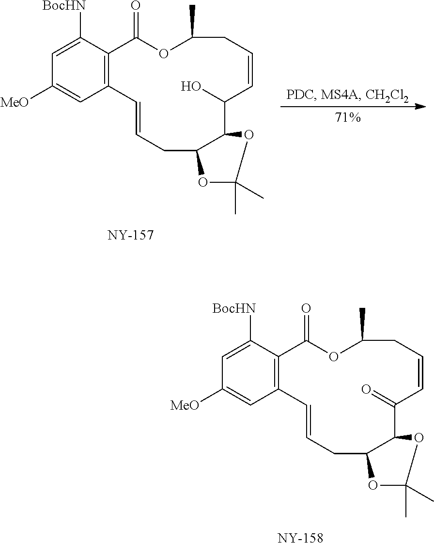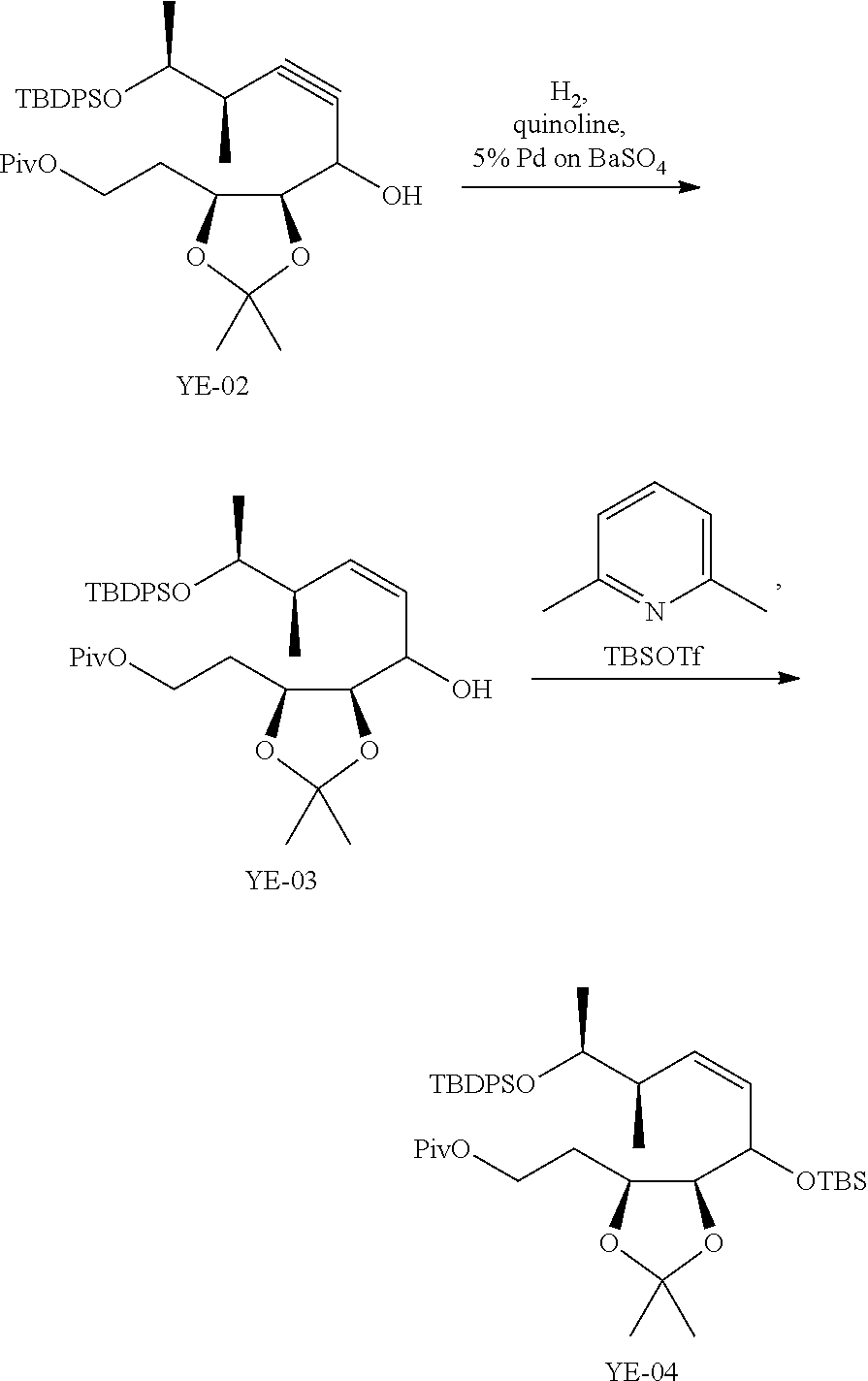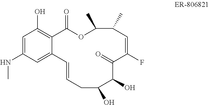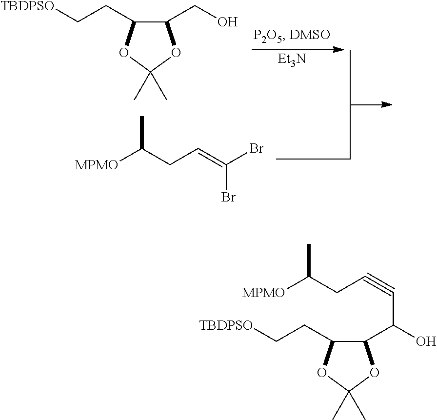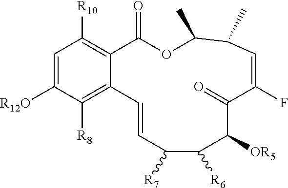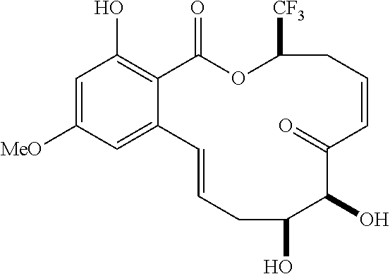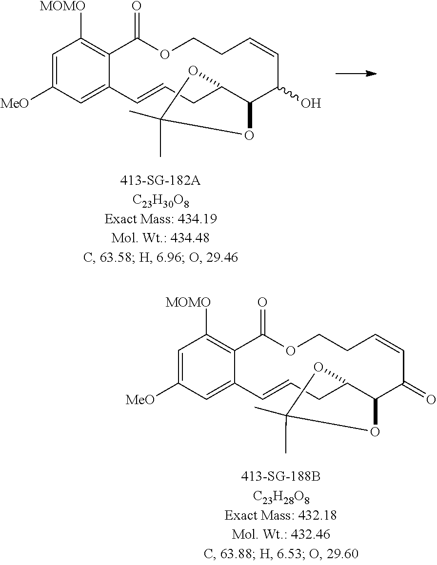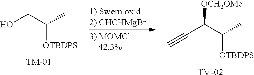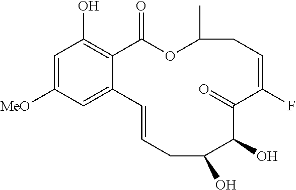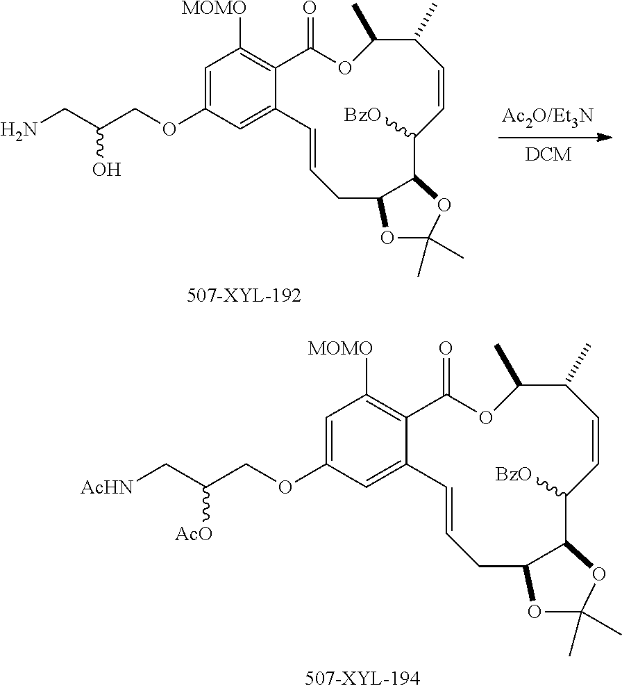 Step 4 A solution of compound 453-MS-292B (20 mg, 42 μmol) in dichloromethane (2 mL) was treated with PCC (109 mg, 0.505 mmol) in the presence of powdered 4 Å molecular sieves (109 mg). The reaction mixture was stirred vigorously for 55 minutes at room temperature. Basification with excess triethylamine, followed by chromatographic purification, gave compound 453-MS-299 (17 mg, 86%). Step 5 A solution of compound 453-MS-299 (19 mg, 0.04 mmol) in a mixture of acetonitrile (4 mL) and dichloromethane (1 mL) was treated with 48% aqueous hydrofluoric acid (1 mL). After 35 minutes the usual work up followed by chromatographic purification gave compound B2522 (9 mg, 58%) (m/z: 411.1443 measured [M+23], 411.1420 calculated). ER804018 and ER804019 (C4-F): LDA (2.0 M, 36 mL) was added to the solution of ethyl 2-fluoropropanate (7.23 g) and acetaldehyde (13.5 mL) in ether (100 mL) at −78° C. After the addition finished the reaction flask was kept in ice bath and gradually warm to room temperature. The reaction was quenched with aqueous ammonium chloride after overnight stirring. The aqueous phase was extracted with ether and the combined organic phase was dried over sodium sulfate. The solvent was stripped off and the residue was distilled in vacuo to give 541-YJ-97 (4.22 g). Chloro-t-butyldiphenylsilane was added to the mixture of 541-YJ-97 (4.22 g) and imidazole (3.5 g) in methylene chloride (50 mL) and stirred overnight. Aqueous sodium bicarbonate was added to the reaction mixture. The aqueous phase was extracted with ether and the combined organic phase was dried over sodium sulfate. The solvent was stripped off and the residue was purified with flush chromatograph (hexane/acetate 50/1) to give 541-YJ-99 (7.55 g). DIBAL-H in toluene (1.0 M, 25 ml) was added to 541-YJ-99 in toluene (85 mL) at 0° C. The reaction was quenched in one hour with methanol/water and filtrated through Celite. The residue was purified by flash chromatograph to yield 541-YJ-101 (536 mg). Dess-Martin periodinane was added to 541-YJ-101 (511 mg) in methylene chloride (15 ml) at room temperature. The mixture was diluted with ether in 40 minutes and filtrated through Celite. The filtrate was concentrated, and the residue was purified by prepTLC (hex/acetate 7/1) to give 541-Yj-105 (355 mg, 70%). Triphenylphosphine (2.08 g) was added to carbon tetrabromide (1.31 g) in methylene chloride at room temperature. After stirring for 40 minutes 541-YJ-105 was added and stirred for 2 hours. The mixture was concentrated and filtrated through silica gel (hexane/acetate 7/1) to produce 541-YJ-106 (452 mg, 89%). n-Butyllithium (2.5 M, 0.74 mL) was added to 541-YJ-106 (450 mg) in THF (10 mL) at −78° C. After one hour 541-YJ-108 was added. The reaction was kept at 0° C. for one hour and warmed to room temperature before it was quenched with aqueous ammonium chloride. The aqueous phase was extracted with ether and the combined organic phase was dried over sodium sulfate. The solvent was stripped off and the residue was purified with TLC (hexane/acetate 4/1) to 541-YJ-109 (394 mg, 54%). The suspension of Lindlar catalyst (420 mg) and 541-YJ-109 (390 mg) in hexane (8 mL) was charged with hydrogen and stirred overnight. The suspension was filtrated through Celite and rinsed with acetate. The filtrate was concentrated to give 541-YJ-111 (378 mg). Benzoyl chloride (254 mg) and DMAP (catalytic amount) was added to the solution of 541-YJ-111 (378 mg) and triethylamine (0.5 mL) in methylene chloride (7 mL) at room temperature. The mixture was kept stirring overnight and quenched with aqueous sodium bicarbonate. The aqueous phase was extracted with ether and the combined organic phase was dried over sodium sulfate. The solvent was stripped off and the residue was purified with TLC (hexane/acetate 7/1) to 541-YJ-115 (419 mg). The solution of 541-YJ-115 (419 mg) and TBAF (1.0 M, 2.2 mL) in THF (8 mL) was kept stirring overnight, and then diluted with water. The aqueous phase was extracted with ether and concentrated. The residue was purified with TLC (methylene chloride/methanol 10/1) to give 541-YJ-116 (194 mg). The solution of 541-YJ-115 (419 mg) and TBAF (1.0 M, 2.2 mL) in THF (8 mL) was kept stirring overnight, and then diluted with water. The aqueous phase was extracted with ether and concentrated. The residue was purified with TLC (methylene chloride/methanol 10/1) to give 541-YJ-116′ (21 mg). 541-YJ-116 (21 mg) was added to the reflux of 2-chloro-1-methylpyridium iodide (32 mg) and tributylamine (23 mg) in methylene chloride (4 mL). After 2 hours reflux the mixture was stirred overnight. The mixture was diluted with ether and washed with HCl (1.0 N) and water. The residue was purified with TLC (hexane/acetate 1/1) to give 541-YJ-118-1 (7.7 mg) and 541-YJ-118-2 (8.4 mg). PCC was added to 541-YJ-118-1 (7.7 mg) and MS 4 A suspension in methylene chloride (2 mL) at room temperature. The mixture was stirred for 3 hours and filtrated through silica gel. The silica gel was eluted with acetate and concentrated to give 541-YJ-119 (3.3 mg). PCC was added to 541-YJ-118-2 (8.4 mg) and MS 4 A suspension in methylene chloride (2 mL) at room temperature. The mixture was stirred for 3 hours and filtrated through silica gel. The silica gel was eluted with acetate and concentrated to give 541-YJ-120 (3.0 mg). Hydrofluoric acid (49%, 1 mL) was added to 541-YJ-119 (8.0 mg) in acetonitrile (3 mL) and stirred for 15 minutes. The mixture was diluted with water and extracted with methylene chloride. The organic phase was concentrated and purified with a short silica gel pad to produce 541-YJ-126 (5.1 mg, ER-804018). Hydrofluoric acid (49%, 1 mL) was added to 541-YJ-120 (6.0 mg) in acetonitrile (3 mL) and stirred for 15 minutes. The mixture was diluted with water and extracted with methylene chloride. The organic phase was concentrated and purified with a short silica gel pad to produce 541-YJ-126 (3.1 mg, ER-804019). Preparation of ER804142 and ER804143, C4-