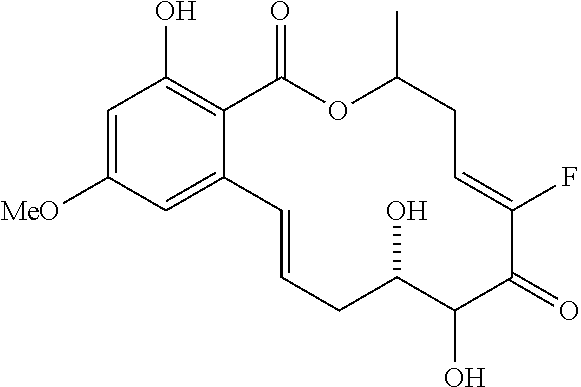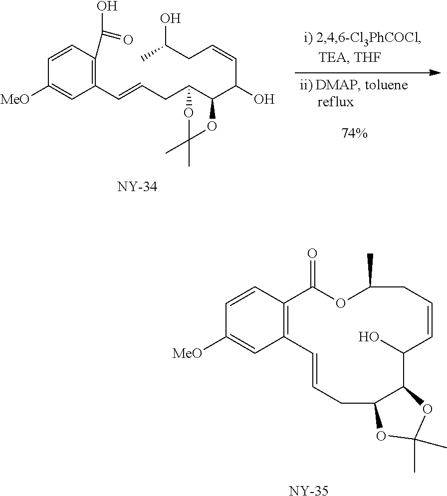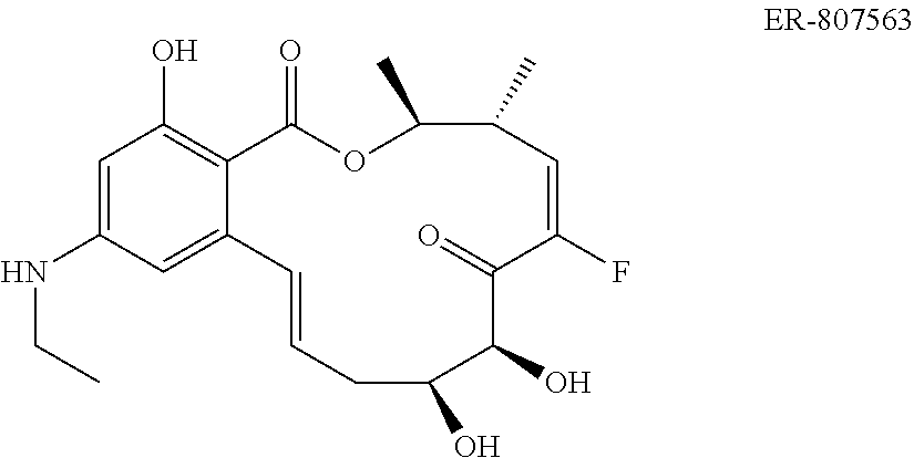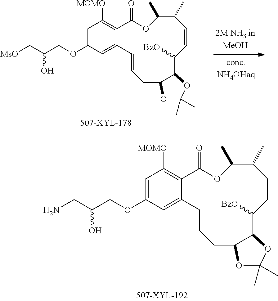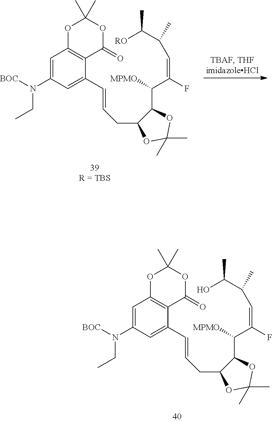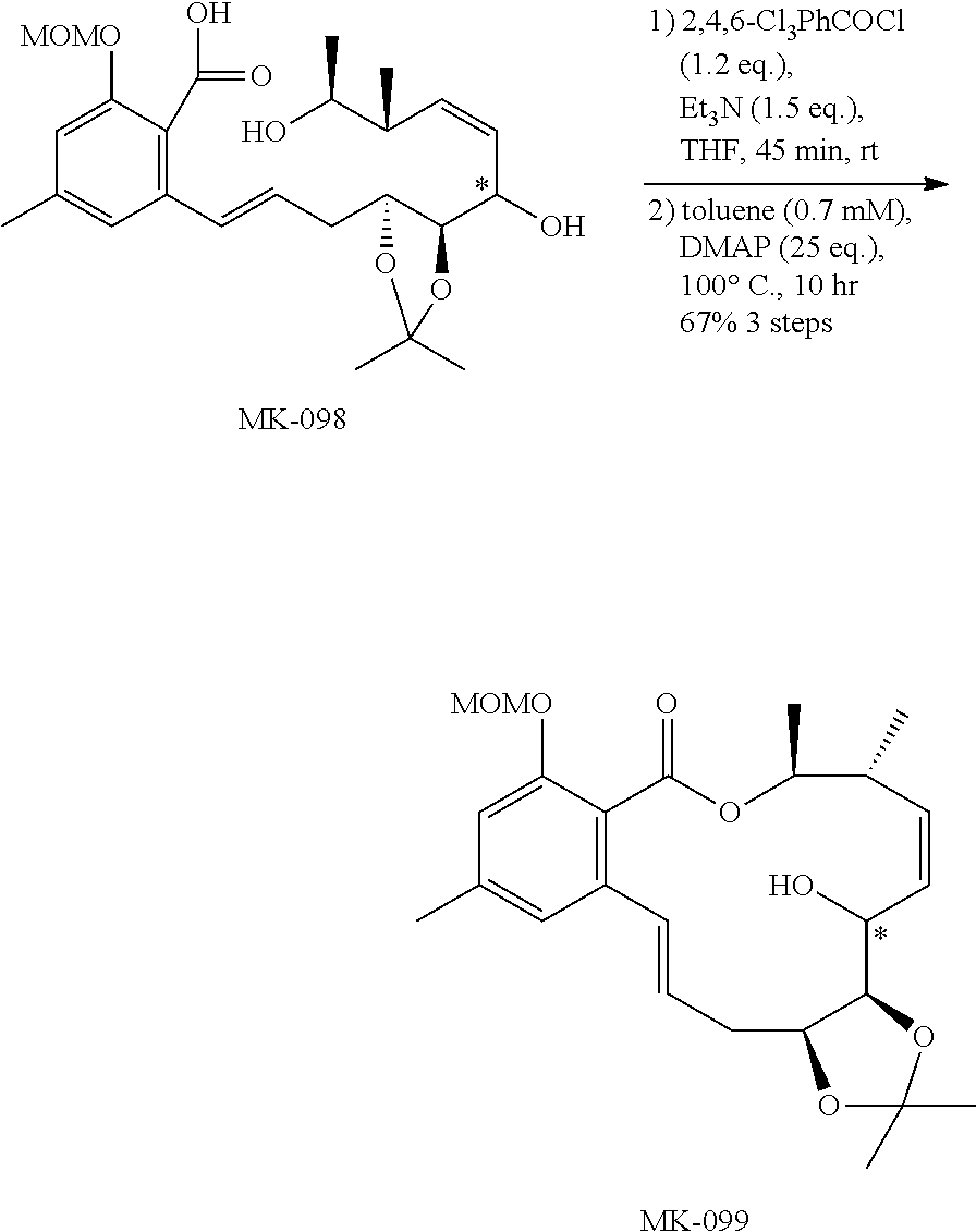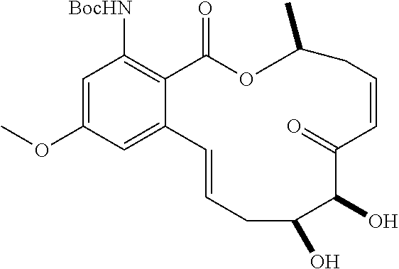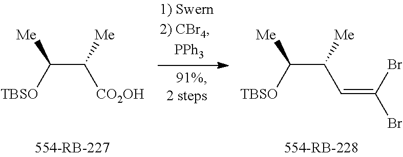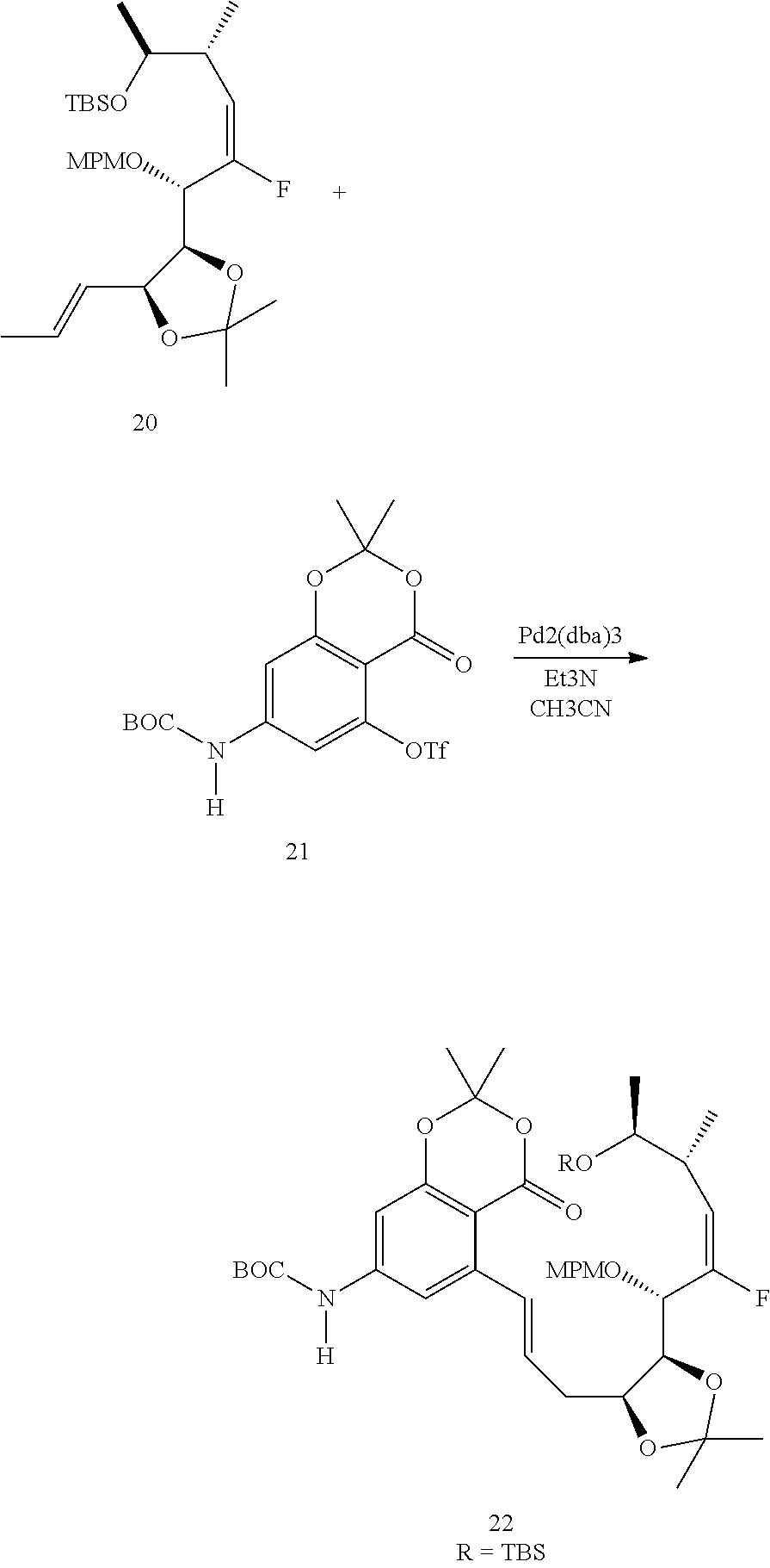 Step 4 A solution of compound 453-MS-292B (20 mg, 42 μmol) in dichloromethane (2 mL) was treated with PCC (109 mg, 0.505 mmol) in the presence of powdered 4 Å molecular sieves (109 mg). The reaction mixture was stirred vigorously for 55 minutes at room temperature. Basification with excess triethylamine, followed by chromatographic purification, gave compound 453-MS-299 (17 mg, 86%). Step 5 A solution of compound 453-MS-299 (19 mg, 0.04 mmol) in a mixture of acetonitrile (4 mL) and dichloromethane (1 mL) was treated with 48% aqueous hydrofluoric acid (1 mL). After 35 minutes the usual work up followed by chromatographic purification gave compound B2522 (9 mg, 58%) (m/z: 411.1443 measured [M+23], 411.1420 calculated). ER804018 and ER804019 (C4-F): LDA (2.0 M, 36 mL) was added to the solution of ethyl 2-fluoropropanate (7.23 g) and acetaldehyde (13.5 mL) in ether (100 mL) at −78° C. After the addition finished the reaction flask was kept in ice bath and gradually warm to room temperature. The reaction was quenched with aqueous ammonium chloride after overnight stirring. The aqueous phase was extracted with ether and the combined organic phase was dried over sodium sulfate. The solvent was stripped off and the residue was distilled in vacuo to give 541-YJ-97 (4.22 g). Chloro-t-butyldiphenylsilane was added to the mixture of 541-YJ-97 (4.22 g) and imidazole (3.5 g) in methylene chloride (50 mL) and stirred overnight. Aqueous sodium bicarbonate was added to the reaction mixture. The aqueous phase was extracted with ether and the combined organic phase was dried over sodium sulfate. The solvent was stripped off and the residue was purified with flush chromatograph (hexane/acetate 50/1) to give 541-YJ-99 (7.55 g). DIBAL-H in toluene (1.0 M, 25 ml) was added to 541-YJ-99 in toluene (85 mL) at 0° C. The reaction was quenched in one hour with methanol/water and filtrated through Celite. The residue was purified by flash chromatograph to yield 541-YJ-101 (536 mg). Dess-Martin periodinane was added to 541-YJ-101 (511 mg) in methylene chloride (15 ml) at room temperature. The mixture was diluted with ether in 40 minutes and filtrated through Celite. The filtrate was concentrated, and the residue was purified by prepTLC (hex/acetate 7/1) to give 541-Yj-105 (355 mg, 70%). Triphenylphosphine (2.08 g) was added to carbon tetrabromide (1.31 g) in methylene chloride at room temperature. After stirring for 40 minutes 541-YJ-105 was added and stirred for 2 hours. The mixture was concentrated and filtrated through silica gel (hexane/acetate 7/1) to produce 541-YJ-106 (452 mg, 89%). n-Butyllithium (2.5 M, 0.74 mL) was added to 541-YJ-106 (450 mg) in THF (10 mL) at −78° C. After one hour 541-YJ-108 was added. The reaction was kept at 0° C. for one hour and warmed to room temperature before it was quenched with aqueous ammonium chloride. The aqueous phase was extracted with ether and the combined organic phase was dried over sodium sulfate. The solvent was stripped off and the residue was purified with TLC (hexane/acetate 4/1) to 541-YJ-109 (394 mg, 54%). The suspension of Lindlar catalyst (420 mg) and 541-YJ-109 (390 mg) in hexane (8 mL) was charged with hydrogen and stirred overnight. The suspension was filtrated through Celite and rinsed with acetate. The filtrate was concentrated to give 541-YJ-111 (378 mg). Benzoyl chloride (254 mg) and DMAP (catalytic amount) was added to the solution of 541-YJ-111 (378 mg) and triethylamine (0.5 mL) in methylene chloride (7 mL) at room temperature. The mixture was kept stirring overnight and quenched with aqueous sodium bicarbonate. The aqueous phase was extracted with ether and the combined organic phase was dried over sodium sulfate. The solvent was stripped off and the residue was purified with TLC (hexane/acetate 7/1) to 541-YJ-115 (419 mg). The solution of 541-YJ-115 (419 mg) and TBAF (1.0 M, 2.2 mL) in THF (8 mL) was kept stirring overnight, and then diluted with water. The aqueous phase was extracted with ether and concentrated. The residue was purified with TLC (methylene chloride/methanol 10/1) to give 541-YJ-116 (194 mg). The solution of 541-YJ-115 (419 mg) and TBAF (1.0 M, 2.2 mL) in THF (8 mL) was kept stirring overnight, and then diluted with water. The aqueous phase was extracted with ether and concentrated. The residue was purified with TLC (methylene chloride/methanol 10/1) to give 541-YJ-116′ (21 mg). 541-YJ-116 (21 mg) was added to the reflux of 2-chloro-1-methylpyridium iodide (32 mg) and tributylamine (23 mg) in methylene chloride (4 mL). After 2 hours reflux the mixture was stirred overnight. The mixture was diluted with ether and washed with HCl (1.0 N) and water. The residue was purified with TLC (hexane/acetate 1/1) to give 541-YJ-118-1 (7.7 mg) and 541-YJ-118-2 (8.4 mg). PCC was added to 541-YJ-118-1 (7.7 mg) and MS 4 A suspension in methylene chloride (2 mL) at room temperature. The mixture was stirred for 3 hours and filtrated through silica gel. The silica gel was eluted with acetate and concentrated to give 541-YJ-119 (3.3 mg). PCC was added to 541-YJ-118-2 (8.4 mg) and MS 4 A suspension in methylene chloride (2 mL) at room temperature. The mixture was stirred for 3 hours and filtrated through silica gel. The silica gel was eluted with acetate and concentrated to give 541-YJ-120 (3.0 mg). Hydrofluoric acid (49%, 1 mL) was added to 541-YJ-119 (8.0 mg) in acetonitrile (3 mL) and stirred for 15 minutes. The mixture was diluted with water and extracted with methylene chloride. The organic phase was concentrated and purified with a short silica gel pad to produce 541-YJ-126 (5.1 mg, ER-804018). Hydrofluoric acid (49%, 1 mL) was added to 541-YJ-120 (6.0 mg) in acetonitrile (3 mL) and stirred for 15 minutes. The mixture was diluted with water and extracted with methylene chloride. The organic phase was concentrated and purified with a short silica gel pad to produce 541-YJ-126 (3.1 mg, ER-804019). Preparation of ER804142 and ER804143, C4-