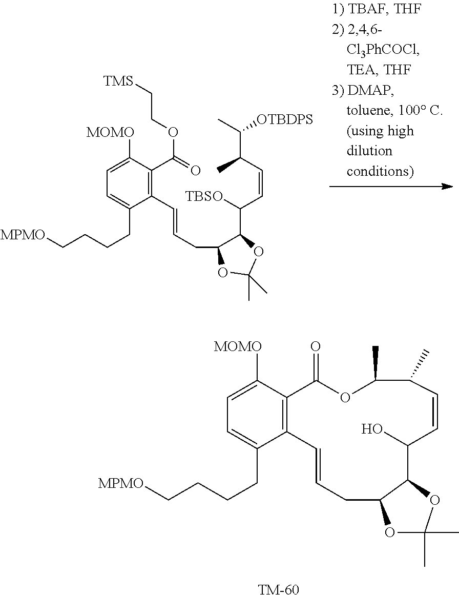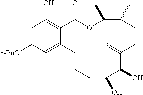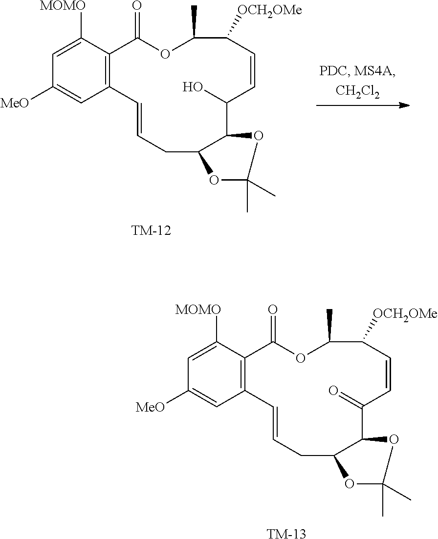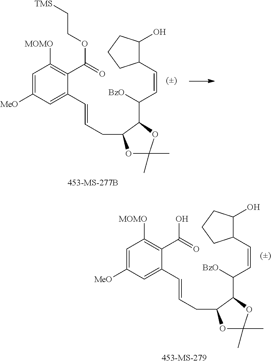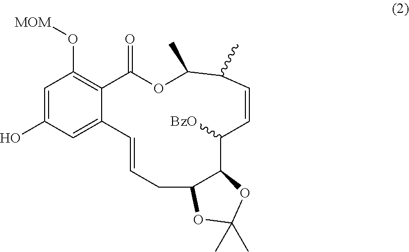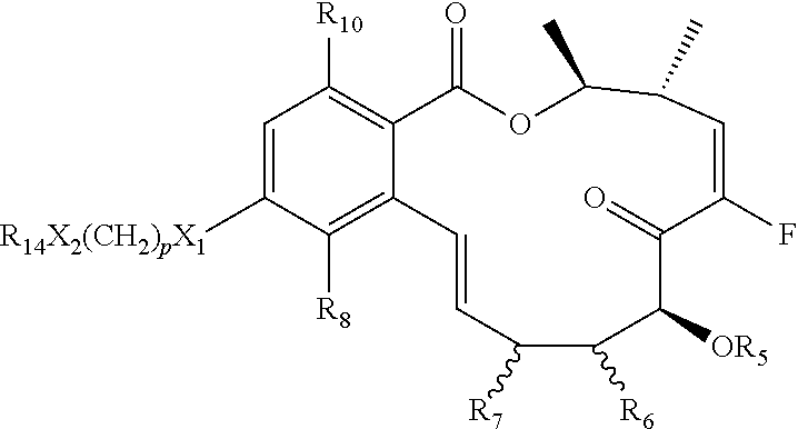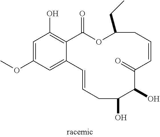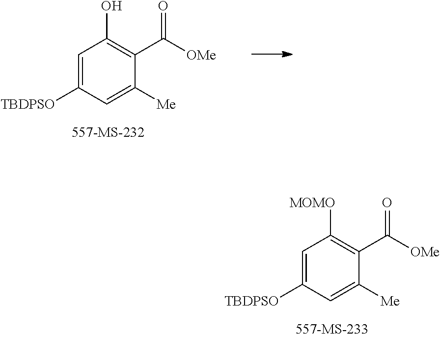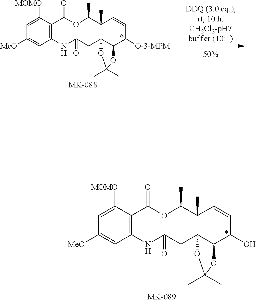 Step 4 A solution of compound 453-MS-292B (20 mg, 42 μmol) in dichloromethane (2 mL) was treated with PCC (109 mg, 0.505 mmol) in the presence of powdered 4 Å molecular sieves (109 mg). The reaction mixture was stirred vigorously for 55 minutes at room temperature. Basification with excess triethylamine, followed by chromatographic purification, gave compound 453-MS-299 (17 mg, 86%). Step 5 A solution of compound 453-MS-299 (19 mg, 0.04 mmol) in a mixture of acetonitrile (4 mL) and dichloromethane (1 mL) was treated with 48% aqueous hydrofluoric acid (1 mL). After 35 minutes the usual work up followed by chromatographic purification gave compound B2522 (9 mg, 58%) (m/z: 411.1443 measured [M+23], 411.1420 calculated). ER804018 and ER804019 (C4-F): LDA (2.0 M, 36 mL) was added to the solution of ethyl 2-fluoropropanate (7.23 g) and acetaldehyde (13.5 mL) in ether (100 mL) at −78° C. After the addition finished the reaction flask was kept in ice bath and gradually warm to room temperature. The reaction was quenched with aqueous ammonium chloride after overnight stirring. The aqueous phase was extracted with ether and the combined organic phase was dried over sodium sulfate. The solvent was stripped off and the residue was distilled in vacuo to give 541-YJ-97 (4.22 g). Chloro-t-butyldiphenylsilane was added to the mixture of 541-YJ-97 (4.22 g) and imidazole (3.5 g) in methylene chloride (50 mL) and stirred overnight. Aqueous sodium bicarbonate was added to the reaction mixture. The aqueous phase was extracted with ether and the combined organic phase was dried over sodium sulfate. The solvent was stripped off and the residue was purified with flush chromatograph (hexane/acetate 50/1) to give 541-YJ-99 (7.55 g). DIBAL-H in toluene (1.0 M, 25 ml) was added to 541-YJ-99 in toluene (85 mL) at 0° C. The reaction was quenched in one hour with methanol/water and filtrated through Celite. The residue was purified by flash chromatograph to yield 541-YJ-101 (536 mg). Dess-Martin periodinane was added to 541-YJ-101 (511 mg) in methylene chloride (15 ml) at room temperature. The mixture was diluted with ether in 40 minutes and filtrated through Celite. The filtrate was concentrated, and the residue was purified by prepTLC (hex/acetate 7/1) to give 541-Yj-105 (355 mg, 70%). Triphenylphosphine (2.08 g) was added to carbon tetrabromide (1.31 g) in methylene chloride at room temperature. After stirring for 40 minutes 541-YJ-105 was added and stirred for 2 hours. The mixture was concentrated and filtrated through silica gel (hexane/acetate 7/1) to produce 541-YJ-106 (452 mg, 89%). n-Butyllithium (2.5 M, 0.74 mL) was added to 541-YJ-106 (450 mg) in THF (10 mL) at −78° C. After one hour 541-YJ-108 was added. The reaction was kept at 0° C. for one hour and warmed to room temperature before it was quenched with aqueous ammonium chloride. The aqueous phase was extracted with ether and the combined organic phase was dried over sodium sulfate. The solvent was stripped off and the residue was purified with TLC (hexane/acetate 4/1) to 541-YJ-109 (394 mg, 54%). The suspension of Lindlar catalyst (420 mg) and 541-YJ-109 (390 mg) in hexane (8 mL) was charged with hydrogen and stirred overnight. The suspension was filtrated through Celite and rinsed with acetate. The filtrate was concentrated to give 541-YJ-111 (378 mg). Benzoyl chloride (254 mg) and DMAP (catalytic amount) was added to the solution of 541-YJ-111 (378 mg) and triethylamine (0.5 mL) in methylene chloride (7 mL) at room temperature. The mixture was kept stirring overnight and quenched with aqueous sodium bicarbonate. The aqueous phase was extracted with ether and the combined organic phase was dried over sodium sulfate. The solvent was stripped off and the residue was purified with TLC (hexane/acetate 7/1) to 541-YJ-115 (419 mg). The solution of 541-YJ-115 (419 mg) and TBAF (1.0 M, 2.2 mL) in THF (8 mL) was kept stirring overnight, and then diluted with water. The aqueous phase was extracted with ether and concentrated. The residue was purified with TLC (methylene chloride/methanol 10/1) to give 541-YJ-116 (194 mg). The solution of 541-YJ-115 (419 mg) and TBAF (1.0 M, 2.2 mL) in THF (8 mL) was kept stirring overnight, and then diluted with water. The aqueous phase was extracted with ether and concentrated. The residue was purified with TLC (methylene chloride/methanol 10/1) to give 541-YJ-116′ (21 mg). 541-YJ-116 (21 mg) was added to the reflux of 2-chloro-1-methylpyridium iodide (32 mg) and tributylamine (23 mg) in methylene chloride (4 mL). After 2 hours reflux the mixture was stirred overnight. The mixture was diluted with ether and washed with HCl (1.0 N) and water. The residue was purified with TLC (hexane/acetate 1/1) to give 541-YJ-118-1 (7.7 mg) and 541-YJ-118-2 (8.4 mg). PCC was added to 541-YJ-118-1 (7.7 mg) and MS 4 A suspension in methylene chloride (2 mL) at room temperature. The mixture was stirred for 3 hours and filtrated through silica gel. The silica gel was eluted with acetate and concentrated to give 541-YJ-119 (3.3 mg). PCC was added to 541-YJ-118-2 (8.4 mg) and MS 4 A suspension in methylene chloride (2 mL) at room temperature. The mixture was stirred for 3 hours and filtrated through silica gel. The silica gel was eluted with acetate and concentrated to give 541-YJ-120 (3.0 mg). Hydrofluoric acid (49%, 1 mL) was added to 541-YJ-119 (8.0 mg) in acetonitrile (3 mL) and stirred for 15 minutes. The mixture was diluted with water and extracted with methylene chloride. The organic phase was concentrated and purified with a short silica gel pad to produce 541-YJ-126 (5.1 mg, ER-804018). Hydrofluoric acid (49%, 1 mL) was added to 541-YJ-120 (6.0 mg) in acetonitrile (3 mL) and stirred for 15 minutes. The mixture was diluted with water and extracted with methylene chloride. The organic phase was concentrated and purified with a short silica gel pad to produce 541-YJ-126 (3.1 mg, ER-804019). Preparation of ER804142 and ER804143, C4-