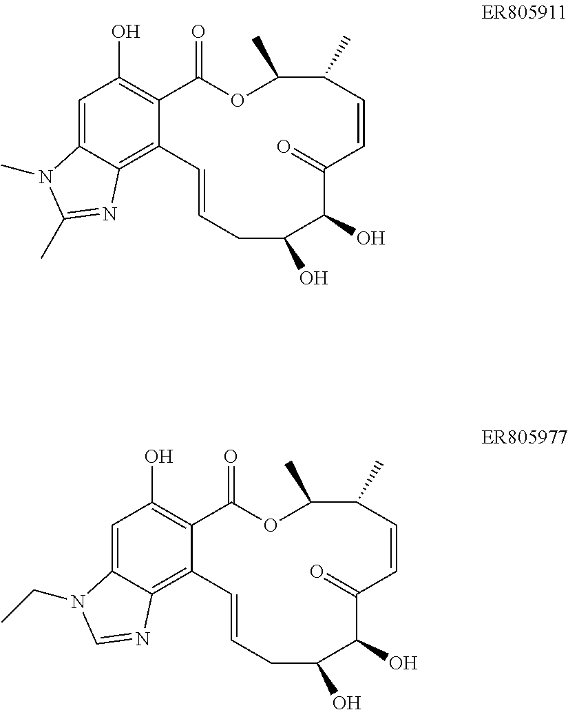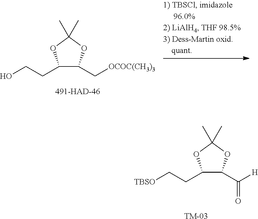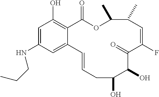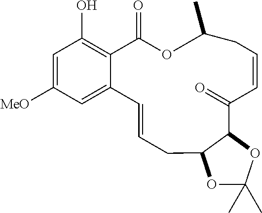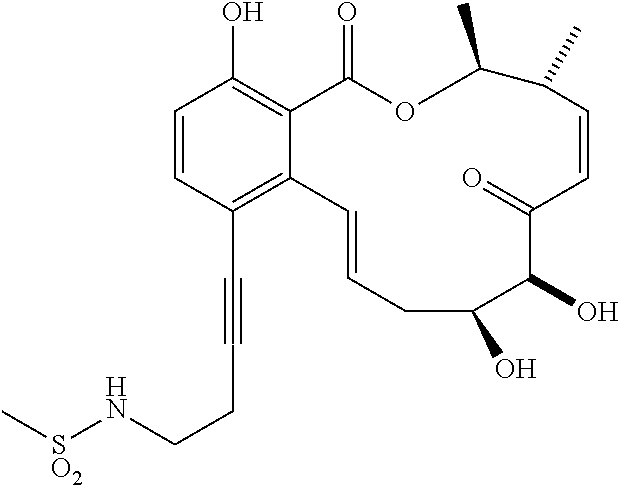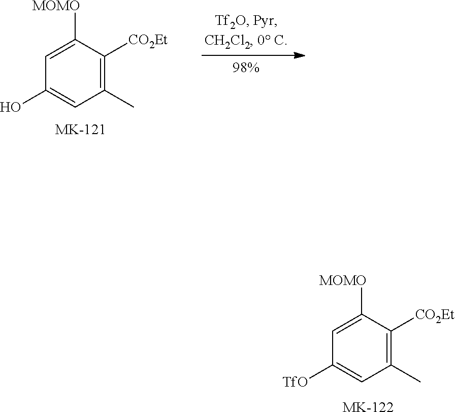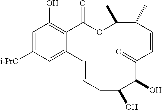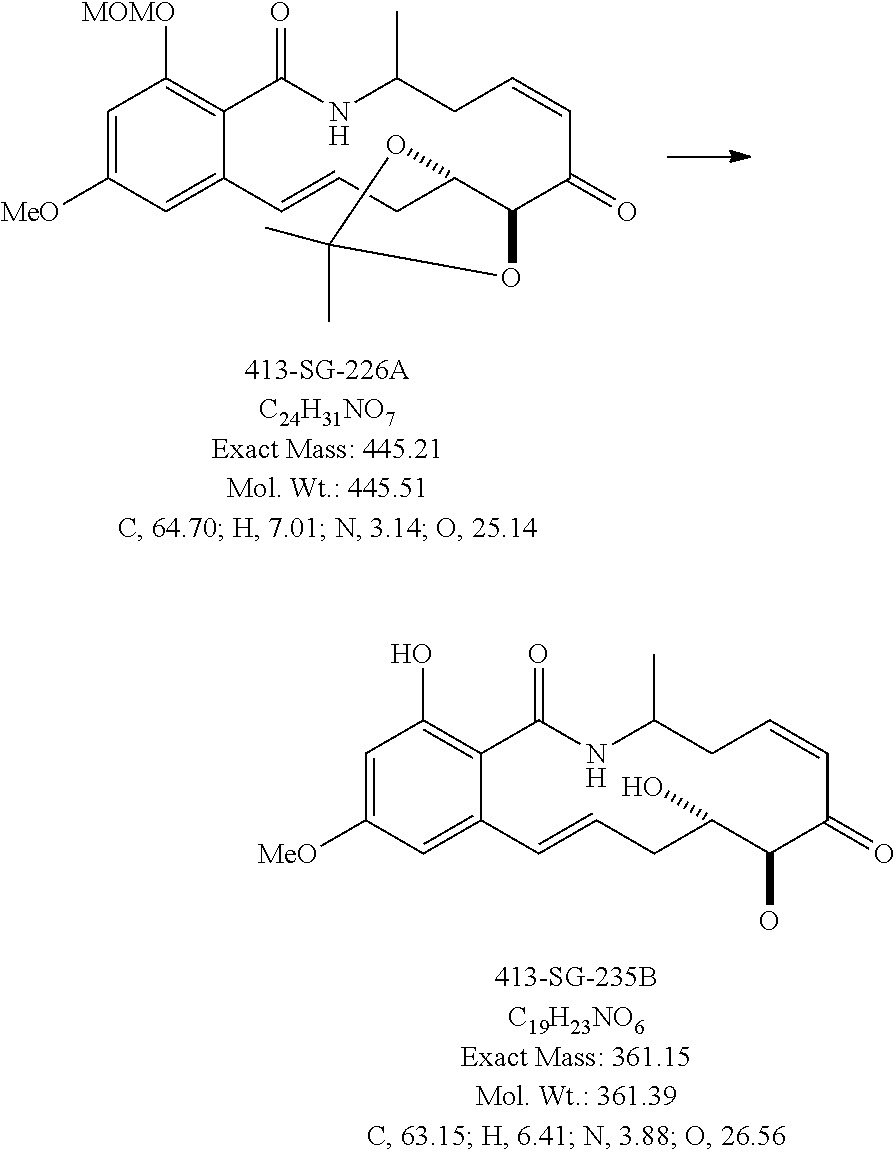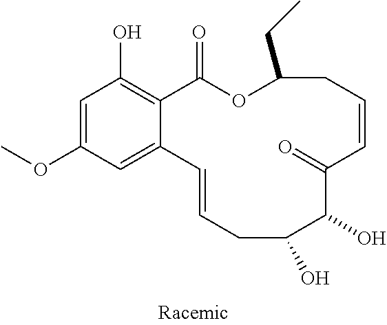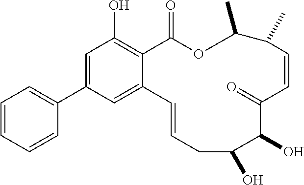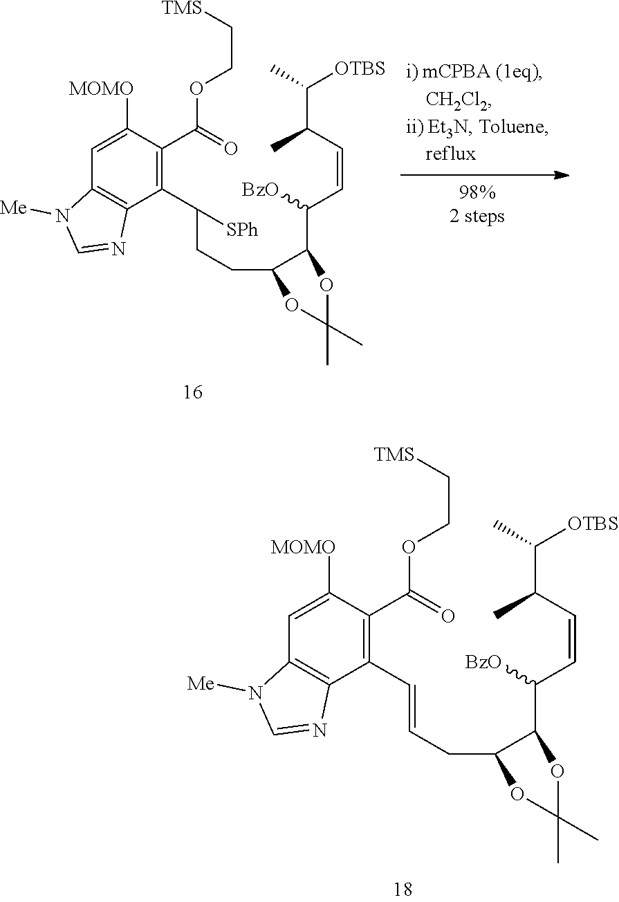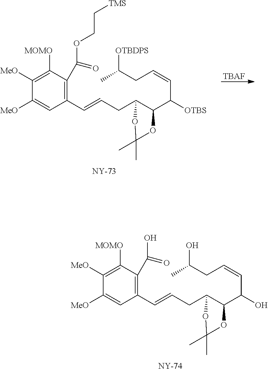 Step 4 A solution of compound 453-MS-292B (20 mg, 42 μmol) in dichloromethane (2 mL) was treated with PCC (109 mg, 0.505 mmol) in the presence of powdered 4 Å molecular sieves (109 mg). The reaction mixture was stirred vigorously for 55 minutes at room temperature. Basification with excess triethylamine, followed by chromatographic purification, gave compound 453-MS-299 (17 mg, 86%). Step 5 A solution of compound 453-MS-299 (19 mg, 0.04 mmol) in a mixture of acetonitrile (4 mL) and dichloromethane (1 mL) was treated with 48% aqueous hydrofluoric acid (1 mL). After 35 minutes the usual work up followed by chromatographic purification gave compound B2522 (9 mg, 58%) (m/z: 411.1443 measured [M+23], 411.1420 calculated). ER804018 and ER804019 (C4-F): LDA (2.0 M, 36 mL) was added to the solution of ethyl 2-fluoropropanate (7.23 g) and acetaldehyde (13.5 mL) in ether (100 mL) at −78° C. After the addition finished the reaction flask was kept in ice bath and gradually warm to room temperature. The reaction was quenched with aqueous ammonium chloride after overnight stirring. The aqueous phase was extracted with ether and the combined organic phase was dried over sodium sulfate. The solvent was stripped off and the residue was distilled in vacuo to give 541-YJ-97 (4.22 g). Chloro-t-butyldiphenylsilane was added to the mixture of 541-YJ-97 (4.22 g) and imidazole (3.5 g) in methylene chloride (50 mL) and stirred overnight. Aqueous sodium bicarbonate was added to the reaction mixture. The aqueous phase was extracted with ether and the combined organic phase was dried over sodium sulfate. The solvent was stripped off and the residue was purified with flush chromatograph (hexane/acetate 50/1) to give 541-YJ-99 (7.55 g). DIBAL-H in toluene (1.0 M, 25 ml) was added to 541-YJ-99 in toluene (85 mL) at 0° C. The reaction was quenched in one hour with methanol/water and filtrated through Celite. The residue was purified by flash chromatograph to yield 541-YJ-101 (536 mg). Dess-Martin periodinane was added to 541-YJ-101 (511 mg) in methylene chloride (15 ml) at room temperature. The mixture was diluted with ether in 40 minutes and filtrated through Celite. The filtrate was concentrated, and the residue was purified by prepTLC (hex/acetate 7/1) to give 541-Yj-105 (355 mg, 70%). Triphenylphosphine (2.08 g) was added to carbon tetrabromide (1.31 g) in methylene chloride at room temperature. After stirring for 40 minutes 541-YJ-105 was added and stirred for 2 hours. The mixture was concentrated and filtrated through silica gel (hexane/acetate 7/1) to produce 541-YJ-106 (452 mg, 89%). n-Butyllithium (2.5 M, 0.74 mL) was added to 541-YJ-106 (450 mg) in THF (10 mL) at −78° C. After one hour 541-YJ-108 was added. The reaction was kept at 0° C. for one hour and warmed to room temperature before it was quenched with aqueous ammonium chloride. The aqueous phase was extracted with ether and the combined organic phase was dried over sodium sulfate. The solvent was stripped off and the residue was purified with TLC (hexane/acetate 4/1) to 541-YJ-109 (394 mg, 54%). The suspension of Lindlar catalyst (420 mg) and 541-YJ-109 (390 mg) in hexane (8 mL) was charged with hydrogen and stirred overnight. The suspension was filtrated through Celite and rinsed with acetate. The filtrate was concentrated to give 541-YJ-111 (378 mg). Benzoyl chloride (254 mg) and DMAP (catalytic amount) was added to the solution of 541-YJ-111 (378 mg) and triethylamine (0.5 mL) in methylene chloride (7 mL) at room temperature. The mixture was kept stirring overnight and quenched with aqueous sodium bicarbonate. The aqueous phase was extracted with ether and the combined organic phase was dried over sodium sulfate. The solvent was stripped off and the residue was purified with TLC (hexane/acetate 7/1) to 541-YJ-115 (419 mg). The solution of 541-YJ-115 (419 mg) and TBAF (1.0 M, 2.2 mL) in THF (8 mL) was kept stirring overnight, and then diluted with water. The aqueous phase was extracted with ether and concentrated. The residue was purified with TLC (methylene chloride/methanol 10/1) to give 541-YJ-116 (194 mg). The solution of 541-YJ-115 (419 mg) and TBAF (1.0 M, 2.2 mL) in THF (8 mL) was kept stirring overnight, and then diluted with water. The aqueous phase was extracted with ether and concentrated. The residue was purified with TLC (methylene chloride/methanol 10/1) to give 541-YJ-116′ (21 mg). 541-YJ-116 (21 mg) was added to the reflux of 2-chloro-1-methylpyridium iodide (32 mg) and tributylamine (23 mg) in methylene chloride (4 mL). After 2 hours reflux the mixture was stirred overnight. The mixture was diluted with ether and washed with HCl (1.0 N) and water. The residue was purified with TLC (hexane/acetate 1/1) to give 541-YJ-118-1 (7.7 mg) and 541-YJ-118-2 (8.4 mg). PCC was added to 541-YJ-118-1 (7.7 mg) and MS 4 A suspension in methylene chloride (2 mL) at room temperature. The mixture was stirred for 3 hours and filtrated through silica gel. The silica gel was eluted with acetate and concentrated to give 541-YJ-119 (3.3 mg). PCC was added to 541-YJ-118-2 (8.4 mg) and MS 4 A suspension in methylene chloride (2 mL) at room temperature. The mixture was stirred for 3 hours and filtrated through silica gel. The silica gel was eluted with acetate and concentrated to give 541-YJ-120 (3.0 mg). Hydrofluoric acid (49%, 1 mL) was added to 541-YJ-119 (8.0 mg) in acetonitrile (3 mL) and stirred for 15 minutes. The mixture was diluted with water and extracted with methylene chloride. The organic phase was concentrated and purified with a short silica gel pad to produce 541-YJ-126 (5.1 mg, ER-804018). Hydrofluoric acid (49%, 1 mL) was added to 541-YJ-120 (6.0 mg) in acetonitrile (3 mL) and stirred for 15 minutes. The mixture was diluted with water and extracted with methylene chloride. The organic phase was concentrated and purified with a short silica gel pad to produce 541-YJ-126 (3.1 mg, ER-804019). Preparation of ER804142 and ER804143, C4-