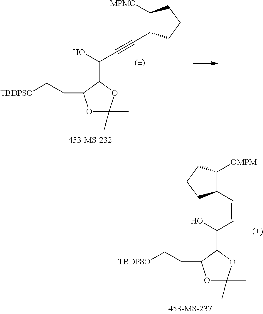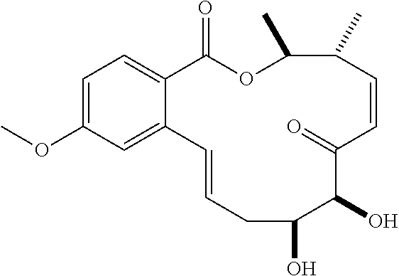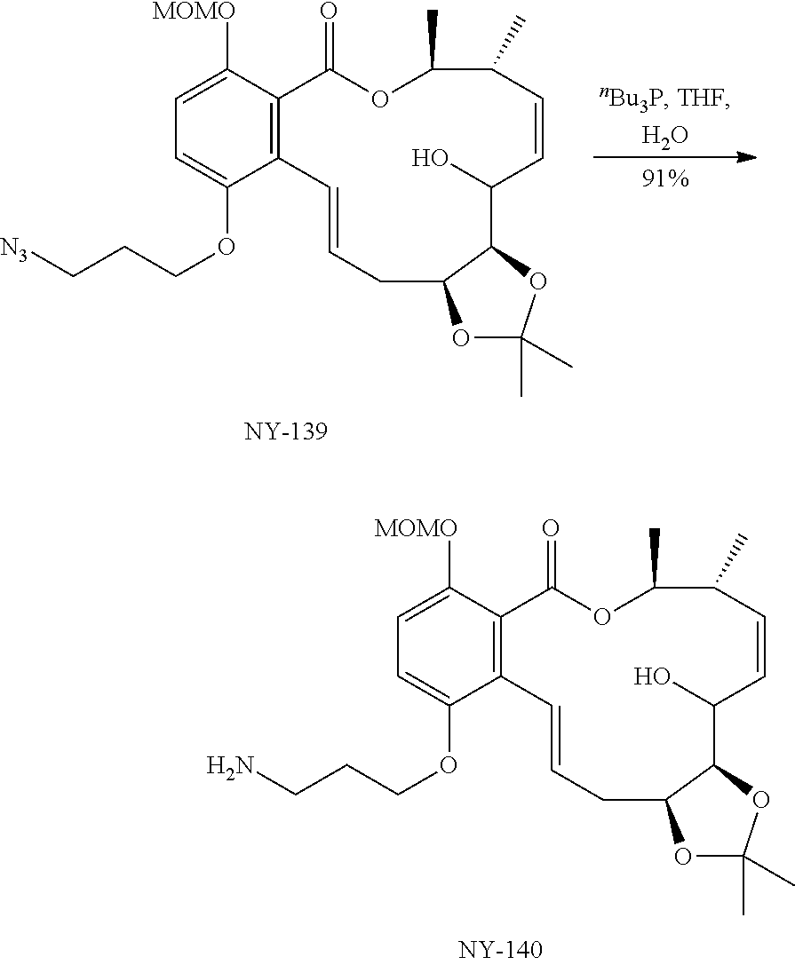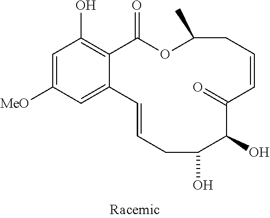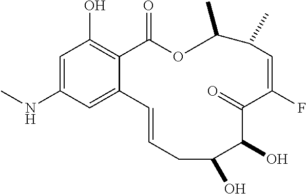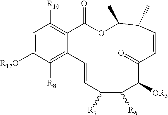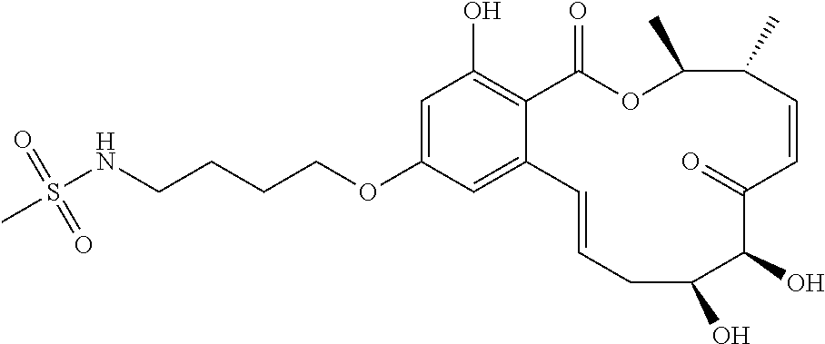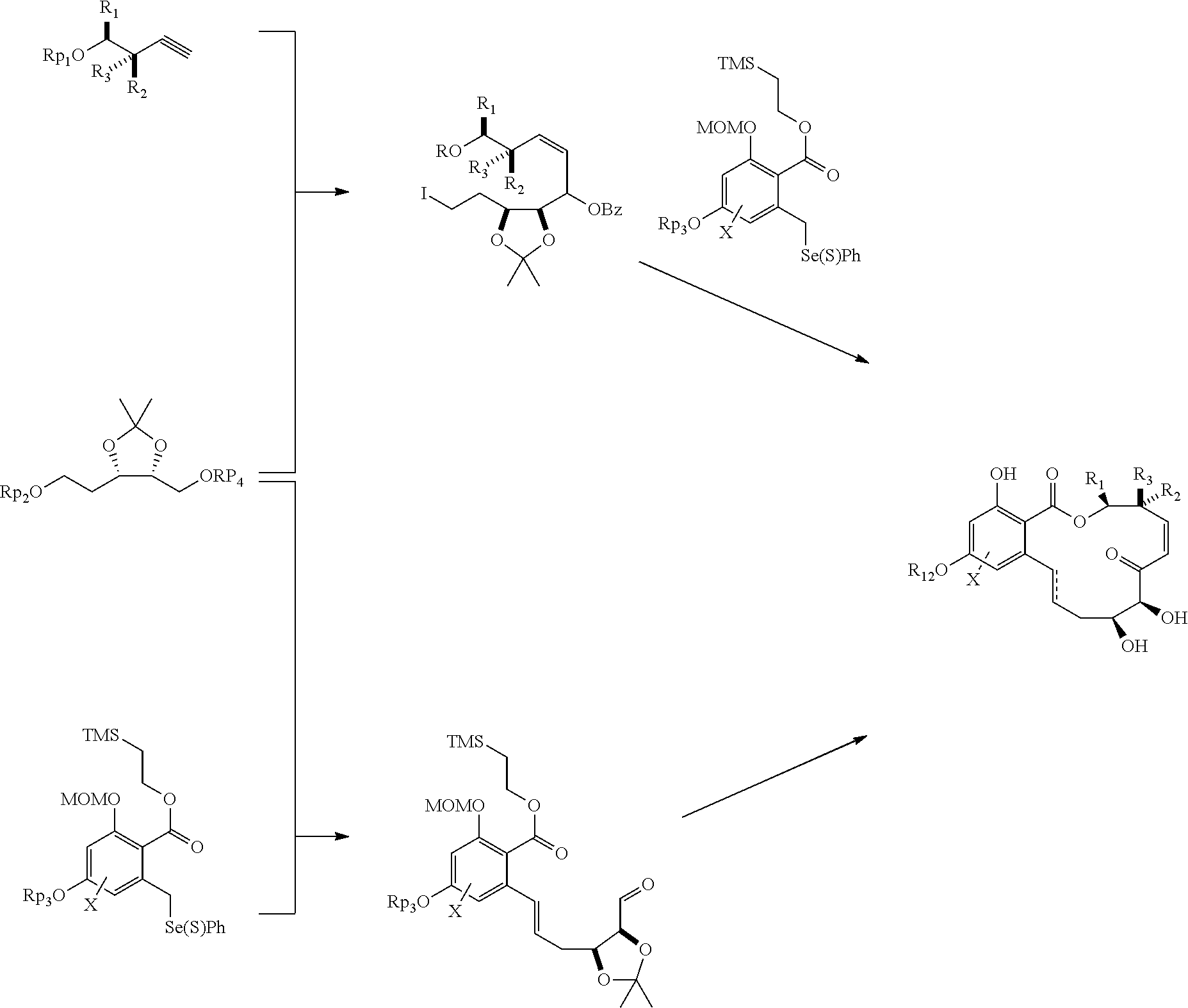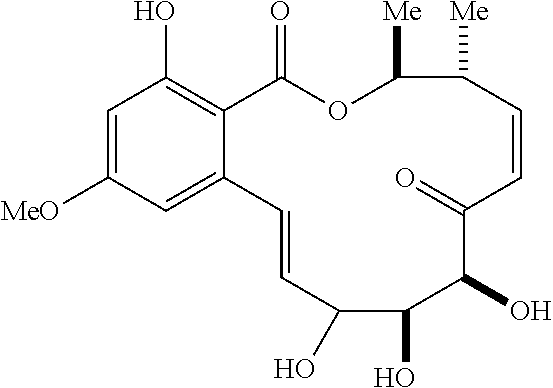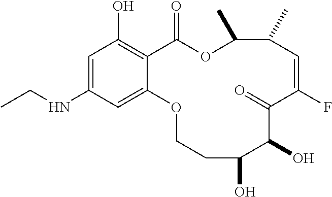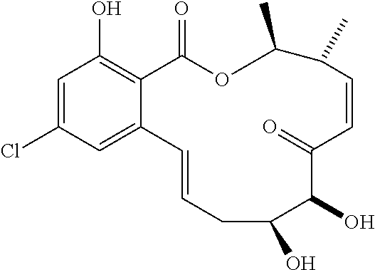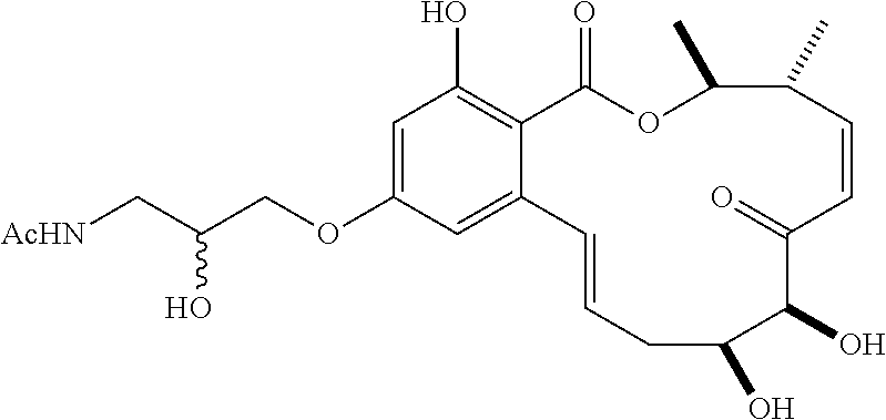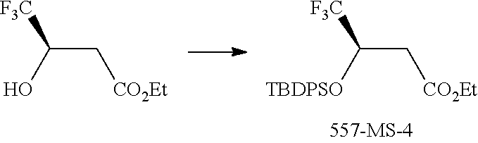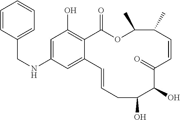Step 4 A solution of compound 453-MS-292B (20 mg, 42 μmol) in dichloromethane (2 mL) was treated with PCC (109 mg, 0.505 mmol) in the presence of powdered 4 Å molecular sieves (109 mg). The reaction mixture was stirred vigorously for 55 minutes at room temperature. Basification with excess triethylamine, followed by chromatographic purification, gave compound 453-MS-299 (17 mg, 86%). Step 5 A solution of compound 453-MS-299 (19 mg, 0.04 mmol) in a mixture of acetonitrile (4 mL) and dichloromethane (1 mL) was treated with 48% aqueous hydrofluoric acid (1 mL). After 35 minutes the usual work up followed by chromatographic purification gave compound B2522 (9 mg, 58%) (m/z: 411.1443 measured [M+23], 411.1420 calculated). ER804018 and ER804019 (C4-F): LDA (2.0 M, 36 mL) was added to the solution of ethyl 2-fluoropropanate (7.23 g) and acetaldehyde (13.5 mL) in ether (100 mL) at −78° C. After the addition finished the reaction flask was kept in ice bath and gradually warm to room temperature. The reaction was quenched with aqueous ammonium chloride after overnight stirring. The aqueous phase was extracted with ether and the combined organic phase was dried over sodium sulfate. The solvent was stripped off and the residue was distilled in vacuo to give 541-YJ-97 (4.22 g). Chloro-t-butyldiphenylsilane was added to the mixture of 541-YJ-97 (4.22 g) and imidazole (3.5 g) in methylene chloride (50 mL) and stirred overnight. Aqueous sodium bicarbonate was added to the reaction mixture. The aqueous phase was extracted with ether and the combined organic phase was dried over sodium sulfate. The solvent was stripped off and the residue was purified with flush chromatograph (hexane/acetate 50/1) to give 541-YJ-99 (7.55 g). DIBAL-H in toluene (1.0 M, 25 ml) was added to 541-YJ-99 in toluene (85 mL) at 0° C. The reaction was quenched in one hour with methanol/water and filtrated through Celite. The residue was purified by flash chromatograph to yield 541-YJ-101 (536 mg). Dess-Martin periodinane was added to 541-YJ-101 (511 mg) in methylene chloride (15 ml) at room temperature. The mixture was diluted with ether in 40 minutes and filtrated through Celite. The filtrate was concentrated, and the residue was purified by prepTLC (hex/acetate 7/1) to give 541-Yj-105 (355 mg, 70%). Triphenylphosphine (2.08 g) was added to carbon tetrabromide (1.31 g) in methylene chloride at room temperature. After stirring for 40 minutes 541-YJ-105 was added and stirred for 2 hours. The mixture was concentrated and filtrated through silica gel (hexane/acetate 7/1) to produce 541-YJ-106 (452 mg, 89%). n-Butyllithium (2.5 M, 0.74 mL) was added to 541-YJ-106 (450 mg) in THF (10 mL) at −78° C. After one hour 541-YJ-108 was added. The reaction was kept at 0° C. for one hour and warmed to room temperature before it was quenched with aqueous ammonium chloride. The aqueous phase was extracted with ether and the combined organic phase was dried over sodium sulfate. The solvent was stripped off and the residue was purified with TLC (hexane/acetate 4/1) to 541-YJ-109 (394 mg, 54%). The suspension of Lindlar catalyst (420 mg) and 541-YJ-109 (390 mg) in hexane (8 mL) was charged with hydrogen and stirred overnight. The suspension was filtrated through Celite and rinsed with acetate. The filtrate was concentrated to give 541-YJ-111 (378 mg). Benzoyl chloride (254 mg) and DMAP (catalytic amount) was added to the solution of 541-YJ-111 (378 mg) and triethylamine (0.5 mL) in methylene chloride (7 mL) at room temperature. The mixture was kept stirring overnight and quenched with aqueous sodium bicarbonate. The aqueous phase was extracted with ether and the combined organic phase was dried over sodium sulfate. The solvent was stripped off and the residue was purified with TLC (hexane/acetate 7/1) to 541-YJ-115 (419 mg). The solution of 541-YJ-115 (419 mg) and TBAF (1.0 M, 2.2 mL) in THF (8 mL) was kept stirring overnight, and then diluted with water. The aqueous phase was extracted with ether and concentrated. The residue was purified with TLC (methylene chloride/methanol 10/1) to give 541-YJ-116 (194 mg). The solution of 541-YJ-115 (419 mg) and TBAF (1.0 M, 2.2 mL) in THF (8 mL) was kept stirring overnight, and then diluted with water. The aqueous phase was extracted with ether and concentrated. The residue was purified with TLC (methylene chloride/methanol 10/1) to give 541-YJ-116′ (21 mg). 541-YJ-116 (21 mg) was added to the reflux of 2-chloro-1-methylpyridium iodide (32 mg) and tributylamine (23 mg) in methylene chloride (4 mL). After 2 hours reflux the mixture was stirred overnight. The mixture was diluted with ether and washed with HCl (1.0 N) and water. The residue was purified with TLC (hexane/acetate 1/1) to give 541-YJ-118-1 (7.7 mg) and 541-YJ-118-2 (8.4 mg). PCC was added to 541-YJ-118-1 (7.7 mg) and MS 4 A suspension in methylene chloride (2 mL) at room temperature. The mixture was stirred for 3 hours and filtrated through silica gel. The silica gel was eluted with acetate and concentrated to give 541-YJ-119 (3.3 mg). PCC was added to 541-YJ-118-2 (8.4 mg) and MS 4 A suspension in methylene chloride (2 mL) at room temperature. The mixture was stirred for 3 hours and filtrated through silica gel. The silica gel was eluted with acetate and concentrated to give 541-YJ-120 (3.0 mg). Hydrofluoric acid (49%, 1 mL) was added to 541-YJ-119 (8.0 mg) in acetonitrile (3 mL) and stirred for 15 minutes. The mixture was diluted with water and extracted with methylene chloride. The organic phase was concentrated and purified with a short silica gel pad to produce 541-YJ-126 (5.1 mg, ER-804018). Hydrofluoric acid (49%, 1 mL) was added to 541-YJ-120 (6.0 mg) in acetonitrile (3 mL) and stirred for 15 minutes. The mixture was diluted with water and extracted with methylene chloride. The organic phase was concentrated and purified with a short silica gel pad to produce 541-YJ-126 (3.1 mg, ER-804019). Preparation of ER804142 and ER804143, C4-