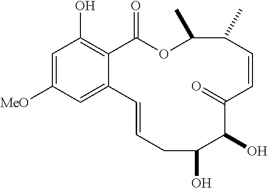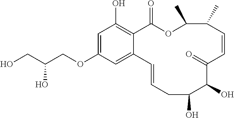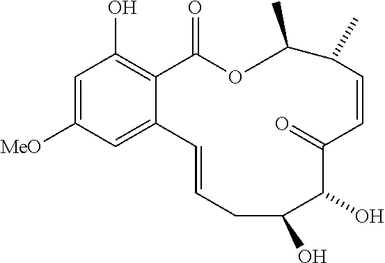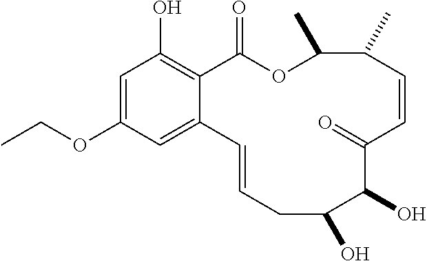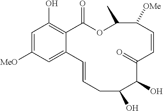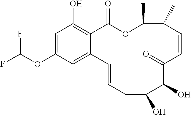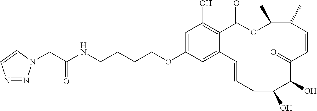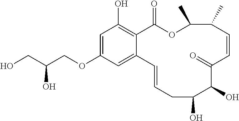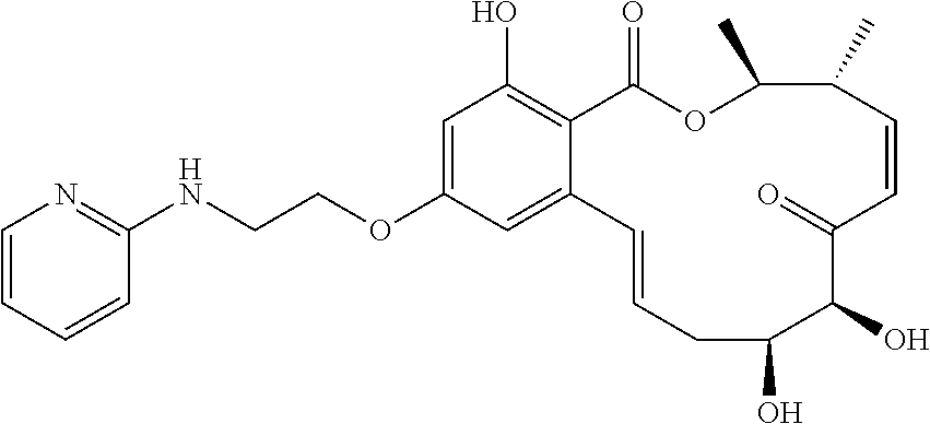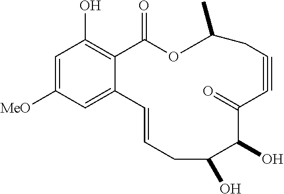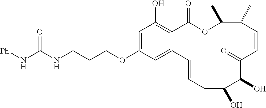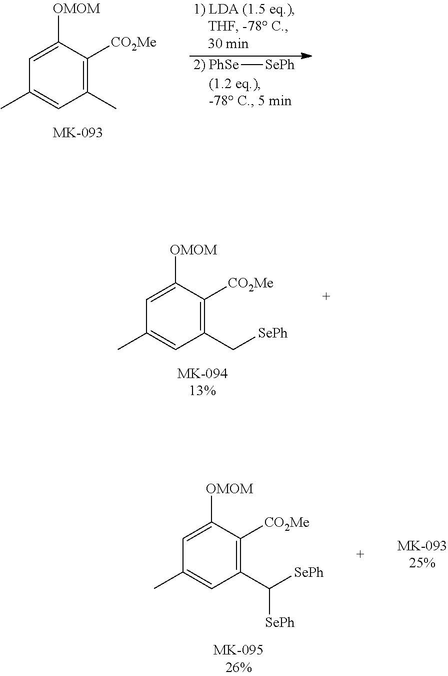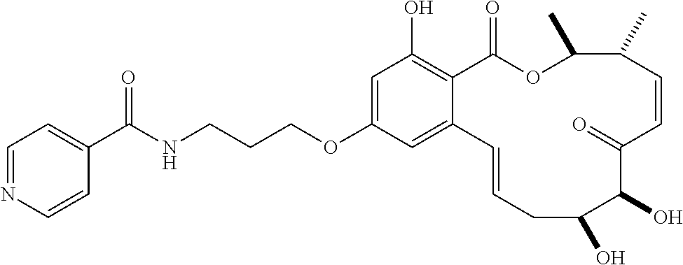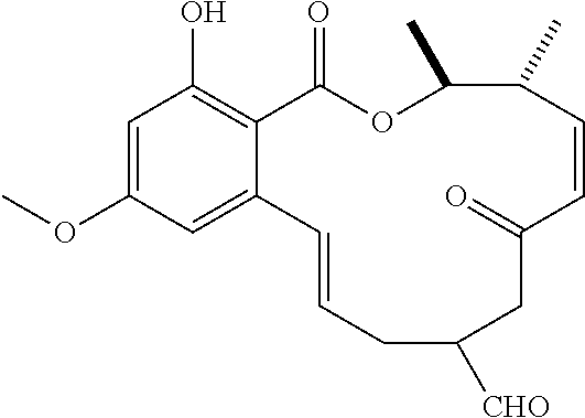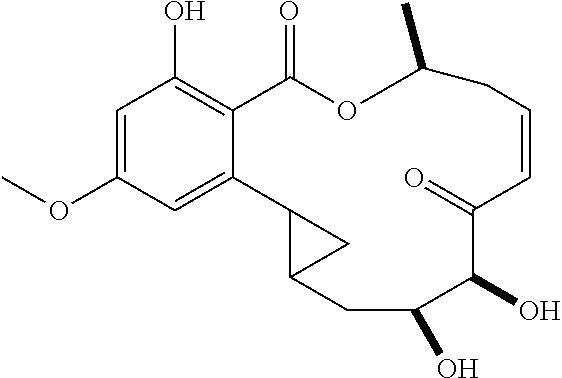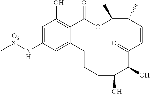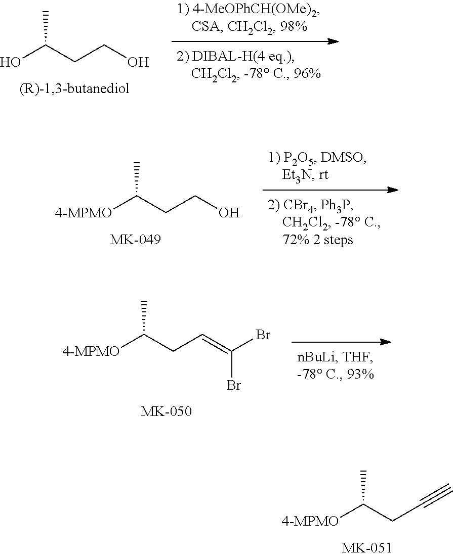 Step 4 A solution of compound 453-MS-292B (20 mg, 42 μmol) in dichloromethane (2 mL) was treated with PCC (109 mg, 0.505 mmol) in the presence of powdered 4 Å molecular sieves (109 mg). The reaction mixture was stirred vigorously for 55 minutes at room temperature. Basification with excess triethylamine, followed by chromatographic purification, gave compound 453-MS-299 (17 mg, 86%). Step 5 A solution of compound 453-MS-299 (19 mg, 0.04 mmol) in a mixture of acetonitrile (4 mL) and dichloromethane (1 mL) was treated with 48% aqueous hydrofluoric acid (1 mL). After 35 minutes the usual work up followed by chromatographic purification gave compound B2522 (9 mg, 58%) (m/z: 411.1443 measured [M+23], 411.1420 calculated). ER804018 and ER804019 (C4-F): LDA (2.0 M, 36 mL) was added to the solution of ethyl 2-fluoropropanate (7.23 g) and acetaldehyde (13.5 mL) in ether (100 mL) at −78° C. After the addition finished the reaction flask was kept in ice bath and gradually warm to room temperature. The reaction was quenched with aqueous ammonium chloride after overnight stirring. The aqueous phase was extracted with ether and the combined organic phase was dried over sodium sulfate. The solvent was stripped off and the residue was distilled in vacuo to give 541-YJ-97 (4.22 g). Chloro-t-butyldiphenylsilane was added to the mixture of 541-YJ-97 (4.22 g) and imidazole (3.5 g) in methylene chloride (50 mL) and stirred overnight. Aqueous sodium bicarbonate was added to the reaction mixture. The aqueous phase was extracted with ether and the combined organic phase was dried over sodium sulfate. The solvent was stripped off and the residue was purified with flush chromatograph (hexane/acetate 50/1) to give 541-YJ-99 (7.55 g). DIBAL-H in toluene (1.0 M, 25 ml) was added to 541-YJ-99 in toluene (85 mL) at 0° C. The reaction was quenched in one hour with methanol/water and filtrated through Celite. The residue was purified by flash chromatograph to yield 541-YJ-101 (536 mg). Dess-Martin periodinane was added to 541-YJ-101 (511 mg) in methylene chloride (15 ml) at room temperature. The mixture was diluted with ether in 40 minutes and filtrated through Celite. The filtrate was concentrated, and the residue was purified by prepTLC (hex/acetate 7/1) to give 541-Yj-105 (355 mg, 70%). Triphenylphosphine (2.08 g) was added to carbon tetrabromide (1.31 g) in methylene chloride at room temperature. After stirring for 40 minutes 541-YJ-105 was added and stirred for 2 hours. The mixture was concentrated and filtrated through silica gel (hexane/acetate 7/1) to produce 541-YJ-106 (452 mg, 89%). n-Butyllithium (2.5 M, 0.74 mL) was added to 541-YJ-106 (450 mg) in THF (10 mL) at −78° C. After one hour 541-YJ-108 was added. The reaction was kept at 0° C. for one hour and warmed to room temperature before it was quenched with aqueous ammonium chloride. The aqueous phase was extracted with ether and the combined organic phase was dried over sodium sulfate. The solvent was stripped off and the residue was purified with TLC (hexane/acetate 4/1) to 541-YJ-109 (394 mg, 54%). The suspension of Lindlar catalyst (420 mg) and 541-YJ-109 (390 mg) in hexane (8 mL) was charged with hydrogen and stirred overnight. The suspension was filtrated through Celite and rinsed with acetate. The filtrate was concentrated to give 541-YJ-111 (378 mg). Benzoyl chloride (254 mg) and DMAP (catalytic amount) was added to the solution of 541-YJ-111 (378 mg) and triethylamine (0.5 mL) in methylene chloride (7 mL) at room temperature. The mixture was kept stirring overnight and quenched with aqueous sodium bicarbonate. The aqueous phase was extracted with ether and the combined organic phase was dried over sodium sulfate. The solvent was stripped off and the residue was purified with TLC (hexane/acetate 7/1) to 541-YJ-115 (419 mg). The solution of 541-YJ-115 (419 mg) and TBAF (1.0 M, 2.2 mL) in THF (8 mL) was kept stirring overnight, and then diluted with water. The aqueous phase was extracted with ether and concentrated. The residue was purified with TLC (methylene chloride/methanol 10/1) to give 541-YJ-116 (194 mg). The solution of 541-YJ-115 (419 mg) and TBAF (1.0 M, 2.2 mL) in THF (8 mL) was kept stirring overnight, and then diluted with water. The aqueous phase was extracted with ether and concentrated. The residue was purified with TLC (methylene chloride/methanol 10/1) to give 541-YJ-116′ (21 mg). 541-YJ-116 (21 mg) was added to the reflux of 2-chloro-1-methylpyridium iodide (32 mg) and tributylamine (23 mg) in methylene chloride (4 mL). After 2 hours reflux the mixture was stirred overnight. The mixture was diluted with ether and washed with HCl (1.0 N) and water. The residue was purified with TLC (hexane/acetate 1/1) to give 541-YJ-118-1 (7.7 mg) and 541-YJ-118-2 (8.4 mg). PCC was added to 541-YJ-118-1 (7.7 mg) and MS 4 A suspension in methylene chloride (2 mL) at room temperature. The mixture was stirred for 3 hours and filtrated through silica gel. The silica gel was eluted with acetate and concentrated to give 541-YJ-119 (3.3 mg). PCC was added to 541-YJ-118-2 (8.4 mg) and MS 4 A suspension in methylene chloride (2 mL) at room temperature. The mixture was stirred for 3 hours and filtrated through silica gel. The silica gel was eluted with acetate and concentrated to give 541-YJ-120 (3.0 mg). Hydrofluoric acid (49%, 1 mL) was added to 541-YJ-119 (8.0 mg) in acetonitrile (3 mL) and stirred for 15 minutes. The mixture was diluted with water and extracted with methylene chloride. The organic phase was concentrated and purified with a short silica gel pad to produce 541-YJ-126 (5.1 mg, ER-804018). Hydrofluoric acid (49%, 1 mL) was added to 541-YJ-120 (6.0 mg) in acetonitrile (3 mL) and stirred for 15 minutes. The mixture was diluted with water and extracted with methylene chloride. The organic phase was concentrated and purified with a short silica gel pad to produce 541-YJ-126 (3.1 mg, ER-804019). Preparation of ER804142 and ER804143, C4-