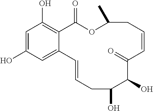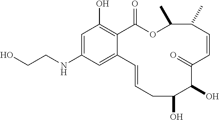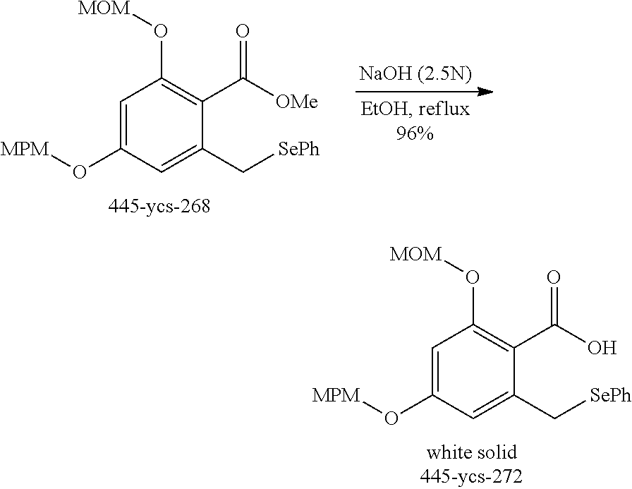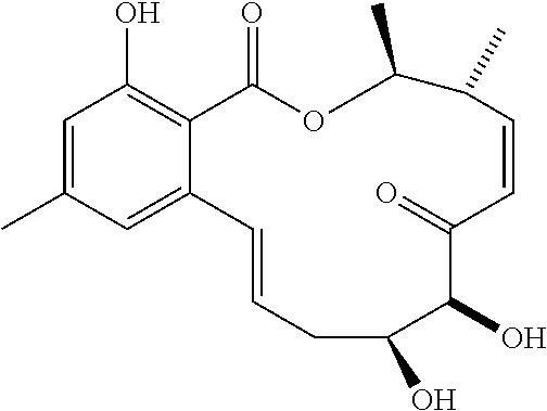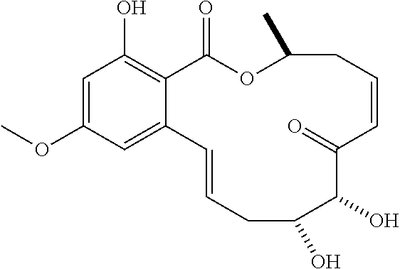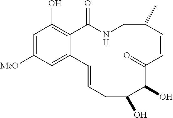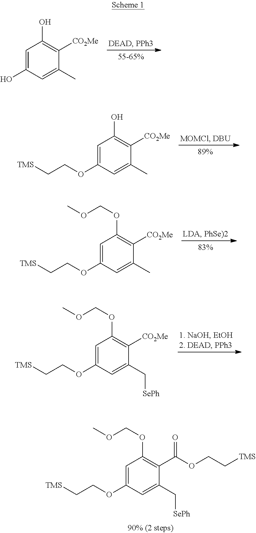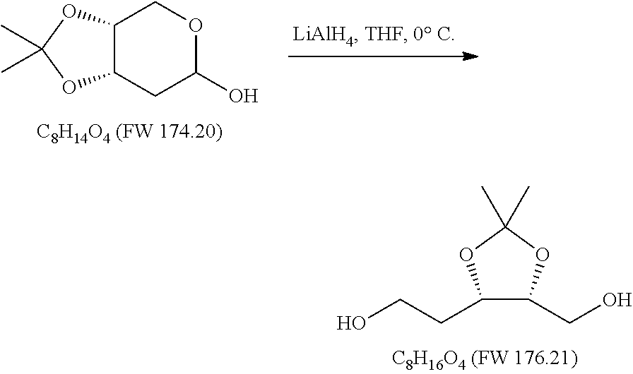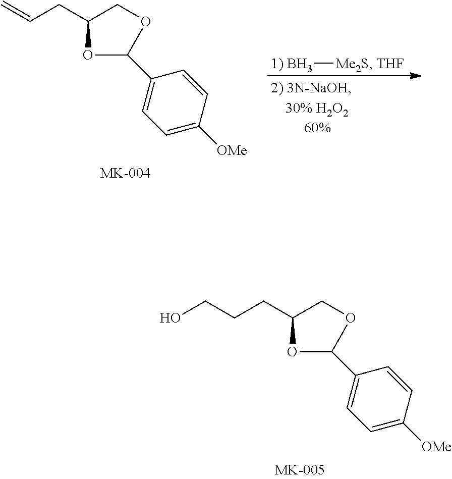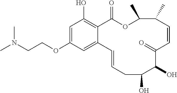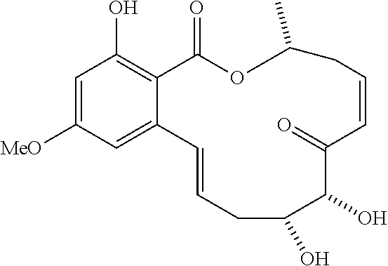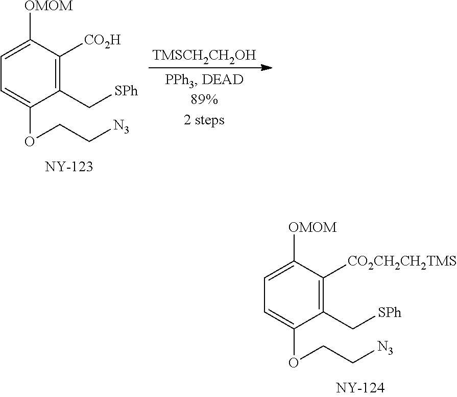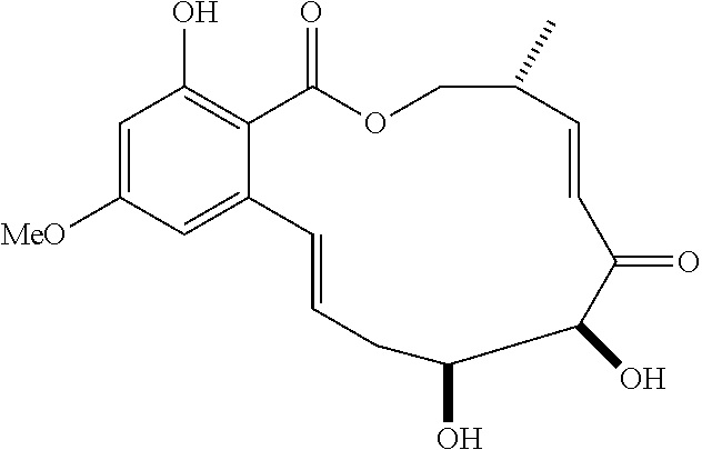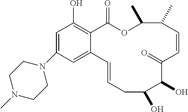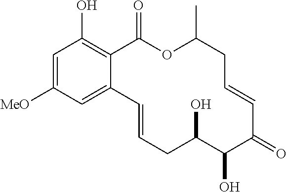 Step 4 A solution of compound 453-MS-292B (20 mg, 42 μmol) in dichloromethane (2 mL) was treated with PCC (109 mg, 0.505 mmol) in the presence of powdered 4 Å molecular sieves (109 mg). The reaction mixture was stirred vigorously for 55 minutes at room temperature. Basification with excess triethylamine, followed by chromatographic purification, gave compound 453-MS-299 (17 mg, 86%). Step 5 A solution of compound 453-MS-299 (19 mg, 0.04 mmol) in a mixture of acetonitrile (4 mL) and dichloromethane (1 mL) was treated with 48% aqueous hydrofluoric acid (1 mL). After 35 minutes the usual work up followed by chromatographic purification gave compound B2522 (9 mg, 58%) (m/z: 411.1443 measured [M+23], 411.1420 calculated). ER804018 and ER804019 (C4-F): LDA (2.0 M, 36 mL) was added to the solution of ethyl 2-fluoropropanate (7.23 g) and acetaldehyde (13.5 mL) in ether (100 mL) at −78° C. After the addition finished the reaction flask was kept in ice bath and gradually warm to room temperature. The reaction was quenched with aqueous ammonium chloride after overnight stirring. The aqueous phase was extracted with ether and the combined organic phase was dried over sodium sulfate. The solvent was stripped off and the residue was distilled in vacuo to give 541-YJ-97 (4.22 g). Chloro-t-butyldiphenylsilane was added to the mixture of 541-YJ-97 (4.22 g) and imidazole (3.5 g) in methylene chloride (50 mL) and stirred overnight. Aqueous sodium bicarbonate was added to the reaction mixture. The aqueous phase was extracted with ether and the combined organic phase was dried over sodium sulfate. The solvent was stripped off and the residue was purified with flush chromatograph (hexane/acetate 50/1) to give 541-YJ-99 (7.55 g). DIBAL-H in toluene (1.0 M, 25 ml) was added to 541-YJ-99 in toluene (85 mL) at 0° C. The reaction was quenched in one hour with methanol/water and filtrated through Celite. The residue was purified by flash chromatograph to yield 541-YJ-101 (536 mg). Dess-Martin periodinane was added to 541-YJ-101 (511 mg) in methylene chloride (15 ml) at room temperature. The mixture was diluted with ether in 40 minutes and filtrated through Celite. The filtrate was concentrated, and the residue was purified by prepTLC (hex/acetate 7/1) to give 541-Yj-105 (355 mg, 70%). Triphenylphosphine (2.08 g) was added to carbon tetrabromide (1.31 g) in methylene chloride at room temperature. After stirring for 40 minutes 541-YJ-105 was added and stirred for 2 hours. The mixture was concentrated and filtrated through silica gel (hexane/acetate 7/1) to produce 541-YJ-106 (452 mg, 89%). n-Butyllithium (2.5 M, 0.74 mL) was added to 541-YJ-106 (450 mg) in THF (10 mL) at −78° C. After one hour 541-YJ-108 was added. The reaction was kept at 0° C. for one hour and warmed to room temperature before it was quenched with aqueous ammonium chloride. The aqueous phase was extracted with ether and the combined organic phase was dried over sodium sulfate. The solvent was stripped off and the residue was purified with TLC (hexane/acetate 4/1) to 541-YJ-109 (394 mg, 54%). The suspension of Lindlar catalyst (420 mg) and 541-YJ-109 (390 mg) in hexane (8 mL) was charged with hydrogen and stirred overnight. The suspension was filtrated through Celite and rinsed with acetate. The filtrate was concentrated to give 541-YJ-111 (378 mg). Benzoyl chloride (254 mg) and DMAP (catalytic amount) was added to the solution of 541-YJ-111 (378 mg) and triethylamine (0.5 mL) in methylene chloride (7 mL) at room temperature. The mixture was kept stirring overnight and quenched with aqueous sodium bicarbonate. The aqueous phase was extracted with ether and the combined organic phase was dried over sodium sulfate. The solvent was stripped off and the residue was purified with TLC (hexane/acetate 7/1) to 541-YJ-115 (419 mg). The solution of 541-YJ-115 (419 mg) and TBAF (1.0 M, 2.2 mL) in THF (8 mL) was kept stirring overnight, and then diluted with water. The aqueous phase was extracted with ether and concentrated. The residue was purified with TLC (methylene chloride/methanol 10/1) to give 541-YJ-116 (194 mg). The solution of 541-YJ-115 (419 mg) and TBAF (1.0 M, 2.2 mL) in THF (8 mL) was kept stirring overnight, and then diluted with water. The aqueous phase was extracted with ether and concentrated. The residue was purified with TLC (methylene chloride/methanol 10/1) to give 541-YJ-116′ (21 mg). 541-YJ-116 (21 mg) was added to the reflux of 2-chloro-1-methylpyridium iodide (32 mg) and tributylamine (23 mg) in methylene chloride (4 mL). After 2 hours reflux the mixture was stirred overnight. The mixture was diluted with ether and washed with HCl (1.0 N) and water. The residue was purified with TLC (hexane/acetate 1/1) to give 541-YJ-118-1 (7.7 mg) and 541-YJ-118-2 (8.4 mg). PCC was added to 541-YJ-118-1 (7.7 mg) and MS 4 A suspension in methylene chloride (2 mL) at room temperature. The mixture was stirred for 3 hours and filtrated through silica gel. The silica gel was eluted with acetate and concentrated to give 541-YJ-119 (3.3 mg). PCC was added to 541-YJ-118-2 (8.4 mg) and MS 4 A suspension in methylene chloride (2 mL) at room temperature. The mixture was stirred for 3 hours and filtrated through silica gel. The silica gel was eluted with acetate and concentrated to give 541-YJ-120 (3.0 mg). Hydrofluoric acid (49%, 1 mL) was added to 541-YJ-119 (8.0 mg) in acetonitrile (3 mL) and stirred for 15 minutes. The mixture was diluted with water and extracted with methylene chloride. The organic phase was concentrated and purified with a short silica gel pad to produce 541-YJ-126 (5.1 mg, ER-804018). Hydrofluoric acid (49%, 1 mL) was added to 541-YJ-120 (6.0 mg) in acetonitrile (3 mL) and stirred for 15 minutes. The mixture was diluted with water and extracted with methylene chloride. The organic phase was concentrated and purified with a short silica gel pad to produce 541-YJ-126 (3.1 mg, ER-804019). Preparation of ER804142 and ER804143, C4-