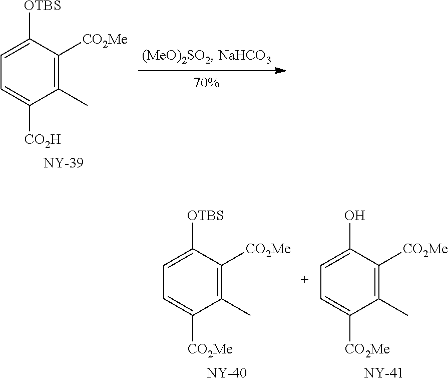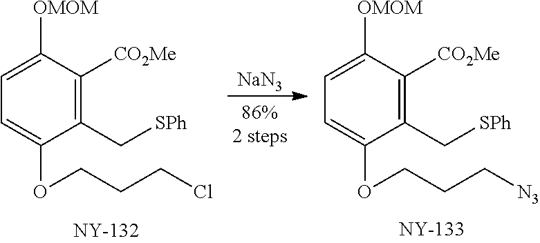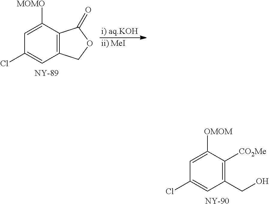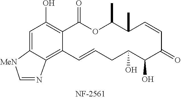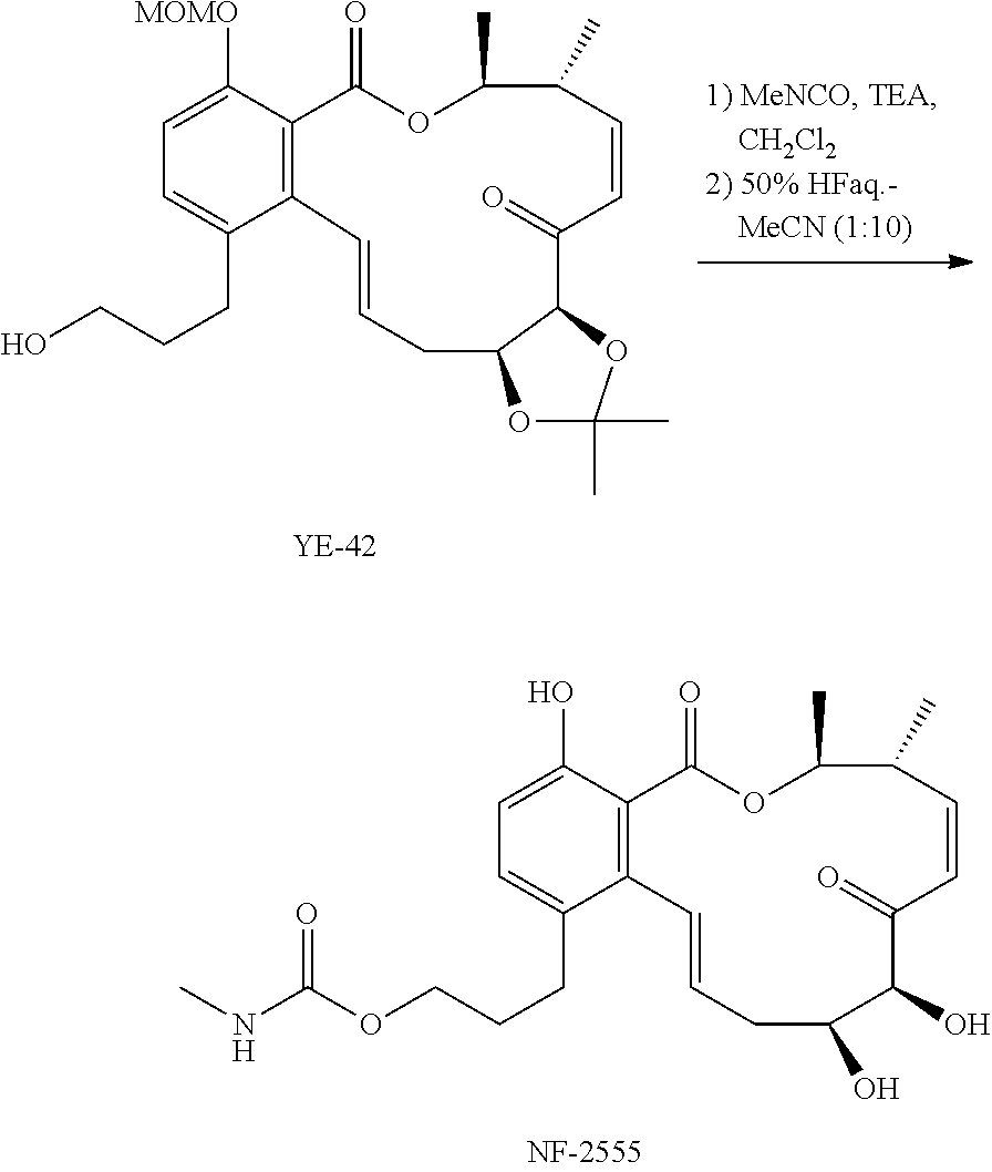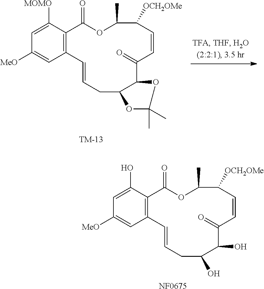 Step 10 A solution of compound 453-MS-101B (25 mg, 52.3 μmol) in dichloromethane (1.5 mL) was treated with PCC (135 mg, 0.627 mmol) in the presence of powdered 4 Å molecular sieves (135 mg). The reaction mixture was stirred vigorously for 40 minutes at room temperature. Basification with excess triethylamine, followed by chromatographic purification gave compound 453-MS-116 (14 mg, 63%). Step 11 A solution of compound 453-MS-116 (13 mg, 27.3 μmol) in a mixture of dioxane (3 mL) and deuterium oxide (3 mL) was treated with Dowex® (50WX8-100, 200 mg), and stirred at room temperature for approximately 16 hours. The usual work up, followed by purification using reversed phase HPLC, gave compound B2356 (2.4 mg, 25%) [m/z: 349.3 (M+1, 60%), 161.0 (100%)], and compound B2358 (2 mg, 20%). Preparation of Compound B2357 (C14 Hydroxy) & Compound B2359 (C14 OMOM): Step 1 A solution of compound 453-MS-101A (24 mg, 50.1 μmol) in dichloromethane (2 mL) was treated with pyridinium chlorochromate (130 mg, 0.602 mmol) in the presence of powdered 4 Å molecular sieves (130 mg). The reaction mixture was stirred vigorously for 1 hour at room temperature. Basification with excess triethylamine, followed by chromatographic purification gave compound 453-MS-122 (19 mg, 80%). Step 2 A solution of compound 453-MS-122 (21 mg, 44 μmol) in a mixture of acetonitrile (4.6 mL) and dichloromethane (1.1 mL) was treated with 48% aqueous hydrofluoric acid (1.1 mL), and stirred at room temperature for approximately 2 hours. The usual work up, followed by purification using reversed phase HPLC, gave compound B2357 (3.5 mg, 23%) [m/z: 349.2 (M+1, 50%), 161.0 (100%)], and compound B2359 (1.6 mg, 10%). Preparation of C14-C, H, or Halogen Analogs, NF0887, NF2433, NF2435, NF2436, NF2557 and ER-805053, Synthetic Procedure for NF2433 Using same procedure for 16, YE-06 (526 mg, 0.714 mmol) was converted to NY-78 (657 mg). Using same procedure for 18, NY-78 (653 mg, 0.644 mmol) was converted to NY-79 (529 mg). Using same procedure for 509-HD-116, NY-79 (528 mg, 0.584 mmol) was converted to NY-80 (231 mg). NY-80 was used without purification for the next step. Using same procedure for TM-12, NY-80 (230 mg, 0.511 mmol) was converted to NY-81 (157 mg). Using same procedure for 509-HD-125, NY-81 (127 mg, 0.294 mmol) was converted to NY-82 (118 mg). Using same procedure for NF-0675, NY-82 (118 mg, 0.274 mmol) was converted to NF-2433 (79 mg). Synthetic Procedure for NF-2436 Using same procedure for 9, NY-83 (7.46 g, 40 mmol) was converted to NY-84 (11.39 g). To a mixture of NY-84 (3 g, 10 mmol), Et2NH (2.07 mL, 20 mmol) and THF (80 mL), isopropylmagenesium chloride (2M in THF, 10 mL, 20 mmol) was gradually added at −30° C. The reaction mixture was allowed to warm to 0° C. The reaction mixture was quenched with sat. NaHCO3 and extracted with EtOAc. The organic layer was washed with water, brine, dried over Na2SO4, filtered and concentrated. The crude product was purified on silica gel column with hexane/EtOAc, 10:1, 8:1, 6:1 to give 3.21 g of NY-85. NY-85 (3.2 g, 9.36 mmol) and TMEDA (2.2 mL, 14.58 mmol) were dissolved in THF (30 mL) and cooled to −78° C., under nitrogen. Then, sec-BuLi (1.3M/cyclohexane, 11 mL, 14.3 mmol) was slowly added and the reaction was stirred at −78° C. for 1 hr. DMF (1.4 mL, 18.08 mmol) was added to the solution, then the solution was stirred at −78° C. for 30 min. The mixture was quenched with sat.NH4Cl and extracted with EtOAc. The organic layer was washed with water, brine and dried over Na2SO4, filtered and concentrated. The crude product was purified on silica gel column with hexane/EtOAc, 6:1 to give 2.56 g of NY-86. To a solution of NY-86 (2.55 g, 6.89 mmol) in MeOH (30 mL), NaBH4 (260 mg, 6.87 mmol) was added at 0° C. and stirred for 30 min. The reaction mixture was quenched with sat. NH4Cl and extracted with EtOAc. The organic layer was washed with water, brine, dried over Na2SO4, filtered and concentrated to give 2.5 g of NY-87. A mixture of NY-87 (2.5 g, 6.72 mmol), AcOH (1.92 mL, 33.54 mmol) and EtOH (50 mL) was refluxed for 4 hrs. The mixture was concentrated and the residue was alkalized with sat.NaHCO3 and extracted with EtOAc. The aqueous layer was reextracted with EtOAc (×2) and the organic layers were washed with sat. NH4Cl, water, brine, dried over Na2SO4, filtered and concentrated. The crude crystallized product was washed with Et2O to give 718 mg of NY-88. The mother liquid was purified on silica gel column with hexane/EtOAc, 3:1, 2:1 to give additional 230 mg of NY-88. Using same procedure for 509-HD-209, NY-88 (940 mg, 5.09 mmol) was converted to NY-89 (676 mg). To a solution of NY-89 (1.74 g, 7.61 mmol) in DMSO (20 mL), a solution of KOH (450 mg, 8.02 mmol) in water (10 mL) was added and stirred at room temperature for 30 min. Then, the mixture was stirred at 40° C. for 30 min. MeI (9.5 mL, 153 mmol) was added to the reaction mixture, and the mixture was stirred at room temperature for 3 hrs. The reaction mixture was quenched with sat. NH4Cl and extracted with EtOAc. The organic layer was washed with water, 5% citric acid, water, sat.NaHCO3, brine, dried over Na2SO4, filtered and concentrated to give 1.93 g of NY-90. To a solution of NY-90 (1.93 g, 7.61 mmol), Ph2S2 (5 g, 22.9 mmol), pyridine (3.7 mL, 45.75 mmol),nBu3P (5.7 mL, 22.88 mmol) were added at 0° C. The mixture was allowed to warm to room temperature and stirred for 12 hrs. The reaction mixture was diluted with EtOAc and washed with 5% citric acid (×2), water, sat. NaHCO3, brine, dried over Na2SO4, filtered and concentrated. The crude product was purified on silica gel column with hexane/EtOAc, 15:1, 5:1 to give 1.9 g of NY-91. Using same procedure for 509-HD-212, NY-91 (2.12 g, 6 mmol) was converted to NY-92 (2.07 g). NY-92 was used without purification for the next step. Using same procedure for 509-HD-213, NY-92 (2.07 g, 6 mmol) was converted to NY-93 (2.19 g). Using same procedure for 16, YE-06 (505 mg,
