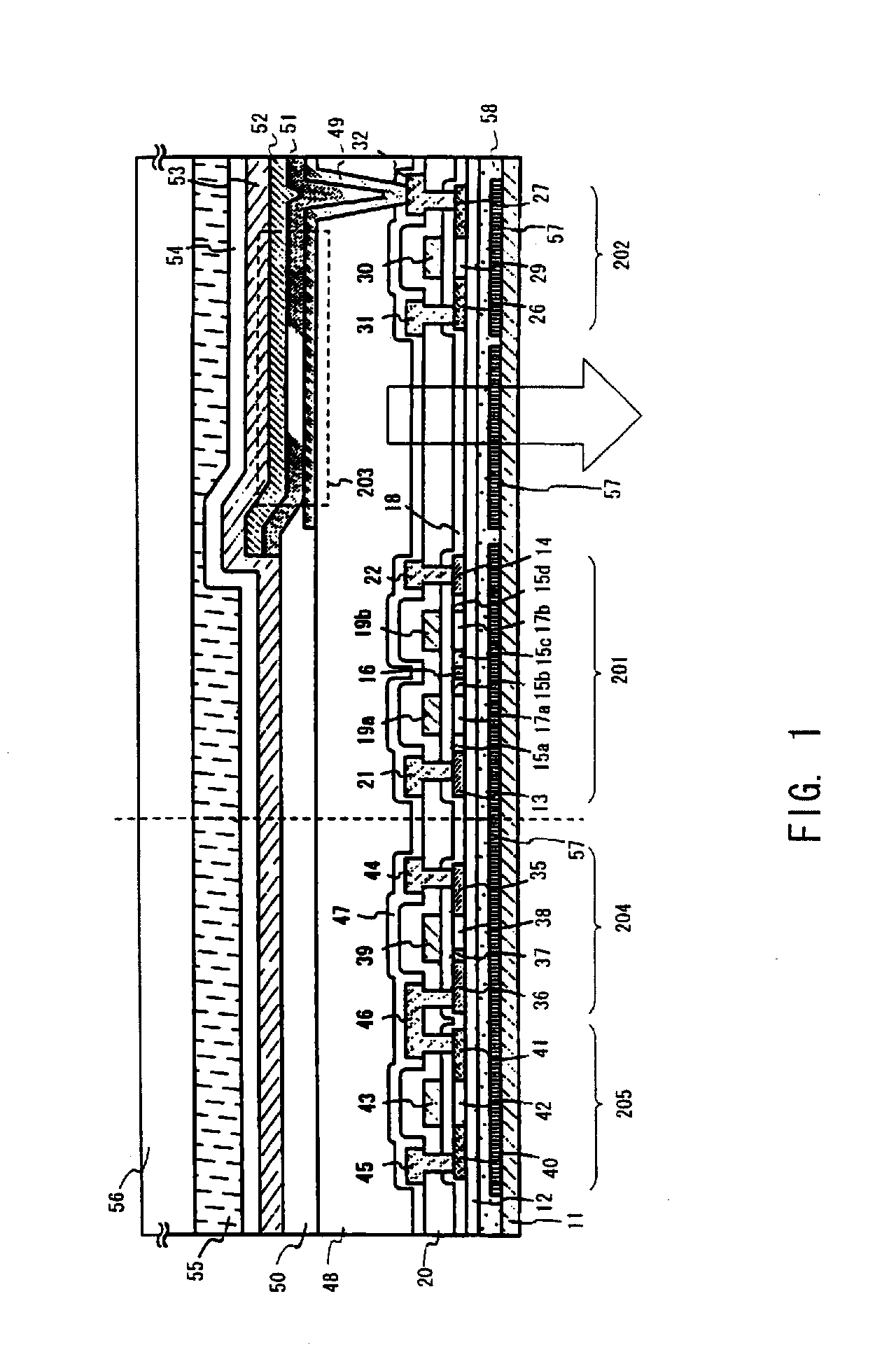 Then, the underlayer 102 is attached to a second substrate (plastic substrate) 1108 using an adhesive layer 1107 (FIG. 12). In the pixel portion on the second substrate (plastic substrate) 1108, R, G, and B color filters 1106 are arranged with regard to each pixel electrode. Further, for the purpose of shielding from light, a red color filter is arranged so as to be aligned with the respective TFTs. It is to be noted that the pixel portion illustrated in FIG. 12 is of a red (R) pixel. FIG. 13 illustrates an exemplary structural view in section of the pixel portion in case of a green (G) or blue (B) pixel. A red color filter 1106a is aligned with the TFTs and a green (G) or blue (B) color filter 1106b is aligned with an opening 1109.