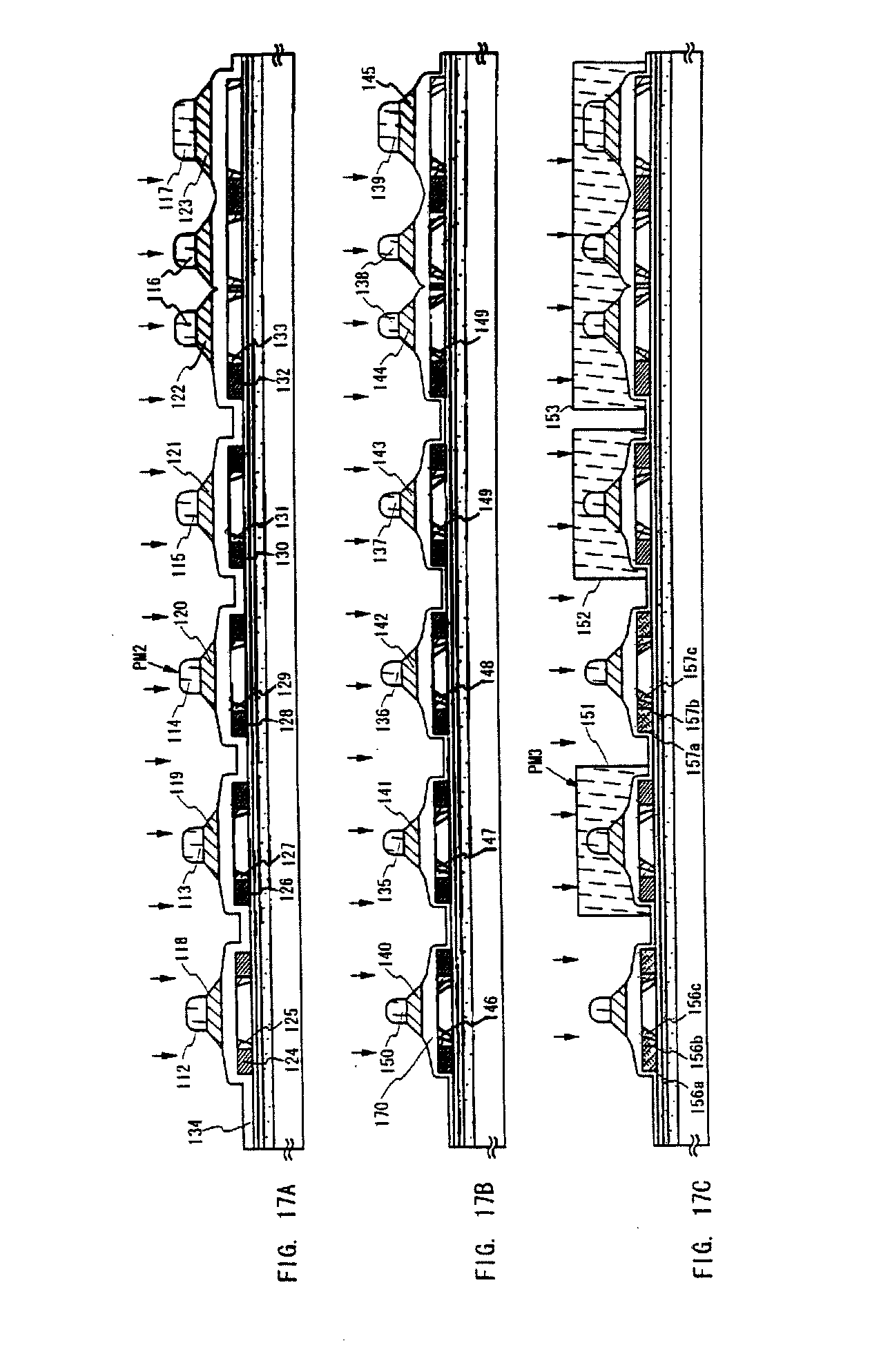 Then, impurity regions 156a to 156c and 157a to 157c of the opposite conductive type to the one conductive type are formed in the island-like semiconductor layers 104 and 106 forming the p-channel TFTs, respectively. In this case also, with the conductive layers 140 and 142 having the second tapered shape being as the mask, an impurity element for the p type is doped to form impurity regions in a self-aligning manner. Here, the whole of the island-like semiconductor layers 105, 107, and 108 forming the n-channel TFTs are covered by forming resist masks 151-153 using a third photomask (PM3). The impurity regions 156 and 157 formed here are formed by ion doping using diborane (B2H6) such that the concentration of the impurity element for the p type in the impurity regions 156 and 157 is 2×1020 to 2×1021 atoms/cm3.
