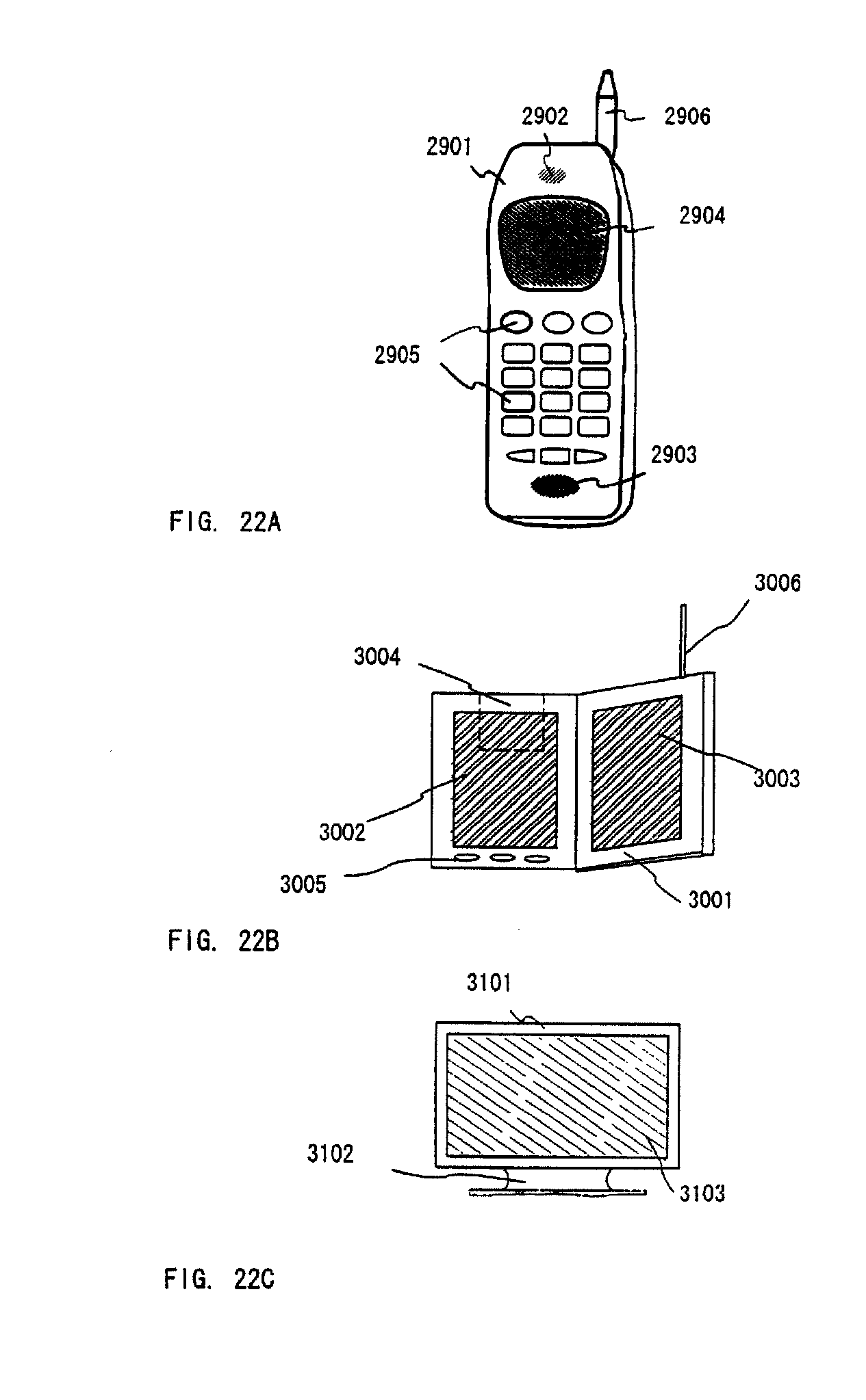 FIG. 22C is a display, and it includes a main body 3101, a support stand 3102, and a display section 3103, etc. The present invention can be applied to the display section 3103. The display of the present invention is advantageous for a large size screen in particular, and is advantageous for a display equal to or greater than 10 inches (especially equal to or greater than 30 inches) in the opposite angle.