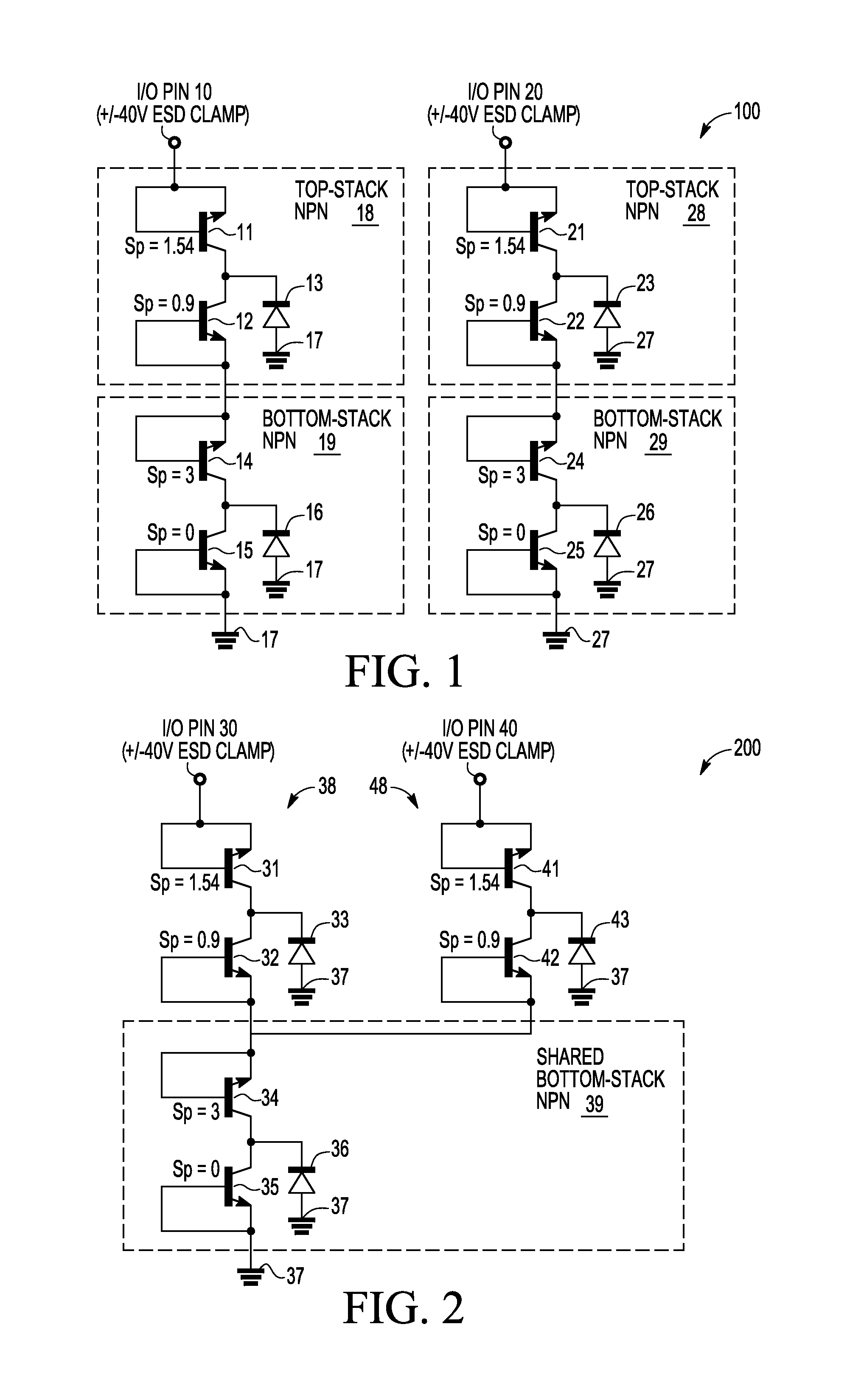a first NPN stack having a first terminal coupled to a first signal pin and a second terminal coupled to a first circuit node; a second NPN stack having a first terminal coupled to a second signal pin and a second terminal coupled to the first circuit node; and a first shared NPN stack having a first terminal coupled to the first circuit node and second terminal coupled to a second circuit node that is directly or indirectly connected to a reference voltage terminal. 17. The stacked ESD protection circuit of 18. The stacked ESD protection circuit of 19. The stacked ESD protection circuit of 20. The stacked ESD protection circuit of 21. The stacked ESD protection circuit of 22. The stacked ESD protection circuit of a third NPN stack having a first terminal coupled to a third signal pin and second terminal coupled to the second circuit node; and a second shared NPN stack having a first terminal coupled to the second circuit node and a second terminal coupled to a third circuit node that is directly or indirectly connected to the reference voltage terminal, where the third NPN stack and second shared NPN stack are connected in series to form a third dual polarity ESD clamp for protecting the third signal pin. 23. A method comprising: