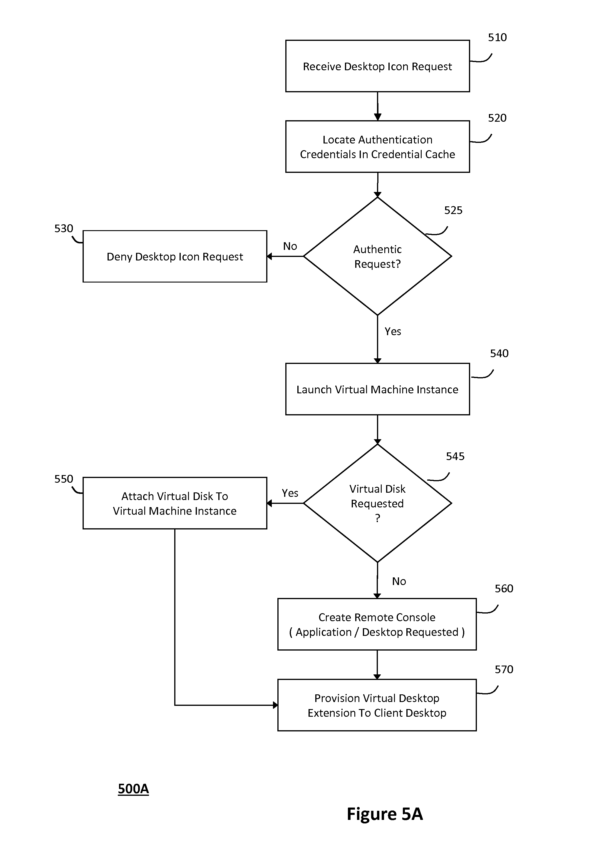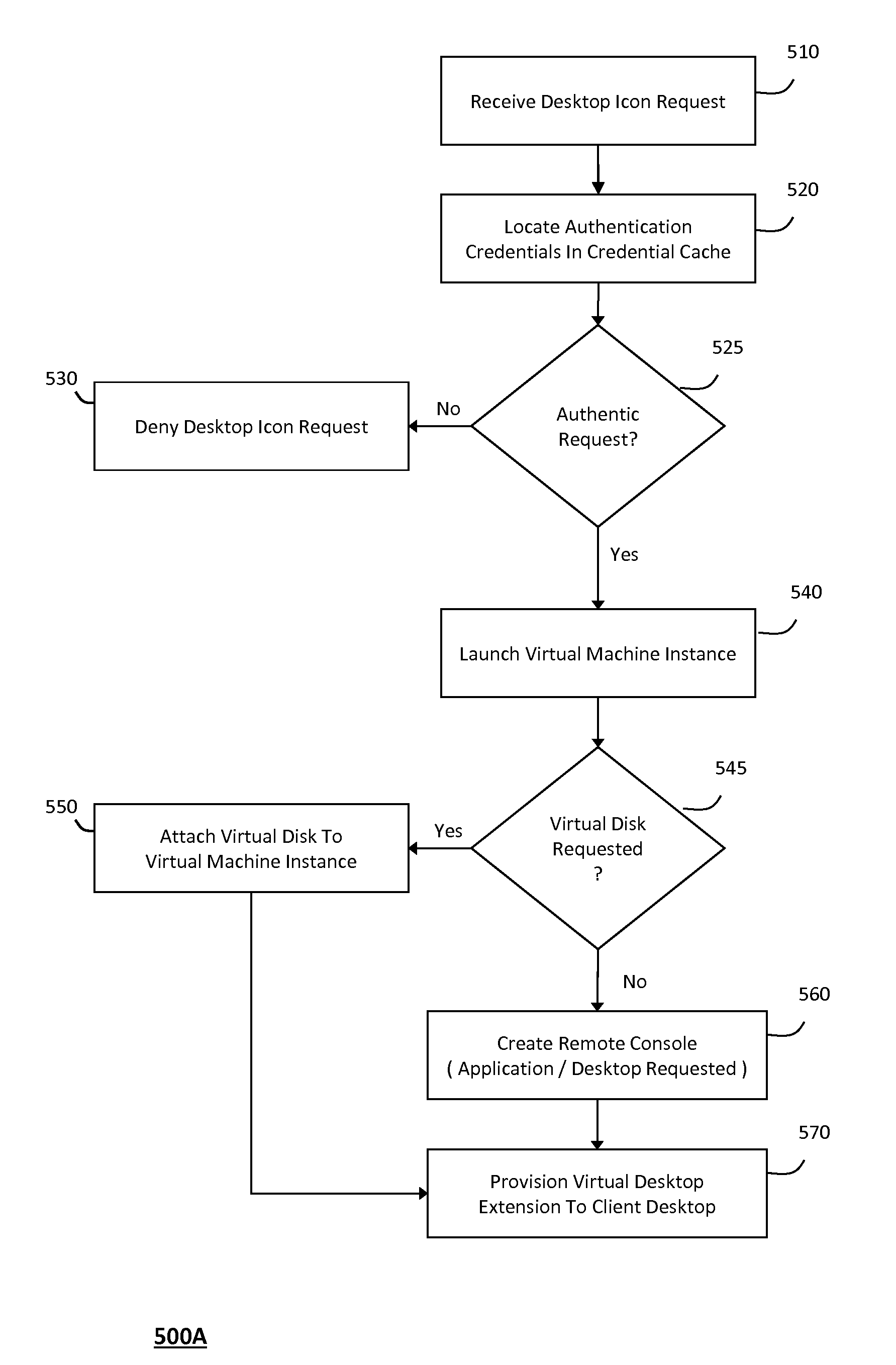 According to one aspect of the invention, FIG. 5A illustrates a flow diagram of an exemplary method 500A for servicing desktop icon requests in the system for providing virtual desktop extensions on a client desktop. More particularly, in response to installing the local application and the virtual desktop extension manager to initially configure the system (e.g., as described in further detail above with reference to FIG. 4), the client desktop may then request any virtual desktop extension available in the cloud (e.g., an application server that runs a certain application on a hosted virtual machine, a virtual desktop that provides a complete desktop environment on a hosted virtual machine, a personal disk that stores data on a virtual disk attached to a hosted virtual machine, etc.).