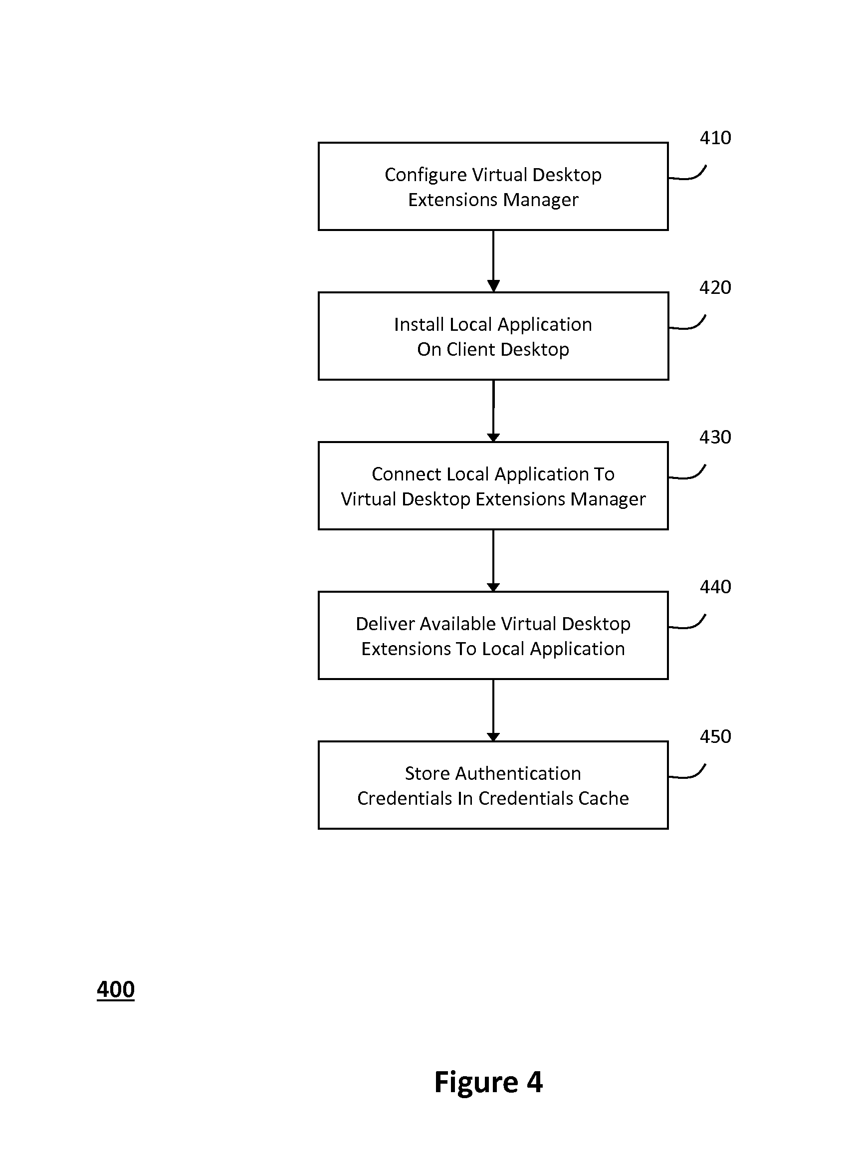 Additionally, in one implementation, the initialization method 400 may further include an operation 450, wherein the local application may encrypt the authentication credentials for the client desktop and then store the encrypted authentication credentials in a credential cache locally coupled to the client desktop. As such, the local application may then reference the encrypted authentication credentials in the credential cache to handle subsequent requests for virtual desktop extensions that the local application receives from the client desktop.