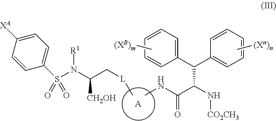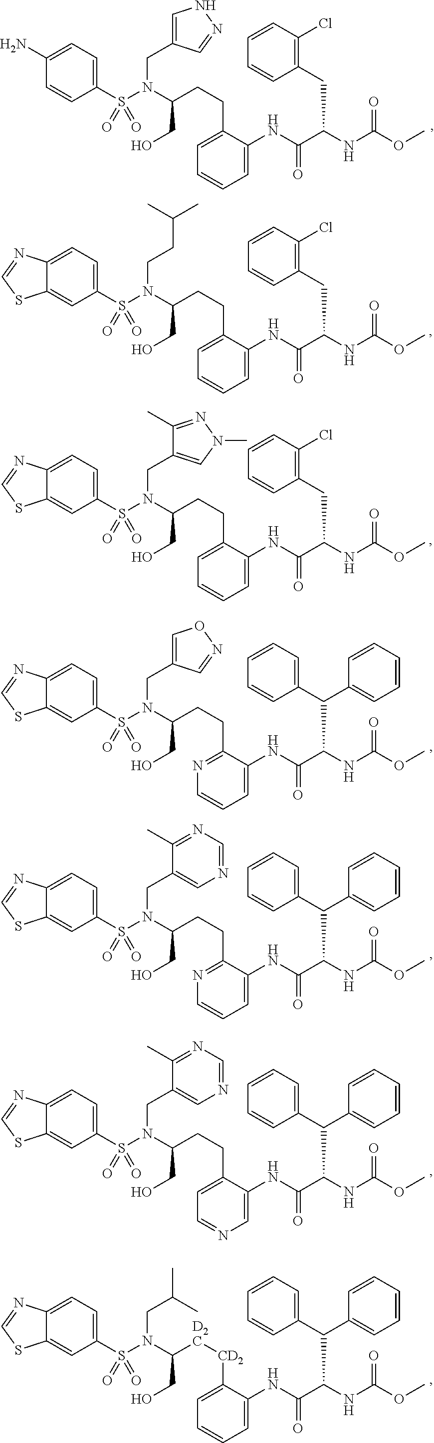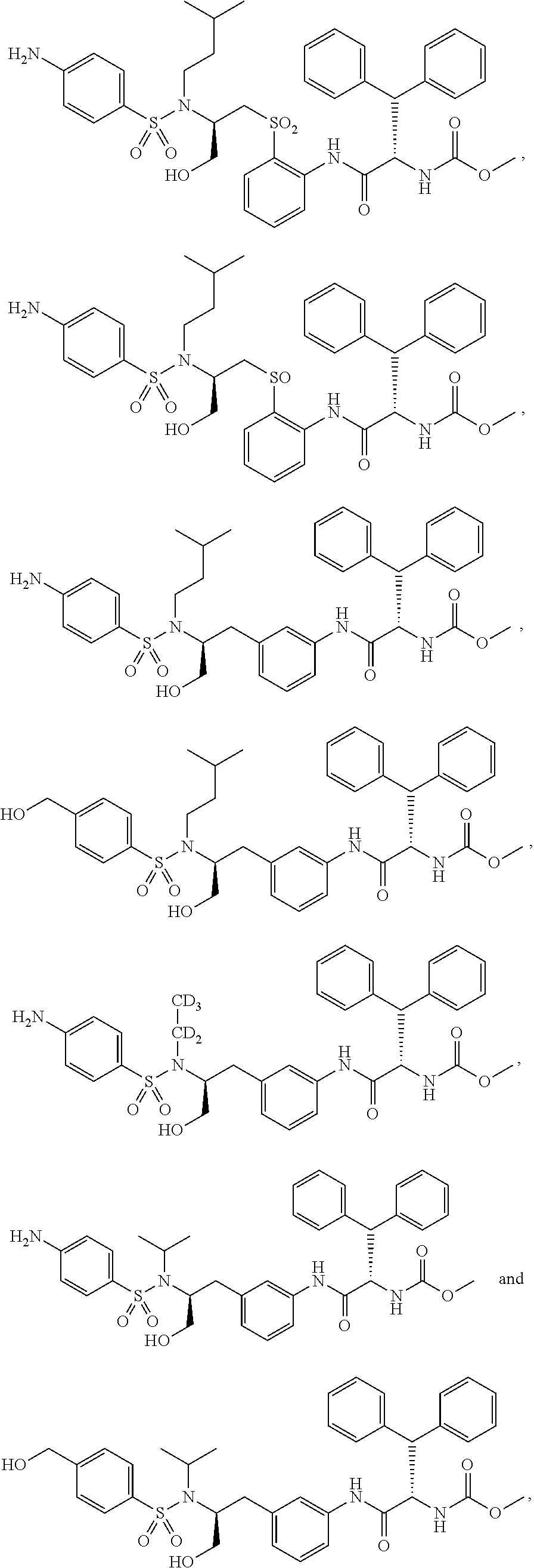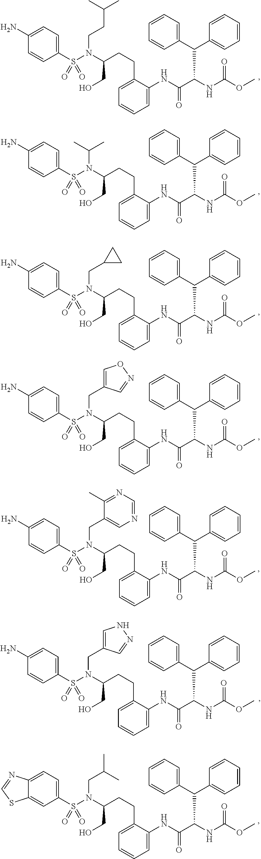 Antiviral Agents for Treating HIV infection or AIDS Name Type abacavir, ABC, Ziagen ® nRTI abacavir + lamivudine, Epzicom ® nRTI abacavir + lamivudine + zidovudine, Trizivir ® nRTI amprenavir, Agenerase ® PI atazanavir, Reyataz ® PI AZT, zidovudine, azidothymidine, Retrovir ® nRTI capravirine nnRTI darunavir, Prezista ® PI ddC, zalcitabine, dideoxycytidine, Hivid ® nRTI ddI, didanosine, dideoxyinosine, Videx ® nRTI ddI (enteric coated), Videx EC ® nRTI delavirdine, DLV, Rescriptor ® nnRTI efavirenz, EFV, Sustiva ®, Stocrin ® nnRTI efavirenz + emtricitabine + tenofovir DF, Atripla ® nnRTI + nRTI emtricitabine, FTC, Emtriva ® nRTI emtricitabine + tenofovir DF, Truvada ® nRTI emvirine, Coactinon ® nnRTI enfuvirtide, Fuzeon ® FI enteric coated didanosine, Videx EC ® nRTI etravirine, TMC-125 nnRTI fosamprenavir calcium, Lexiva ® PI indinavir, Crixivan ® PI lamivudine, 3TC, Epivir ® nRTI lamivudine + zidovudine, Combivir ® nRTI lopinavir PI lopinavir + ritonavir, Kaletra ® PI maraviroc, Selzentry ® EI nelfinavir, Viracept ® PI nevirapine, NVP, Viramune ® nnRTI PPL-100 (also known as PL-462) (Ambrilia) PI raltegravir, MK-0518, Isentress ™ InI ritonavir, Norvir ® PI saquinavir, Invirase ®, Fortovase ® PI stavudine, d4T,didehydrodeoxythymidine, Zerit ® nRTI tenofovir DF (DF = disoproxil fumarate), TDF, nRTI Viread ® tipranavir, Aptivus ® PI EI = entry inhibitor; FI = fusion inhibitor; InI = integrase inhibitor; PI = protease inhibitor; nRTI = nucleoside reverse transcriptase inhibitor; nnRTI = non-nucleoside reverse transcriptase inhibitor. Some of the drugs listed in the table are used in a salt form; e.g., abacavir sulfate, indinavir sulfate, atazanavir sulfate, nelfinavir mesylate. PREPARATIVE EXAMPLES
