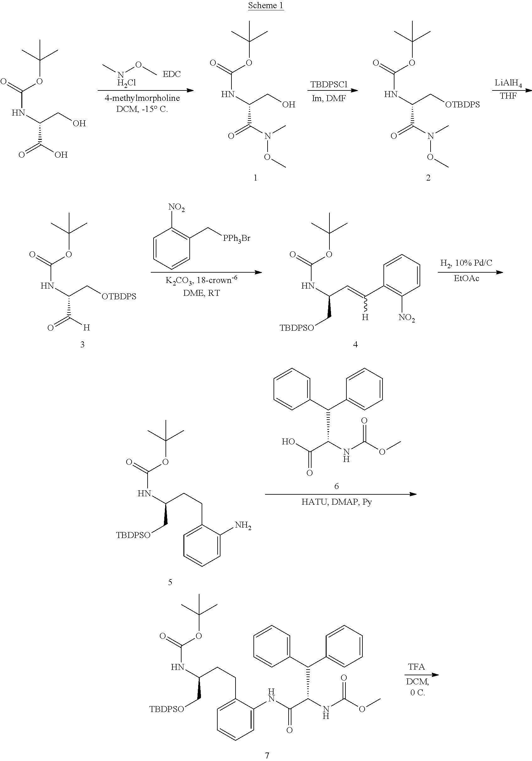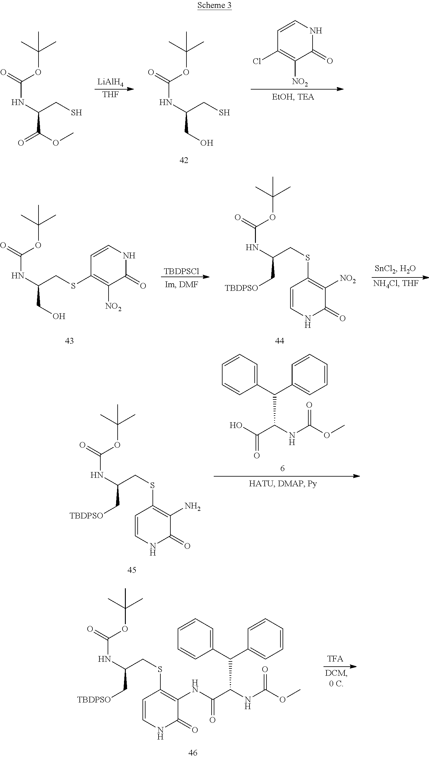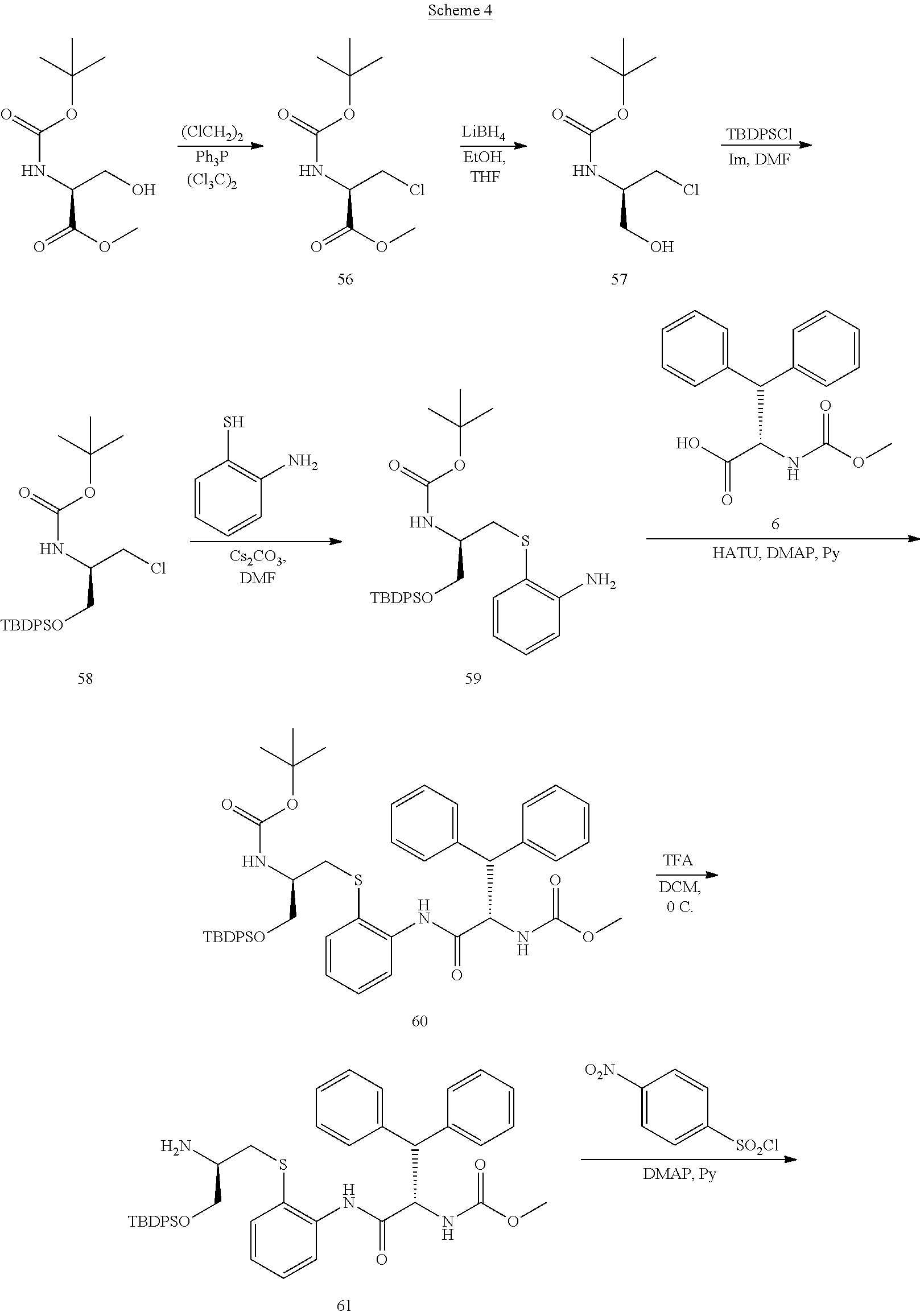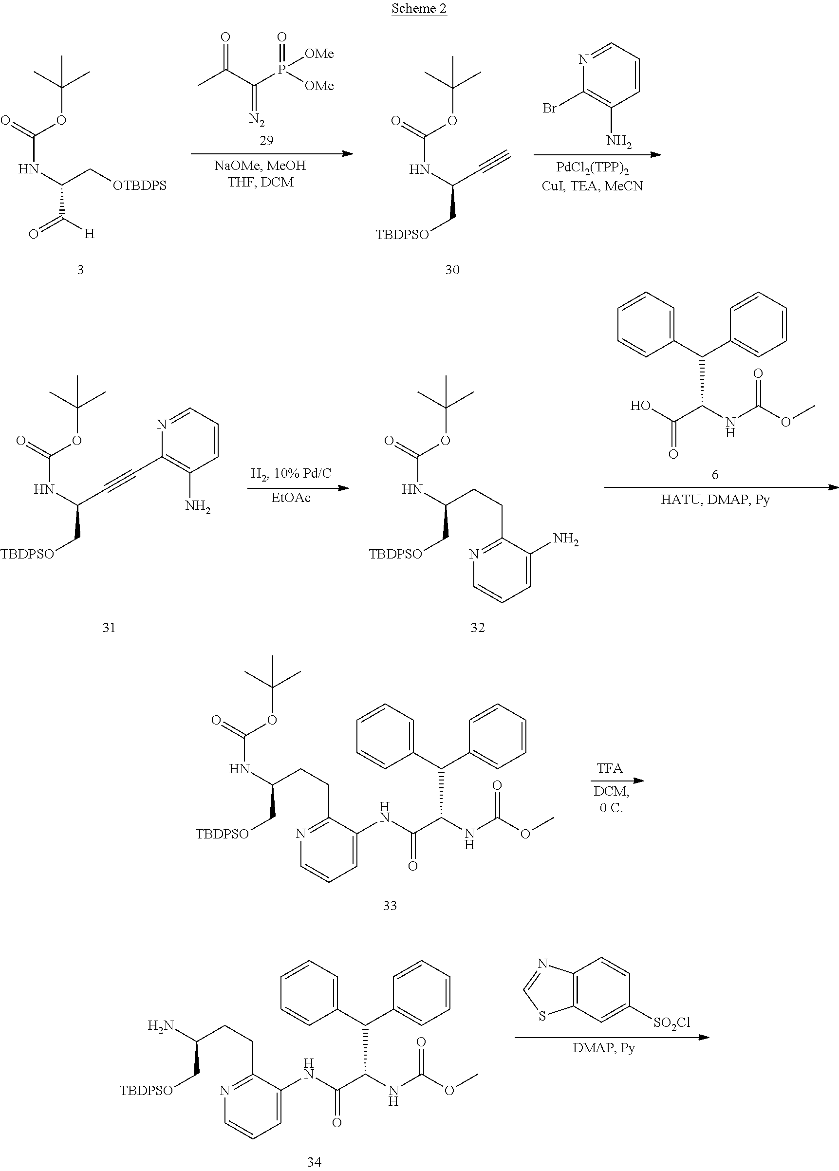 Antiviral Agents for Treating HIV infection or AIDS Name Type abacavir, ABC, Ziagen ® nRTI abacavir + lamivudine, Epzicom ® nRTI abacavir + lamivudine + zidovudine, Trizivir ® nRTI amprenavir, Agenerase ® PI atazanavir, Reyataz ® PI AZT, zidovudine, azidothymidine, Retrovir ® nRTI capravirine nnRTI darunavir, Prezista ® PI ddC, zalcitabine, dideoxycytidine, Hivid ® nRTI ddI, didanosine, dideoxyinosine, Videx ® nRTI ddI (enteric coated), Videx EC ® nRTI delavirdine, DLV, Rescriptor ® nnRTI efavirenz, EFV, Sustiva ®, Stocrin ® nnRTI efavirenz + emtricitabine + tenofovir DF, Atripla ® nnRTI + nRTI emtricitabine, FTC, Emtriva ® nRTI emtricitabine + tenofovir DF, Truvada ® nRTI emvirine, Coactinon ® nnRTI enfuvirtide, Fuzeon ® FI enteric coated didanosine, Videx EC ® nRTI etravirine, TMC-125 nnRTI fosamprenavir calcium, Lexiva ® PI indinavir, Crixivan ® PI lamivudine, 3TC, Epivir ® nRTI lamivudine + zidovudine, Combivir ® nRTI lopinavir PI lopinavir + ritonavir, Kaletra ® PI maraviroc, Selzentry ® EI nelfinavir, Viracept ® PI nevirapine, NVP, Viramune ® nnRTI PPL-100 (also known as PL-462) (Ambrilia) PI raltegravir, MK-0518, Isentress ™ InI ritonavir, Norvir ® PI saquinavir, Invirase ®, Fortovase ® PI stavudine, d4T,didehydrodeoxythymidine, Zerit ® nRTI tenofovir DF (DF = disoproxil fumarate), TDF, nRTI Viread ® tipranavir, Aptivus ® PI EI = entry inhibitor; FI = fusion inhibitor; InI = integrase inhibitor; PI = protease inhibitor; nRTI = nucleoside reverse transcriptase inhibitor; nnRTI = non-nucleoside reverse transcriptase inhibitor. Some of the drugs listed in the table are used in a salt form; e.g., abacavir sulfate, indinavir sulfate, atazanavir sulfate, nelfinavir mesylate. PREPARATIVE EXAMPLES