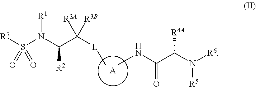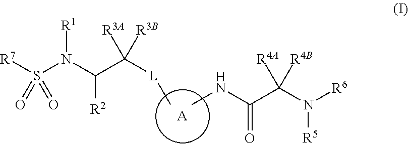 Compounds of Formula I are disclosed: wherein L, A, R1, R2, R3A, R3B, R4A, R4B, R5, R6 and R7 are defined herein. The compounds encompassed by Formula I include compounds which are HIV protease inhibitors and other compounds which can be metabolized in vivo to HIV protease inhibitors. The compounds and their pharmaceutically acceptable salts are useful for the prophylaxis or treatment of infection by HIV and the prophylaxis, treatment, or delay in the onset of AIDS. The compounds and their salts can be employed as ingredients in pharmaceutical compositions, optionally in combination with other antivirals, immunomodulators, antibiotics or vaccines.