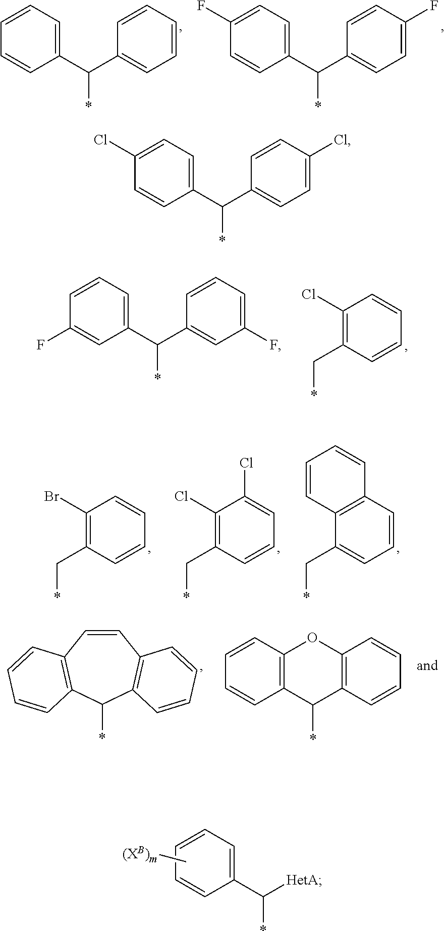 (a) C1-6haloalkyl, (b) OH (c) O—C1-6alkyl, (d) O—C1-6haloalkyl, (e) O—C3-6cycloalkyl, (f) SH, (g) S—C1-6alkyl, (h) halo, (i) CN, (j) NO2, (k) NH2, (l) N(H)—C1-6alkyl, (m) N(—C1-6alkyl)2, (n) C(O)—C1-6alkyl, (o) C(O)OH, (p) C(O)O—C16alkyl and (q) SO2—C1-6alkyl; each HetA is a heteroaryl which is independently (i) a 5- or 6-membered heteroaromatic ring containing from 1 to 4 heteroatoms independently selected from N, O and S, or (ii) is a fused, 9- or 10-membered heterobicyclic ring containing from 1 to 4 heteroatoms independently selected from N, O and S, and wherein at least one of the rings is aromatic, each N in a ring is optionally in the form of an oxide, and each S is optionally S(O) or S(O)2; wherein the heteroaromatic ring (i) or the heterobicyclic ring (ii) is unsubstituted, or substituted with from 1 to 4 YCwherein each YCis independently selected from the group consisting of:
