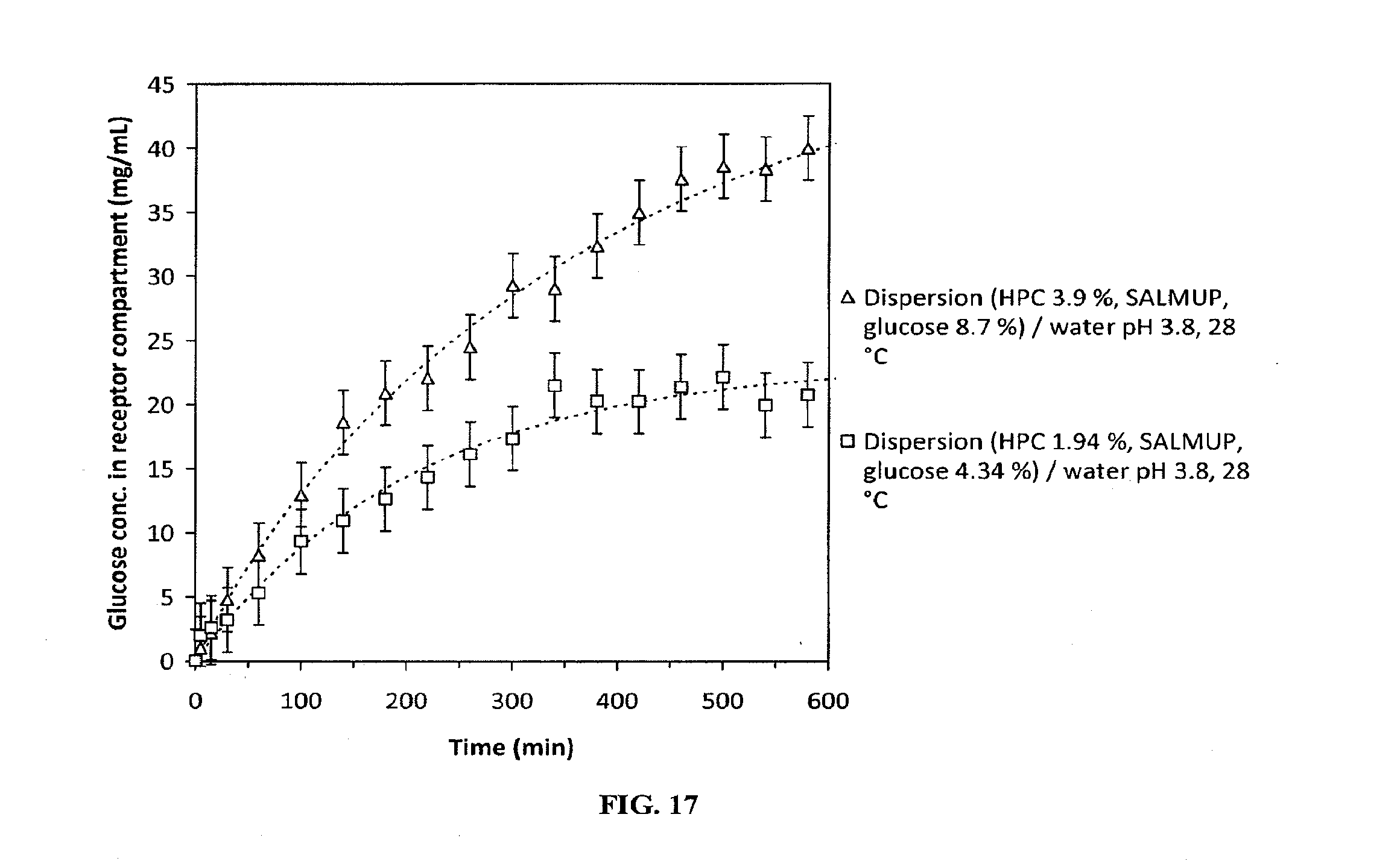 tbaseline (mg- texp (mg- Cb Formulation (min) min/dL) (min) min/dL) (mg/dL) Experiments in which subject remained seated HPC 4.2 wt %, glucose 8.7 167 2355 230 2000 8.7 wt % (Example 2.13) GATORADE ® (sugars 50 1274 230 255 1.1 5.8 wt %) (Example 2.13) HPC 2.6 wt %, glucose 5.1 75 1447 230 458 2.0 wt % (Example 2.14) HPC 2.6 wt %, glucose 1.3 99 431 230 1218 5.3 wt %, fructose 3.8 wt % (Example 2.15) HPC 4.2 wt %, glucose 9.8 115 1466 213 4489 21.1 wt % (Example 2.16) Glucose solution (10 wt % 61 1409 160 1248 7.8 concentration) (Example 2.16) HPC 4.2 wt %, glucose 9.8 132 1856 160 1635 10.2 wt %; dispersion ingested in three equal parts (Example 2.17) GATORADE ® (sugars 102 961 160 760 4.8 5.8 wt %); ingested in three equal parts (Example 2.18) Experiments in which subject ran on a treadmill at 60% V o2max HPC 4.2 wt %, dextrose 78 800 159 926 5.8 8.7 wt % (Example 2.19) GATORADE ® + dextrose 71 400 116 328.0 2.8 (sugars 10 wt %) (Example 2.19) Water (Example 2.19) 54 ~−93 98 ~229 ~−2.3 REFERENCES