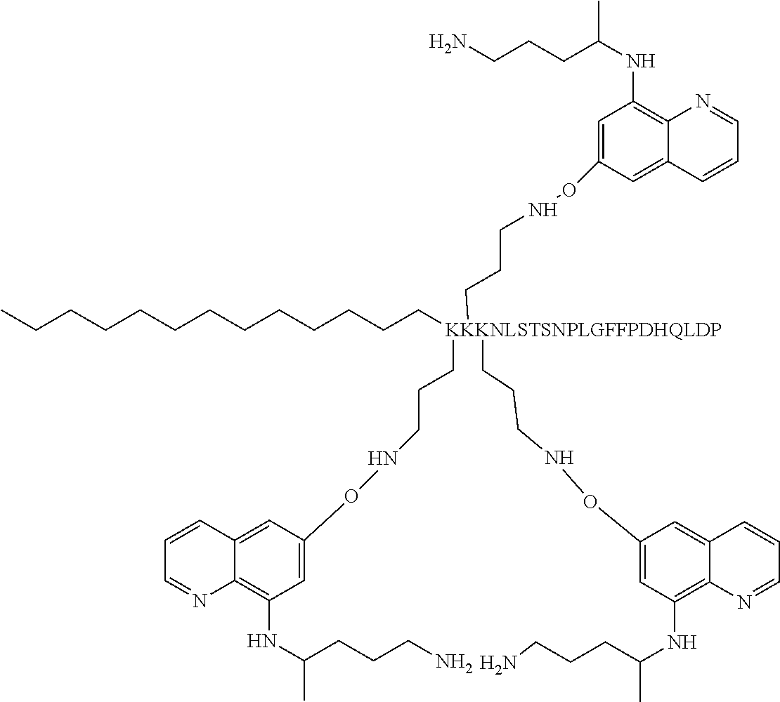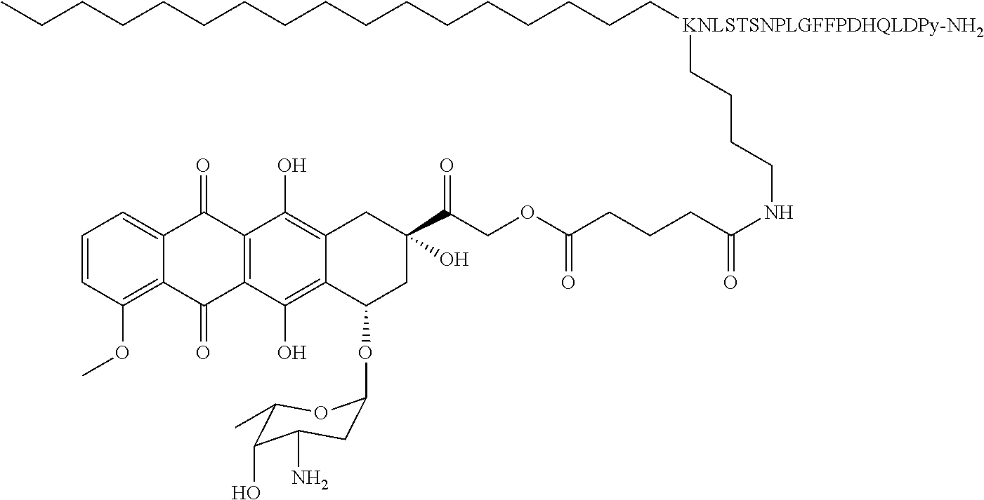 Preferred hydrophobic modified peptides Hydrophobic modified Peptide Coupled Agent Application stearoyl-[K(Primaquine)]3- Primaquine Treatment of Malaria Tertia NLSTSNPLGFFPDHQLDP myristoyl-[K(Doxocyclin)]3- Doxocyclin Treatment of MMP7 NLSTSNPLGFFPDHQLDP overexpressing neoplastic alterations in the liver myristoyl-[K(Penicillin)]3- Penicillin Treatment of bacterial NLSTSNPLGFFPDHQLDP infections in the liver stearoyl-[K(RPLALWRS- Velcade ™ Inhibition of neoangiogenesis Velcade ™]3- NLSTSNPLGFFPDHQLDP myristoyl- Rapamune ™ For the treatment of patients [K(Rapamune ™)]3- preceding and following liver NLSTSNPLGFFPDHQLDP transplantation myristoyl- Cyclosporine ™ For the treatment of patients [K(Cyclosporine)]3- preceding and following liver NLSTSNPLGFFPDHQLDP transplantation stearoyl- Thiazolidinedione Treatment of Diabetis [K(Thiazolidinedione)]3- (glitazones) Mellitus Type 2, Steatosis NLSTSNPLGFFPDHQLDP and neoangiogenesis in the liver stearoyl-[K(Nexavar ™)]3- Nexavar ™ Inhibition of neoangiogenesis NLSTSNPLGFFPDHQLDP in the liver Myristoyl-[K-Doxorubicin]- Doxorubicin First line drug for primary NLSTSNPLGFFPDHQLDP HCC; anti-malaria drug Myristoyl-[K-Levofloxacin]- Levofloxacin Treatment of Malaria Tertia NLSTSNPLGFFPDHQLDP by inhibition of the liver stage of malaria stearoyl-[K(Primaquine)]3- Primaquine Treatment of Malaria Tertia NLSTSNPLGFFPDHQLPD myristoyl-[K(Doxocyclin)]3- Doxocyclin Treatment of MMP7 NLSTSNPLGFFPDHQLPD overexpressing neoplastic alterations in the liver myristoyl-[K(Penicillin)]3- Penicillin Treatment of bacterial NLSTSNPLGFFPDHQLPD infections in the liver stearoyl-[K(RPLALWRS- Velcade ™ Inhibition of neo Velcade ™)]3- angiogenesis NLSTSNPLGFFPDHQLPD myristoyl- Rapamune ™ For the treatment of patients [K(Rapamune ™)]3- preceding and following liver NLSTSNPLGFFPDHQLPD transplantation myristoyl- Cyclosporine ™ For the treatment of patients [K(Cyclosporine)]3- preceding and following liver NLSTSNPLGFFPDHQLPD transplantation stearoyl- Thiazolidinedione Treatment of Di ab eti s [K(Thiazolidinedione)]3- (glitazones) Mellitus Type 2, Steatosis NLSTSNPLGFFPDHQLPD and neoangiogenesis in the liver stearoyl-[K(Nexavar ™)]3- Nexavar ™ Inhibition of neoangiogenesis NLSTSNPLGFFPDHQLPD in the liver myr refers to myristoylation of the N-terminus; palm refers to palmitoylation of the N-terminus; stearoyl refers to stearoylation of the N-terminus; BRIEF DESCRIPTION OF THE FIGURES