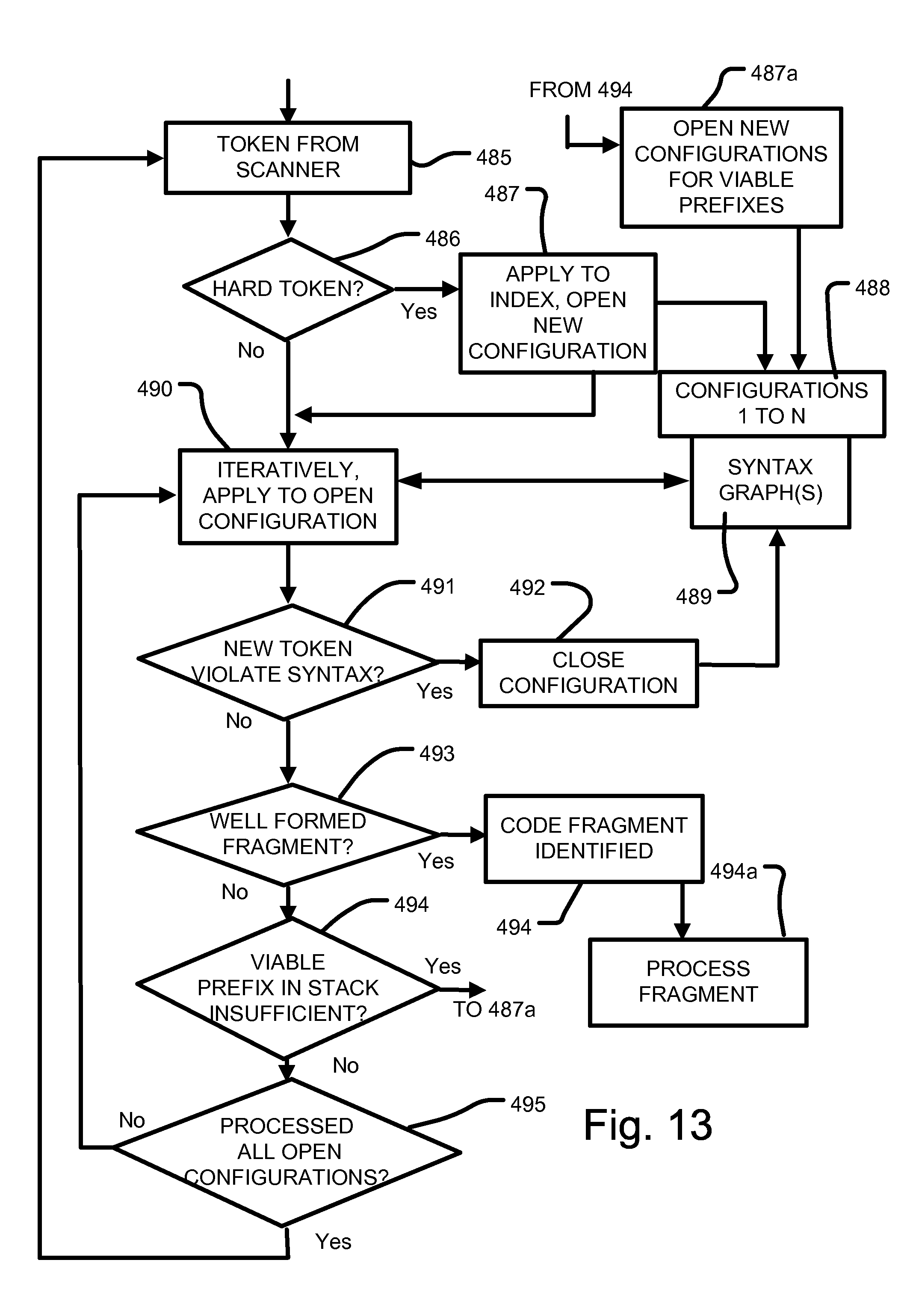 3. Uppercase letters late in the alphabet, such as X, Y, Z, represent grammar symbols; that is, either nonterminals or terminals. 4. Lowercase letters late in the alphabet, chiefly u, v, . . . , z, represent (possibly empty) strings of terminals. 5. Lowercase Greek letters, α, β, γ for example, represent (possibly empty) strings of grammar symbols. Thus, a generic production can be written as A→α, where A is the head and α the body. 6 A set of productions A→α1, A→α2, . . . , A→αkwith a common head A (call them A productions), may be written A→α1|α2| . . . , αk. Call α1, α2, . . . , αkthe alternatives for A. 7. Unless stated otherwise, the head of the first production is the start symbol. In this embodiment the fragment detector is based on a pushdown machine, which can be characterized by the “Action” table in The fragment detector constructs the initial set of configurations by indexing into the syntax graph selecting the columns (e.g. in the go to table of The pushdown machine executes, in series or parallel, starting with all of the initial configurations, adding new configurations as necessary, until every active configuration reaches an error or finish state. If any of the final configurations have processed sufficient tokens according to the fragment detection rule applied, a detection event is reported based on the largest number of tokens processed in the set of final configurations. As an optimization, some embodiments may report a detection as soon as one configuration exists where a sufficient number of tokens have been processed. The operation of the fragment detector in this embodiment differs from a typical pushdown machine significantly regarding reduce operations. For example, processing of initial configuration 5 (presumed state 34) encounters a reduce action after the first move as shown in If more than one viable prefix state exists, the current configuration is replaced by a set of new configurations, one for each distinct viable prefix state. The fragment detector repeats this process until the relevant configurations are all of sufficient length to permit the reduce operation to be performed. In this example, it only finds one viable prefix resulting in the new configuration ((20, 30, 34, 36), txvxs$, 1) and it performs the reduction yielding the new configuration ((20, 27), txvxs$, 1) and processing continues. Embodiments may process configurations sequentially or in parallel. The order of the steps shown in The data processing resources include logic implemented as computer programs stored in memory 501 for an exemplary system, including a scanner, a parser and a communications handler. In alternatives, the logic can be implemented using computer programs in local or distributed machines, and can be implemented in part using dedicated hardware or other data processing resources. An article of manufacture comprising a non-transitory machine readable data storage medium, such as an integrated circuit memory or a magnetic memory, can include executable instructions for a computer program stored thereon, the executable instructions comprising: logic to buffer a data flow received at an interface; logic to scan the data flow to detect well-formed code fragments expressed in at least one computer readable programming language; logic to process the detected fragments; and logic to forward the data flow from the buffer to a destination. The logic to scan the data flow implemented by executable instructions in the article of manufacture, detects tokens that represent candidate code elements, and including logic to parse the tokens in the data flow according to a syntax graph stored in a data structure, the syntax graph encoding a syntax for a computer programming language, to identify sequences of candidate code elements which satisfy the syntax graph. The syntax graph data structure encodes syntaxes for a plurality of programming languages. Also, in the article of manufacture, the memory can store the indexed syntax graph. Rather than attempt to approximate an answer to the question of whether some given input contains shell code, a code finder system as described herein can take advantage of the fact that both executable and interpreted code are designed to be machine readable. Similarly, a code finder system as described herein takes advantage of the fact that well-formed code is difficult to construct. When compared to unstructured user input or most data formats, the likelihood of the accidental presence of well-formed code is infinitesimal. In short, a code finder system as described herein can be configured to deterministically and definitively recognize the presence of shell code within a data flow used to provide system input with minimal risk of misidentification. Also, a code finder system need not be concerned with unambiguously differentiating a particular statement from another statement. Since statements are not translated and executed by the code finder system, intra- or inter-language ambiguity is not a factor in some embodiments. In these embodiments recognition logic can be simplified, as any match is sufficient to invoke processing of a suspected code fragment. A code finder system is described that can recognize multiple programming languages simultaneously. This, when combined with the inherent structured nature of machine readable programming languages, enables recognition to occur quickly enough to be useful for monitoring data flows in a communications channel. A code finder system may be deployed as a software module, a web service or as part of a larger security system. For a data flow that is expected to be free of executable or interpreted code, or free of one or more known styles of executable or interpreted code, the code finder system can be deployed to protect participants in the communications network from undesired code. Examples of payload carried by data flows that can be monitored include, but are not limite
