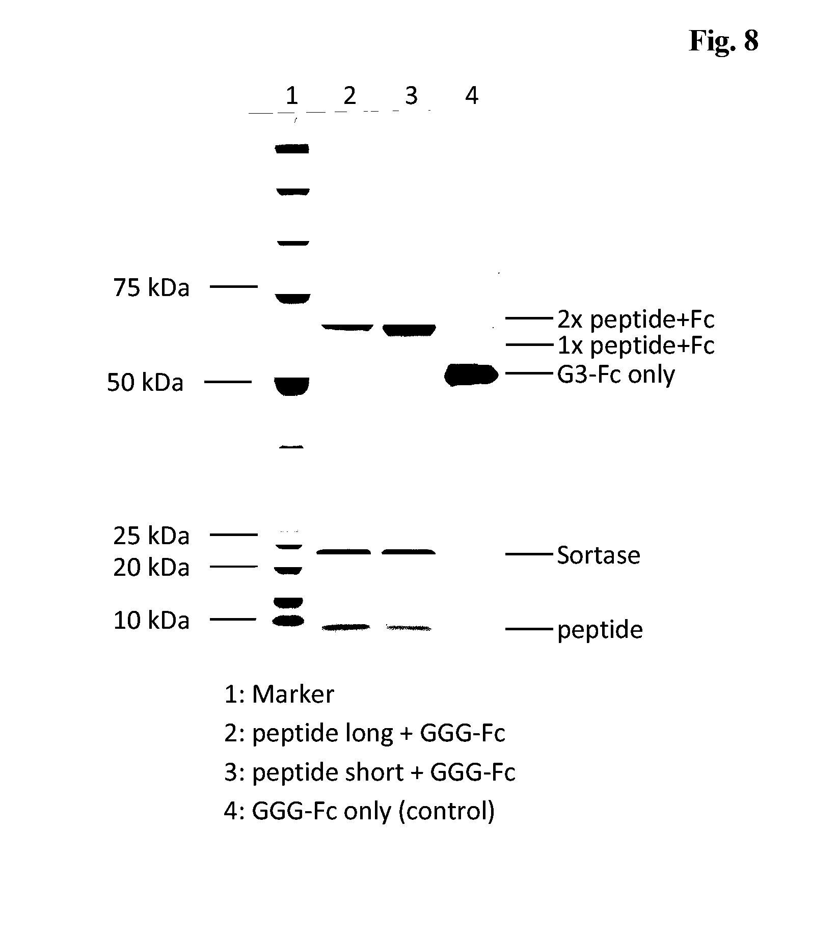 Conjugation of Fc-regions with peptide conc. conc. conc. Fc peptide time temp SrtA Fc peptide 1 G3-Fc long 3 h 37° C. 10 μmol/l 12.5 μmol/l 100 μmol/l 2 G3-Fc short 24 h 37° C. 10 μmol/l 12.5 μmol/l 100 μmol/l 3 G4S3-Fc long 3 h 37° C. 10 μmol/l 12.5 μmol/l 100 μmol/l 4 G4S3-Fc short 24 h 37° C. 10 μmol/l 12.5 μmol/l 100 μmol/l Analysis of Sortase-Mediated Transpeptidation