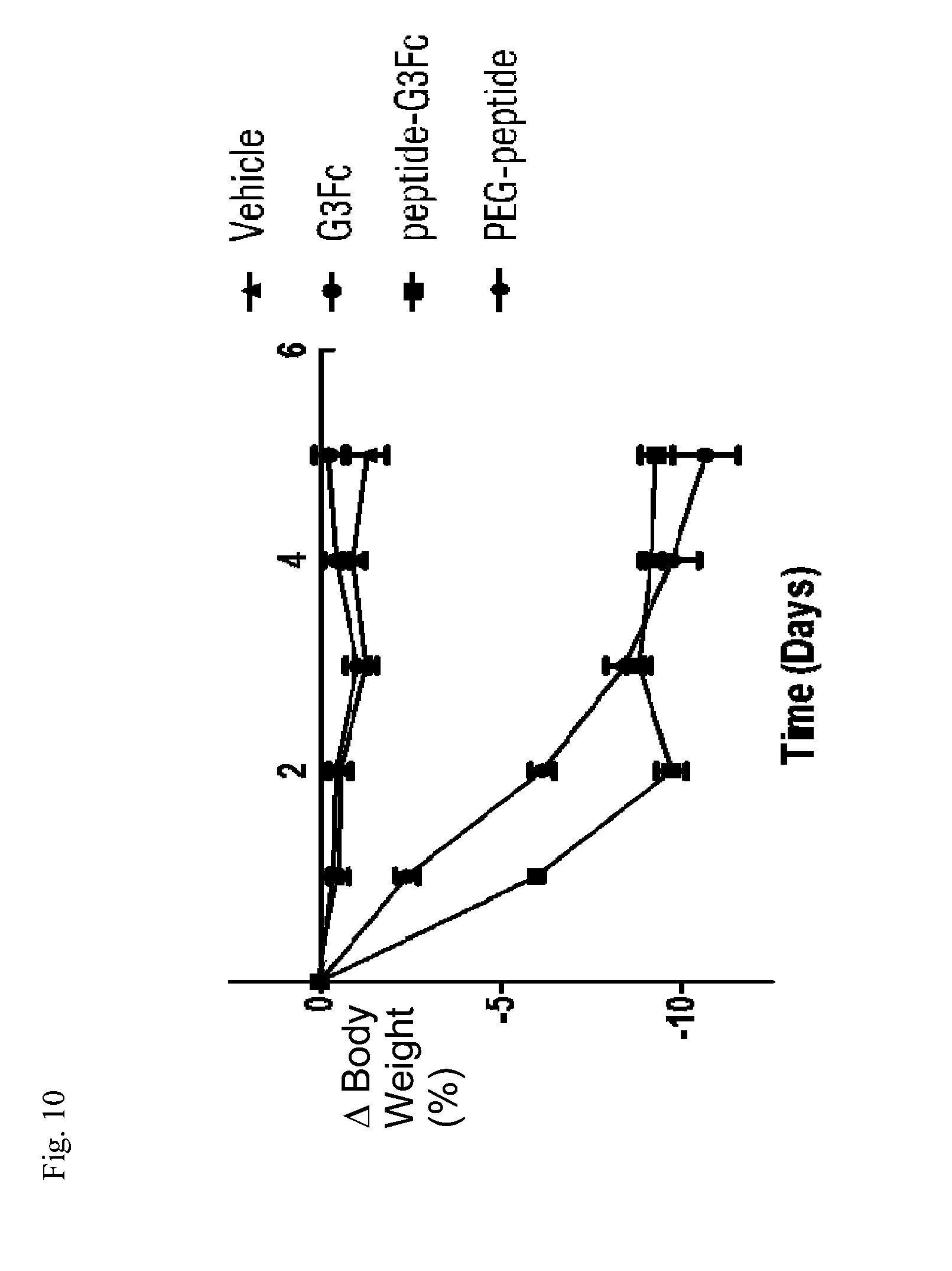 Efficiency of sortase-mediated transpeptidation of peptides with G3-Fc long peptide short peptide 2x peptide + G3-Fc [%] 87.00 90.75 1x peptide + G3-Fc [%] 6.91 6.51 non-ligated G3-Fc [%] 6.09 2.73 in vitro efficacy of peptide-Fc fusion molecules generated by sortase-mediated transpeptidation GIP-RE GLP1-RE Compound C50[nM] C50[nM] GIP 0.058 — GLP1 — 0.005 PEG-peptide long 7.508 3.893 G3Fc only >600 >600 peptide-long-G3Fc 1.022 0.263 peptide-short-G3Fc 1.921 0.697 Example 10