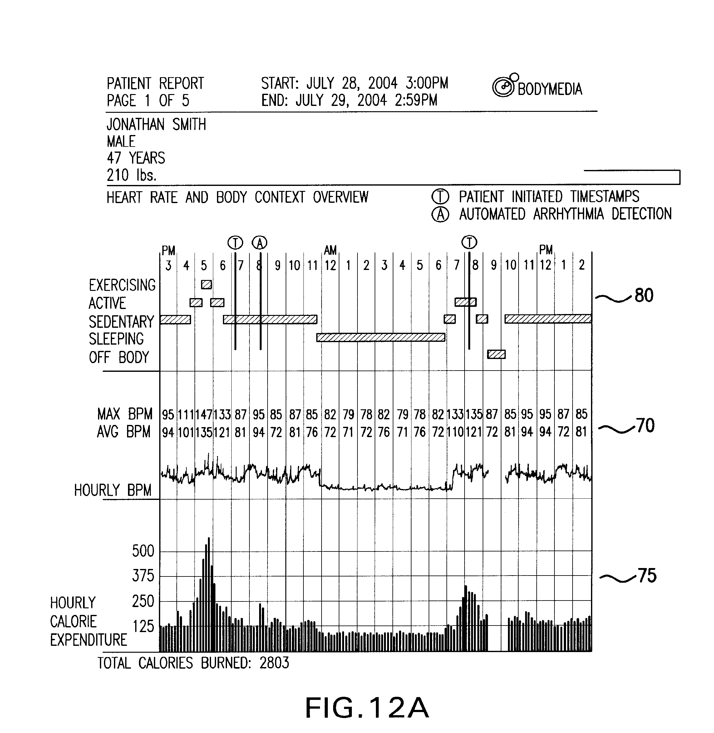 A Tricep Deltoid B Tricep Deltoid (top) C Right Trapezius Left Trapezius D Lower External Oblique Upper External Oblique E Upper External Oblique Lower Pectoralis F Latissimus Dorsi Upper External Oblique G Upper External Oblique Upper External Oblique H Gluteus Maximus Lower External Oblique I Inguinal Ligament Lower External Oblique J Lower Lateral Oblique Rectus Femoris JJ Inguinal Ligament Rectus Femoris K Rhomboid Major Latissimus Dorsi L Latissimus Dorsi Latissimus Dorsi LL Thoracumbular Fascia Latissimus Dorsi M Left Pectoralis Deltoid N Latissimus Dorsi Upper External Oblique O Lower Trapezius Right Lower Trapezius Left P Pectoralis Left Pectoralis Left Q Right Thigh Left Thigh R Right Bicep Right Pectoralis S Right Inguinal Ligament Left External Oblique T Upper External Oblique Left Arm U Gluteus Maximus Right Gluteus Maximus Left Heart Rate EKG 2 Electrodes DC Voltage Yes Pulse Rate BVP LED Emitter and Change in Resistance Yes Optical Sensor Beat-to-Beat Heart Rate 2 Electrodes DC Voltage Yes Variability EKG Skin Surface 3-10 Electrodes DC Voltage No Potentials Respiration Rate Chest Volume Strain Gauge Change in Resistance Yes Change Skin Temperature Surface Thermistors Change in Resistance Yes Temperature Probe Core Temperature Esophageal or Thermistors Change in Resistance Yes Rectal Probe Heat Flow Heat Flux Thermopile DC Voltage Yes Galvanic Skin Skin Conductance 2 Electrodes Change in Resistance No Response EMG Skin Surface 3 Electrodes DC Voltage No Potentials EEG Skin Surface Multiple Electrodes DC Voltage Yes Potentials EOG Eye Movement Thin Film DC Voltage Yes Piezoelectric Sensors Blood Pressure Non-Invasive Electronic Change in Resistance Yes Korotkuff Sounds Sphygromarometer Body Fat Body Impedance 2 Active Electrodes Change in Impedance Yes Activity in Body Movement Accelerometer DC Voltage, Yes Interpreted G Capacitance Changes Shocks per Minute Oxygen Oxygen Uptake Electro-chemical DC Voltage Change Yes Consumption Glucose Level Non-Invasive Electro-chemical DC Voltage Change Yes Body Position (e.g. N/A Mercury Switch DC Voltage Change Yes supine, erect, Array sitting) Muscle Pressure N/A Thin Film DC Voltage Change Yes Piezoelectric Sensors UV Radiation N/A UV Sensitive Photo DC Voltage Change Yes Absorption Cells Ovulation Skin temperature, core temperature, oxygen consumption Sleep onset/wake Beat-to-beat variability, heart rate, pulse rate, respiration rate, skin temperature, core temperature, heat flow, galvanic skin response, EMG, EEG, EOG, blood pressure, oxygen consumption Calories burned Heart rate, pulse rate, respiration rate, heat flow, activity, oxygen consumption Basal metabolic rate Heart rate, pulse rate, respiration rate, heat flow, activity, oxygen consumption Basal temperature Skin temperature, core temperature Activity level Heart rate, pulse rate, respiration rate, heat flow, activity, oxygen consumption Stress level EKG, beat-to-beat variability, heart rate, pulse rate, respiration rate, skin temperature, heat flow, galvanic skin response, EMG, EEG, blood pressure, activity, oxygen consumption Relaxation level EKG, beat-to-beat variability, heart rate, pulse rate, respiration rate, skin temperature, heat flow, galvanic skin response, EMG, EEG, blood pressure, activity, oxygen consumption Maximum oxygen consumption rate EKG, heart rate, pulse rate, respiration rate, heat flow, blood pressure, activity, oxygen consumption Rise time or the time it takes to rise Heart rate, pulse rate, heat flow, oxygen consumption from a resting rate to 85% of a target maximum Time in zone or the time heart rate was Heart rate, pulse rate, heat flow, oxygen consumption above 85% of a target maximum Recovery time or the time it takes heart Heart rate, pulse rate, heat flow, oxygen consumption rate to return to a resting rate after heart rate was above 85% of a target maximum Example personal age, sex, weight, gender, athletic ability, characteristics conditioning, disease, height, susceptibility to disease, activity level, individual detection, handedness, metabolic rate, body composition Example continual mood, beat-to-beat variability of heart beats, measurements respiration, energy expenditure, blood glucose levels, level of ketosis, heart rate, stress levels, fatigue levels, alertness levels, blood pressure, readiness, strength, endurance, amenability to interaction, steps per time period, stillness level, body position and orientation, cleanliness, mood or affect, approachability, caloric intake, TEF, XEF, ‘in the zone’-ness, active energy expenditure, carbohydrate intake, fat intake, protein intake, hydration levels, truthfulness, sleep quality, sleep state, consciousness level, effects of medication, dosage prediction, water intake, alcohol intake, dizziness, pain, comfort, remaining processing power for new stimuli, proper use of the armband, interest in a topic, relative exertion, location, blood-alcohol level Example durative exercise, sleep, lying down, sitting, standing, measurements ambulation, running, walking, biking, stationary biking, road biking, lifting weights, aerobic exercise, anaerobic exercise, strength- building exercise, mind-centering activity, periods of intense emotion, relaxing, watching TV, sedentary, REM detector, eating, in-the- zone, interruptible, general activity detection, sleep stage, heat stress, heat stroke, amenable to teaching/learning, bipolar decompensation, abnormal events (in heart signal, in activity level, measured by the user, etc), startle level, highway driving or riding in a car, airplane travel, helicopter travel, boredom events, sport detection (football, baseball, soccer, etc), studying, reading, intoxication, effect of a drug Example falling, heart attack, seizure, sleep arousal instantaneous events events, PVCs, blood sugar abnormality, acute stress or disorientation, emergency, heart arrhythmia, shock, vomiting, rapid blood loss, taking medication, swallowing Example Alzheimer's, weakness or increas