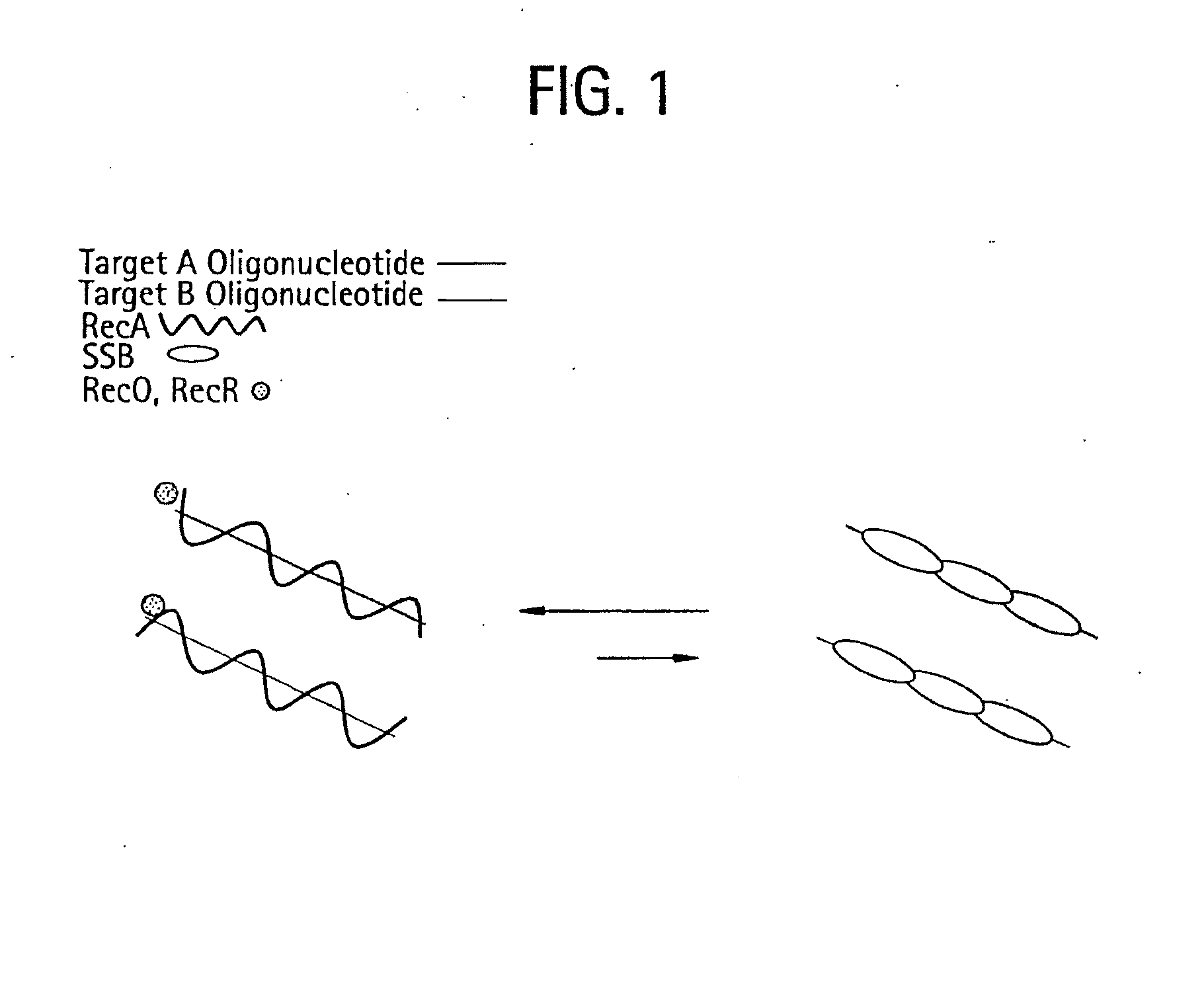 D-LOOP FORMATION/RESOLUTION COMPONENTS: Component Concentration RecA 20 μM Single-stranded oligonucleotide primers 0.25 μM ATP 3 mM RecF 0.1 μM RecO 0.13 μM RecR 0.5 μM Single-stranded Binding protein (SSB) 1 to 10 μM DNA polymerase V 5 units POLYMERASE/HELICASE/RESOLVASE MIX: Component Concentration DNA Polymerase 5 units RuvA 0.5 μM RuvB 0.5 μM RuvC 0.5 μM RecG 10 nM REACTION BUFFER: Component Concentration MgCl2 2 to 10 mM TrisHCl pH 7.2 10 mM DTT 0 to 10 mM KCl 0 to 50 mM Deoxyribonucleotide triphosphates 0.2 mM Bovine serum albumin (BSA) 0 to 10 μg per ml Example 2