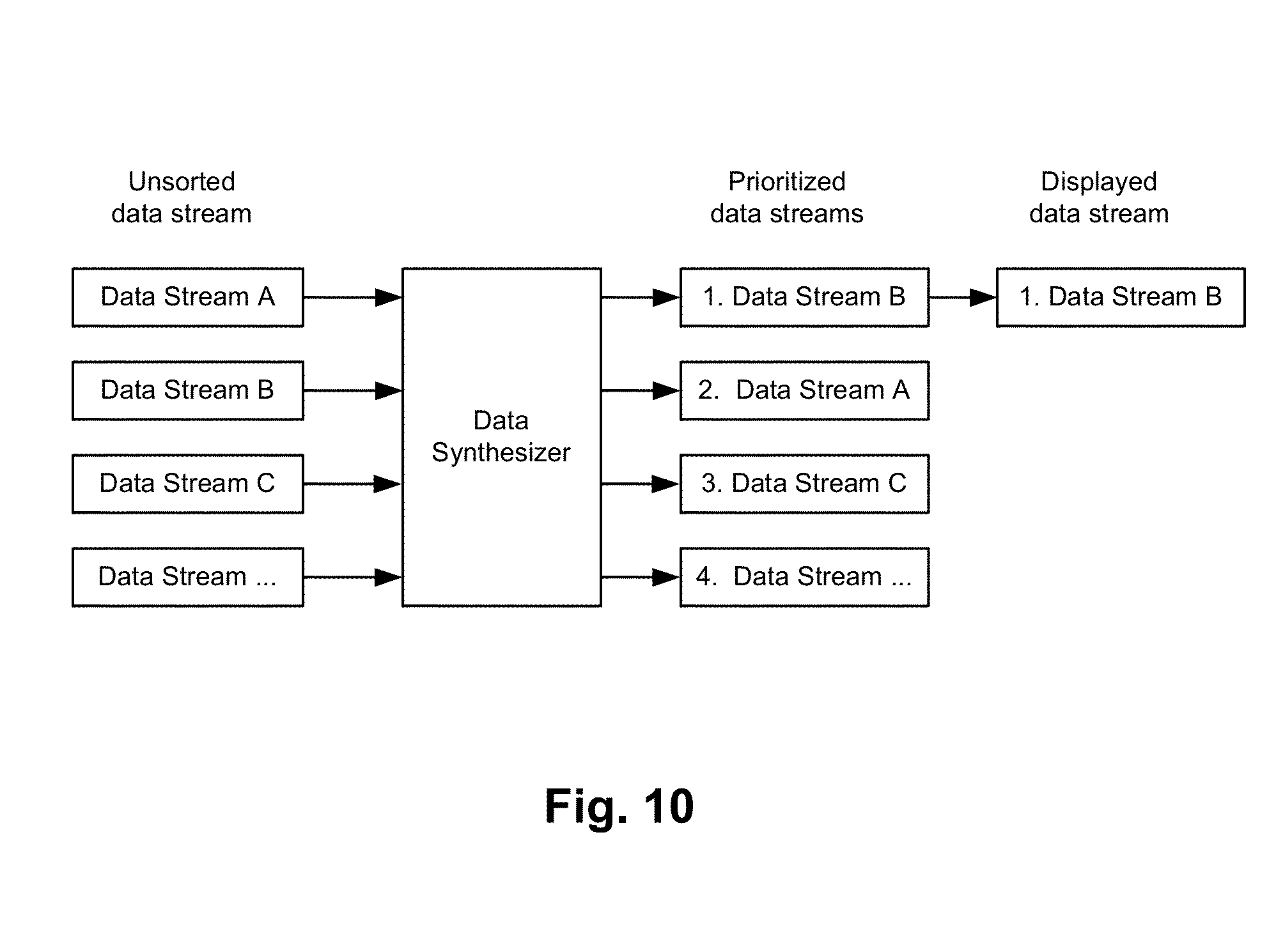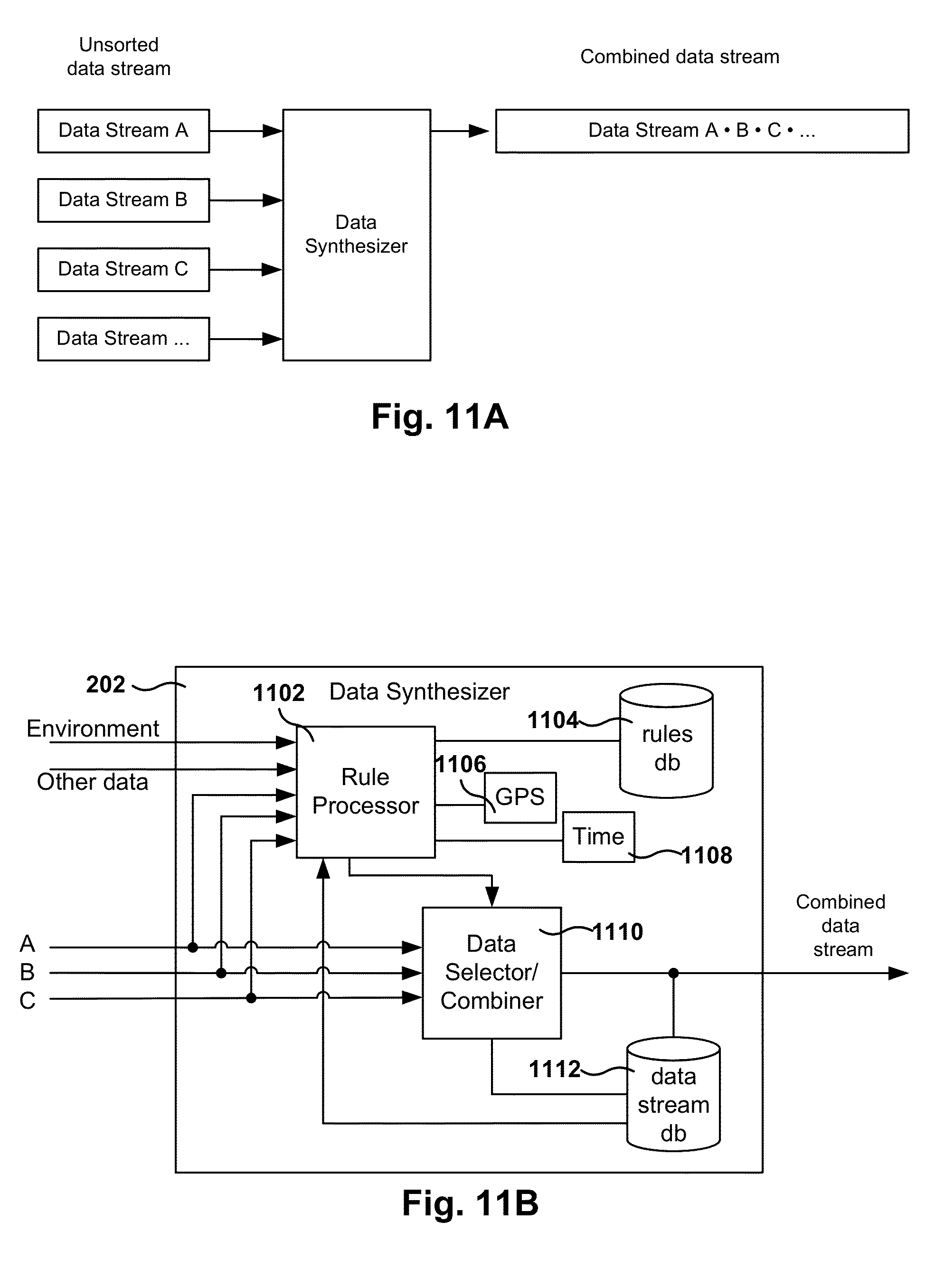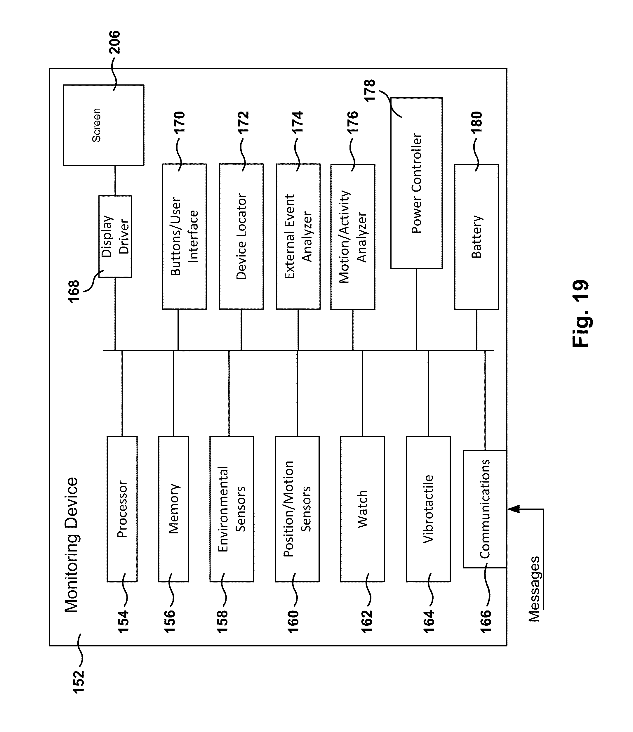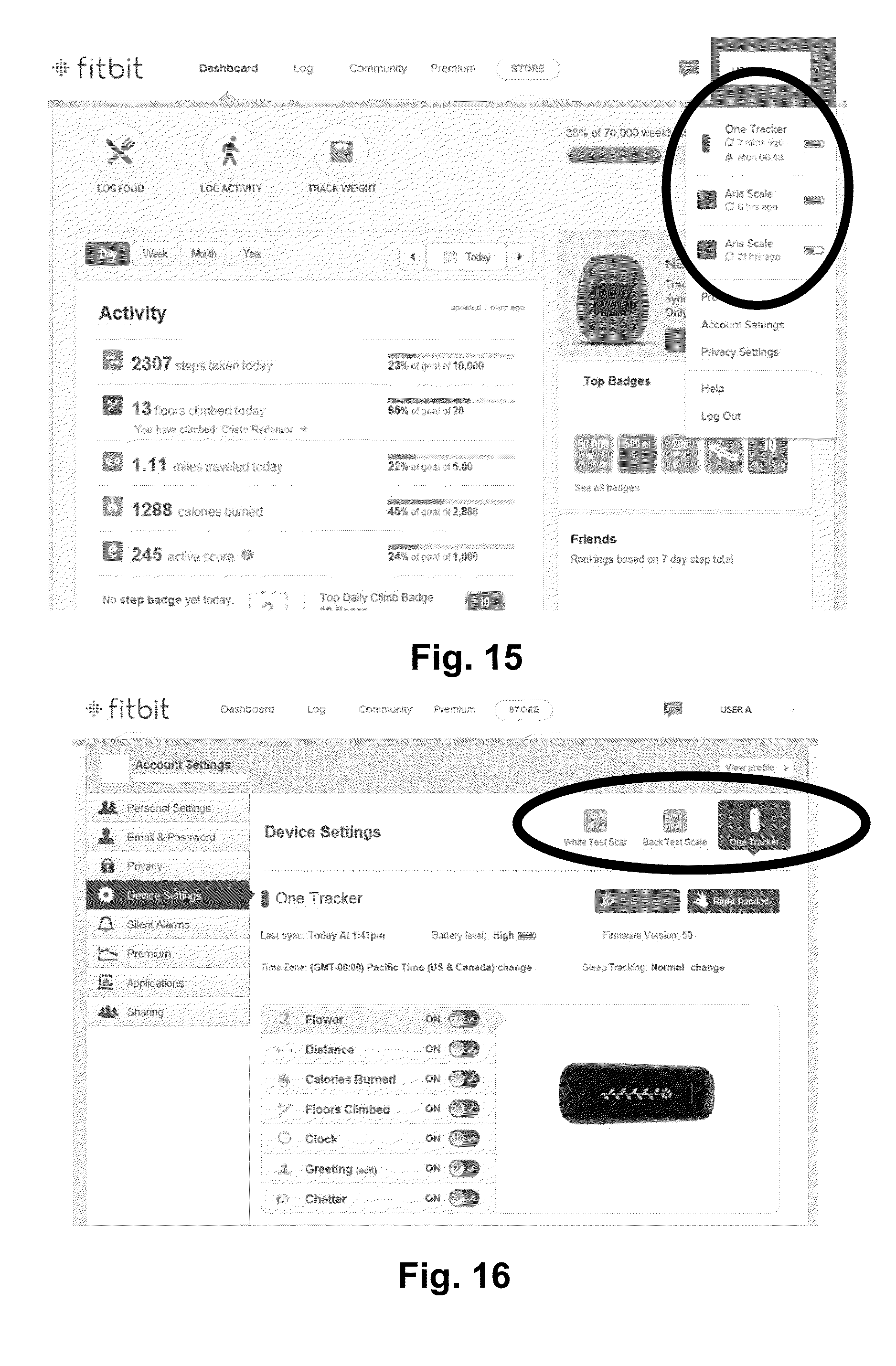 It is noted that these states may be communicated to the user through one or more methods including, but not limited to, displaying them visually, outputting an audio alert, and/or haptic feedback. In some embodiments, data analysis of data produced by different modules may be performed in monitoring device 152, in other device in communication with monitoring device 152, or in combination of both devices. For example, the monitoring device may be generating a large amount of data related to the heart rate of the user. Before transmitting the data, the monitoring device 152 may process the large amount of data to synthesize information regarding the heart rate, and then the monitoring device 152 may send the data to a server that provides an interface to the user. For example, the monitoring device may provide summaries of the heart rate in periods of one minute, 30 seconds, five minutes, 50 minutes, or any other time period. By performing some calculations in the monitoring device 152, the processing time required to be performed on the server is decreased. Some other data may be sent in its entirety to another device, such as steps the user is taken, or periodical updates on the location of the monitoring device 152. Other calculations may be performed in the server, such as analyzing data from different modules to determine stress levels, possible sickness by the user, etc. It is noted that the embodiments illustrated in From operation 852 the method flows to operation 854, where captured data is received from the plurality of devices, the captured data being about a first activity associated with a first period of time. From operation 854 the method flows to operation 856, where a detection takes place regarding the received captured data from two or more devices provides overlapping information about the first activity. From operation 856 the method flows to operation 858, where one or more rules are evaluated, the one or more rules being for consolidating the overlapping information to produce consolidated data. The consolidated data provides a unified view of the first activity during the first period of time. From operation 858 the method flows to operation 860 for storing the consolidated data for presentation to the user. In one embodiment, the operations of the method are executed by a processor. From operation 864 the method flows to operation 866, which is an operation for assembling a unified activity data stream for the user over a period of time. That unified activity data stream includes data segments from the data streams of at least two devices of the plurality of devices, and the data segments are organized time-wise over the period of time. As used herein, a time-wise organization of data segments refers to the aggregation of data from multiple devices based on the time associated with the data. In one embodiment, the data includes physical activity data of the user tagged with the timestamp for the time when the activity took place. As a result, the unified activity data stream includes data segments with respective time tags identifying the time associated with the data segment. From operation 866 the method flows to operation 868, which is an operation for generating display data for the unified activity data stream. The display data is configured for presentation on an interactive user interface, and the interactive user interface enables user selection of at least one of the data segments to identify additional information for the data segment, and to further identify which of the plurality of devices produced the physical activity data of the user for the selected data segment. In one embodiment, the operations of the method are executed by a processor. While the various operations in this flowchart are presented and described sequentially, one of ordinary skill will appreciate that some or all of the operations may be executed in a different order, be combined or omitted, or be executed in parallel. In one embodiment, the device collects one or more types of physiological and/or environmental data from embedded sensors and/or external devices and communicates or relays such metric information to other devices, including devices capable of serving as Internet-accessible data sources, thus permitting the collected data to be viewed, for example, using a web browser or network-based application. For example, while the user is wearing an activity tracking device, the device may calculate and store the user's step count using one or more sensors. The device then transmits data representative of the user's step count to an account on a web service, computer, mobile phone, or health station where the data may be stored, processed, and visualized by the user. Indeed, the device may measure or calculate a plurality of other physiological metrics in addition to, or in place of, the user's step count. Some physiological metrics include, but are not limited to, energy expenditure (for example, calorie burn), floors climbed and/or descended, heart rate, heart rate variability, heart rate recovery, location and/or heading (for example, through GPS), elevation, ambulatory speed and/or distance traveled, swimming lap count, bicycle distance and/or speed, blood pressure, blood glucose, skin conduction, skin and/or body temperature, electromyography, electroencephalography, weight, body fat, caloric intake, nutritional intake from food, medication intake, sleep periods (i.e., clock time), sleep phases, sleep quality and/or duration, pH levels, hydration levels, and respiration rate. The device may also measure or calculate metrics related to the environment around the user such as barometric pressure, weather conditions (for example, temperature, humidity, pollen count, air quality, rain/snow conditions, wind speed), light exposure (for example, ambient light, UV light exposure, time and/or duration spent in darkness), noise exposure, radiation exposure, and magnetic field. Sti