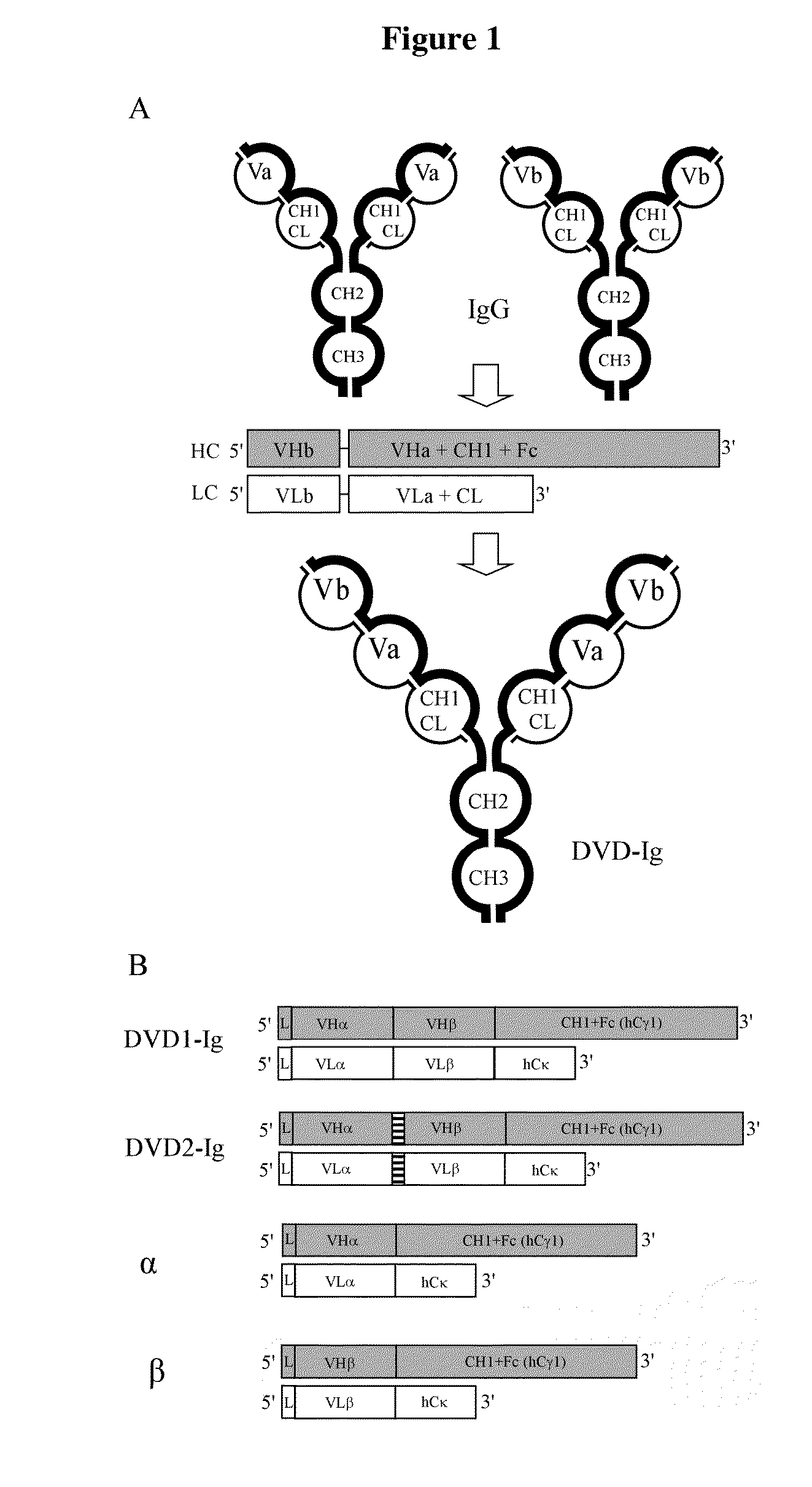 Ab+Ag←Ab—Ag.Table 1: List of Amino Acid Sequences of VH and VL Regions of Antibodies for Generating DVD-Binding Proteins