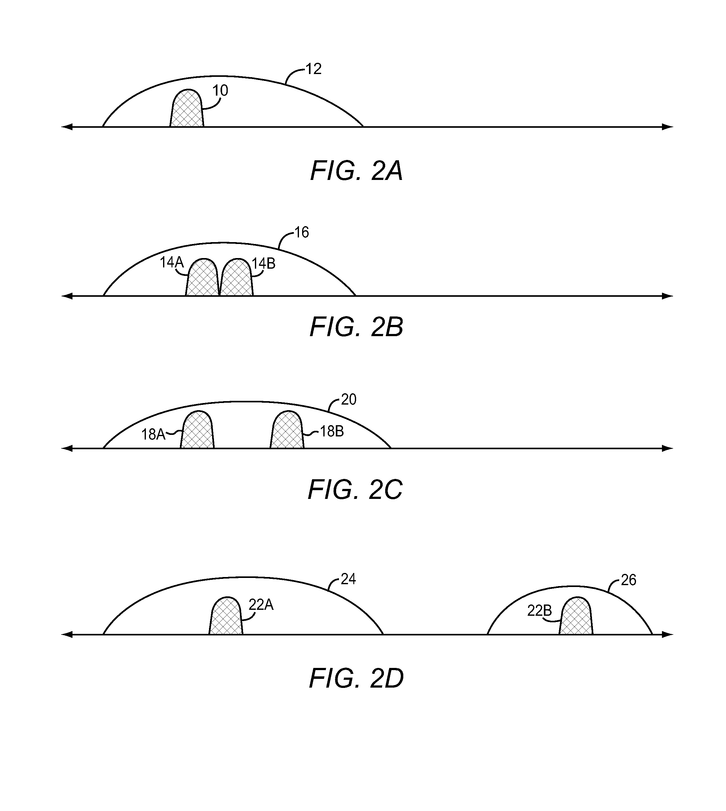 FIGS. 2B-2D show diagrams representing a variety of carrier aggregation configurations for a mobile device. FIG. 2B shows an example of contiguous, intra-band carrier aggregation, in which the aggregated portions of the wireless spectrum 14A and 14B are located directly adjacent to one another and are in the same operating band 16. FIG. 2C shows an example of non-contiguous intra-band carrier aggregation, in which the aggregated portions of the wireless spectrum 18A and 18B are located within the same operating band 20, but are not directly adjacent to one another. Finally, FIG. 2D shows an example of inter-band carrier aggregation, in which the aggregated portions of the wireless spectrum 22A and 22B are located in different operating bands 24 and 26. A modern mobile device should be capable of supporting each one of the previously described carrier aggregation configurations.