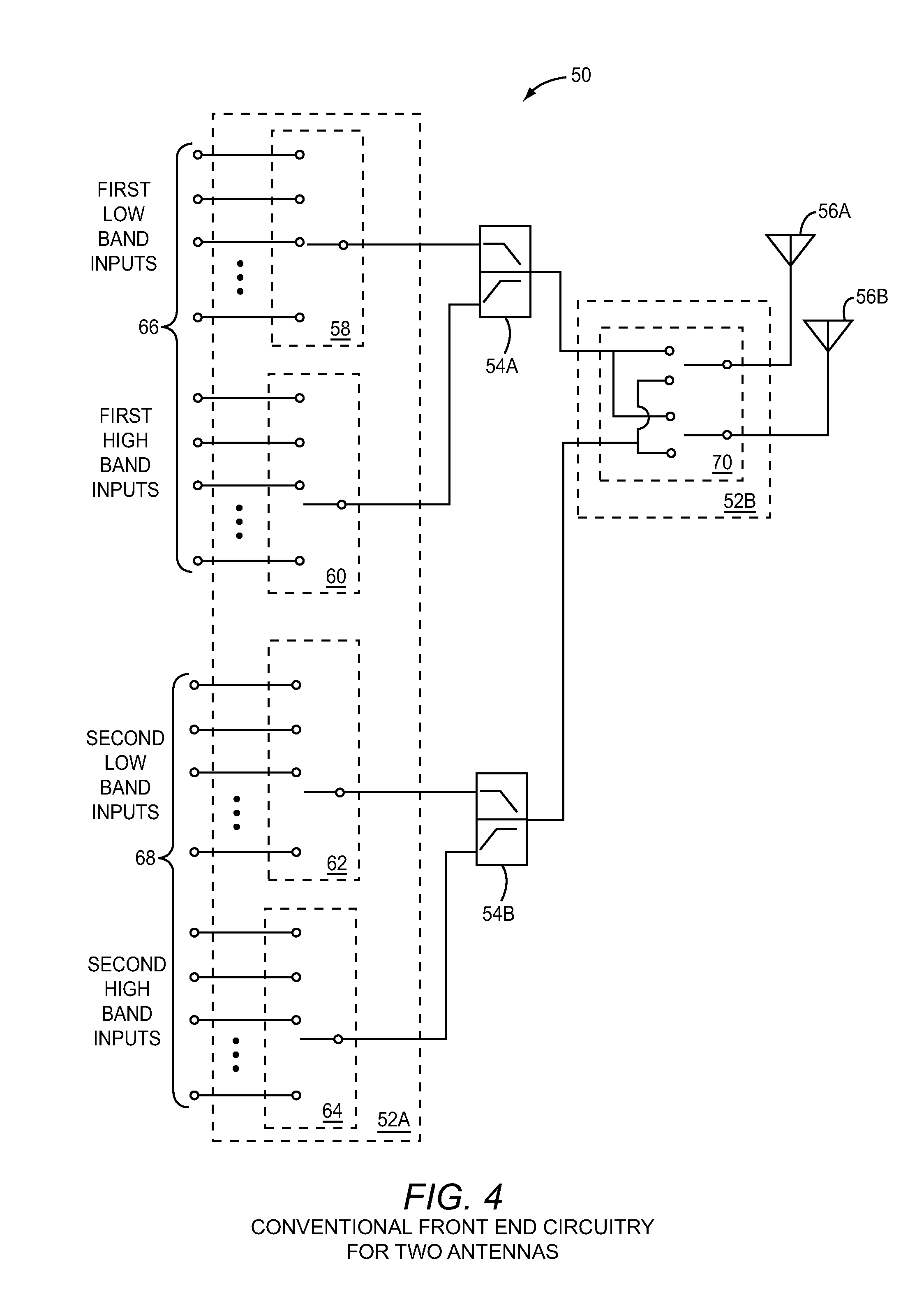 As an additional example, the conventional front end circuitry 50 will also experience problems in carrier-aggregation applications using bands 4 and 17 (CA 4-17), because the third harmonic of a band 17 transmit signal (2112-2148 MHz) falls within a band 4 receive signal (2110-2155 MHz). The problem with the conventional front end circuitry 50 may occur in any carrier aggregation configuration using operating bands in which the harmonic components of the carrier signal fall within the frequency band of the receive signal. The limited combination of operating bands usable in a carrier aggregation configuration by the conventional front end circuitry 50 illustrated in FIG. 4 may impede the performance and versatility of a mobile device. Accordingly, front end switching circuitry for a mobile device with two or more antennas is needed that is suitable for carrier aggregation applications across all bands.