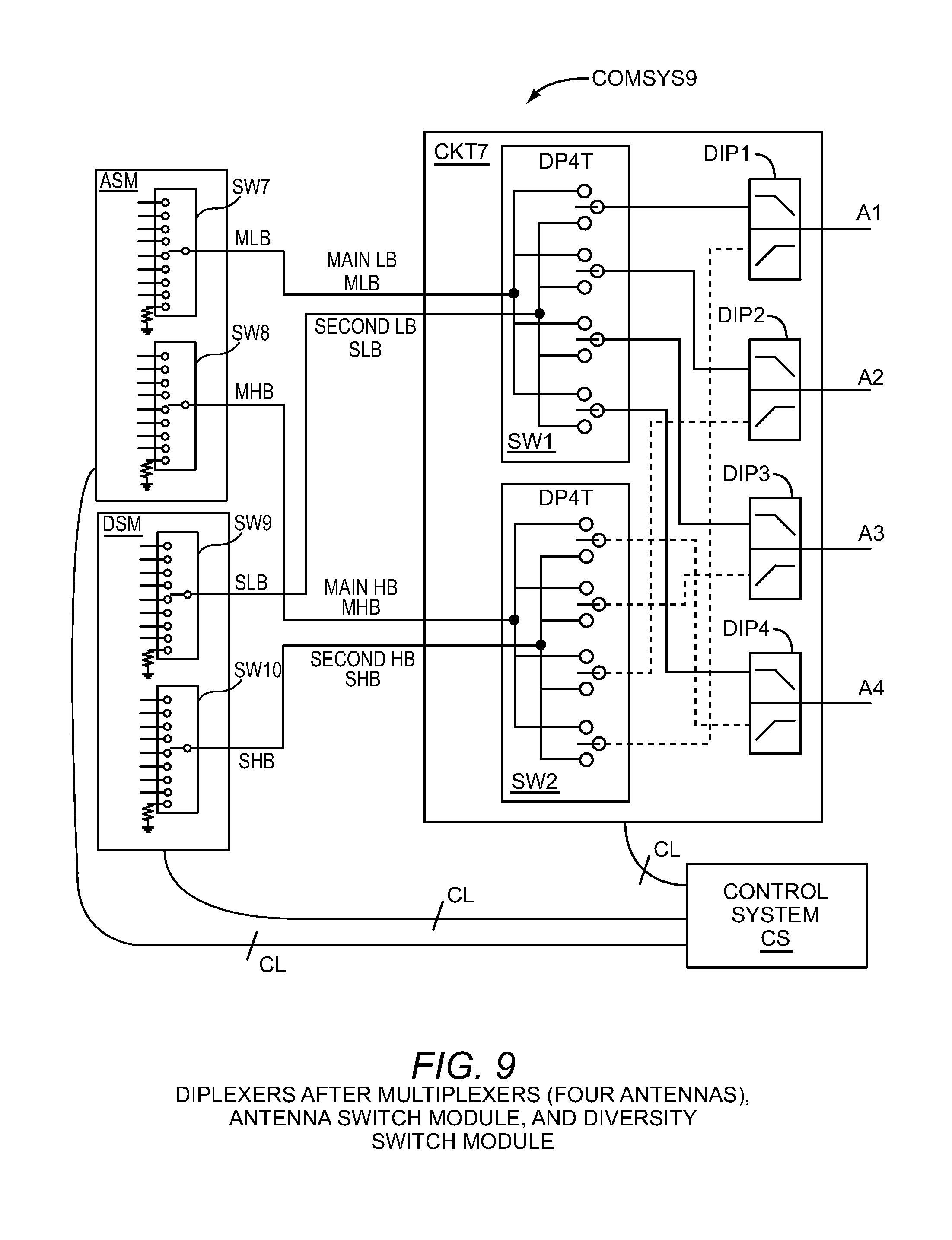 Control system CS may control communication circuit CKT7 through control lines CL. These control lines may control switches SW1 and SW2, diplexers DIP1-DIP4, and other elements of CKT7 that are not shown.