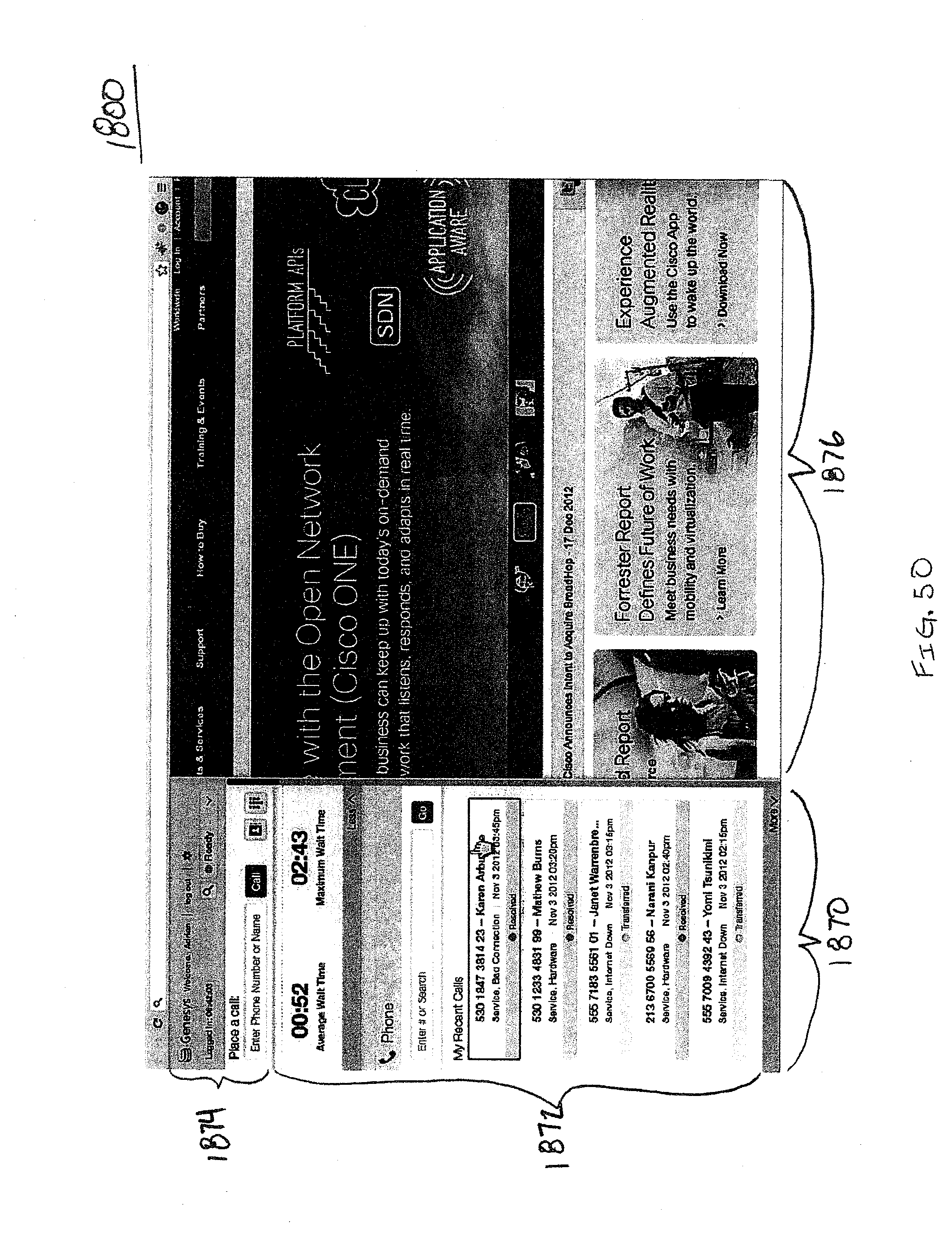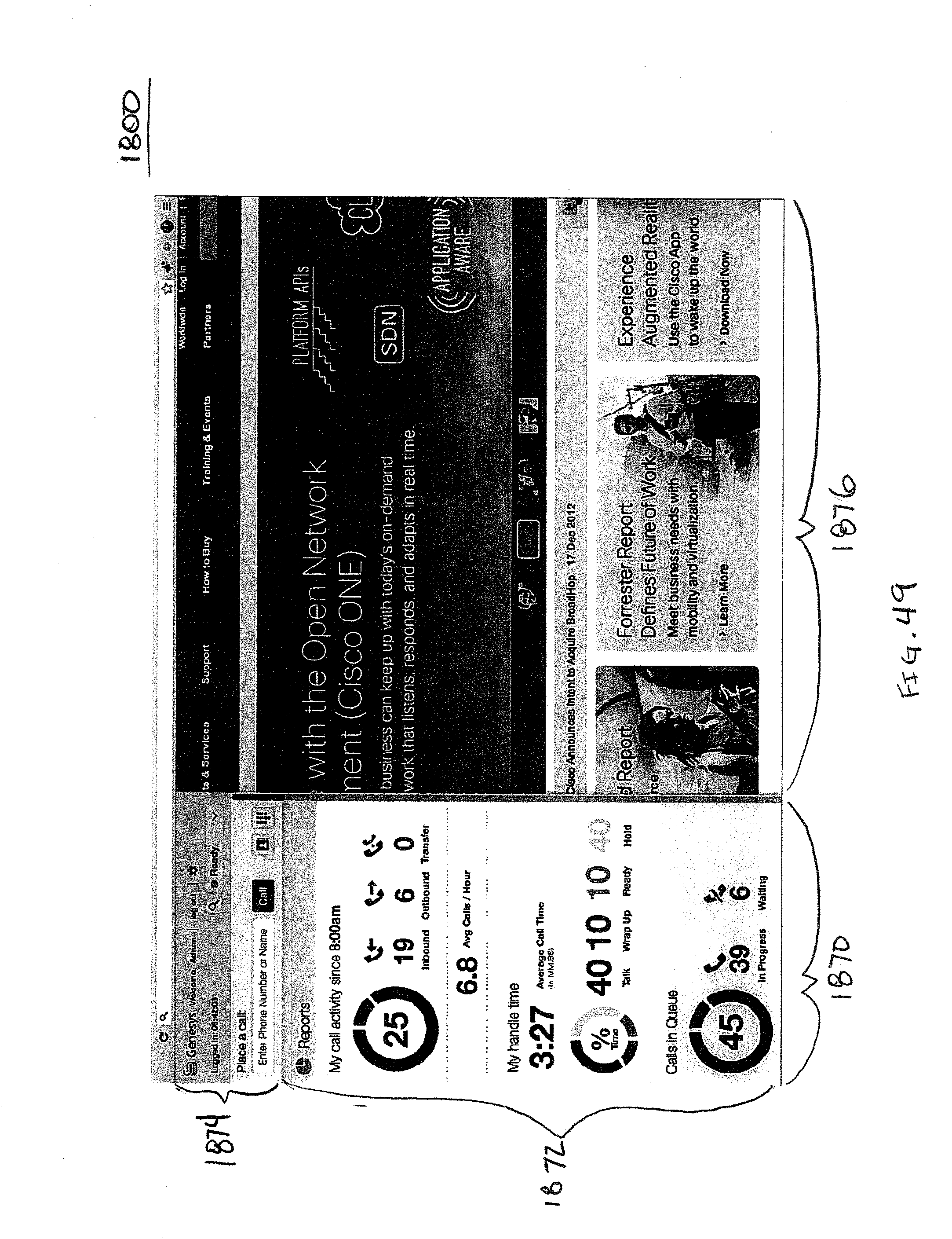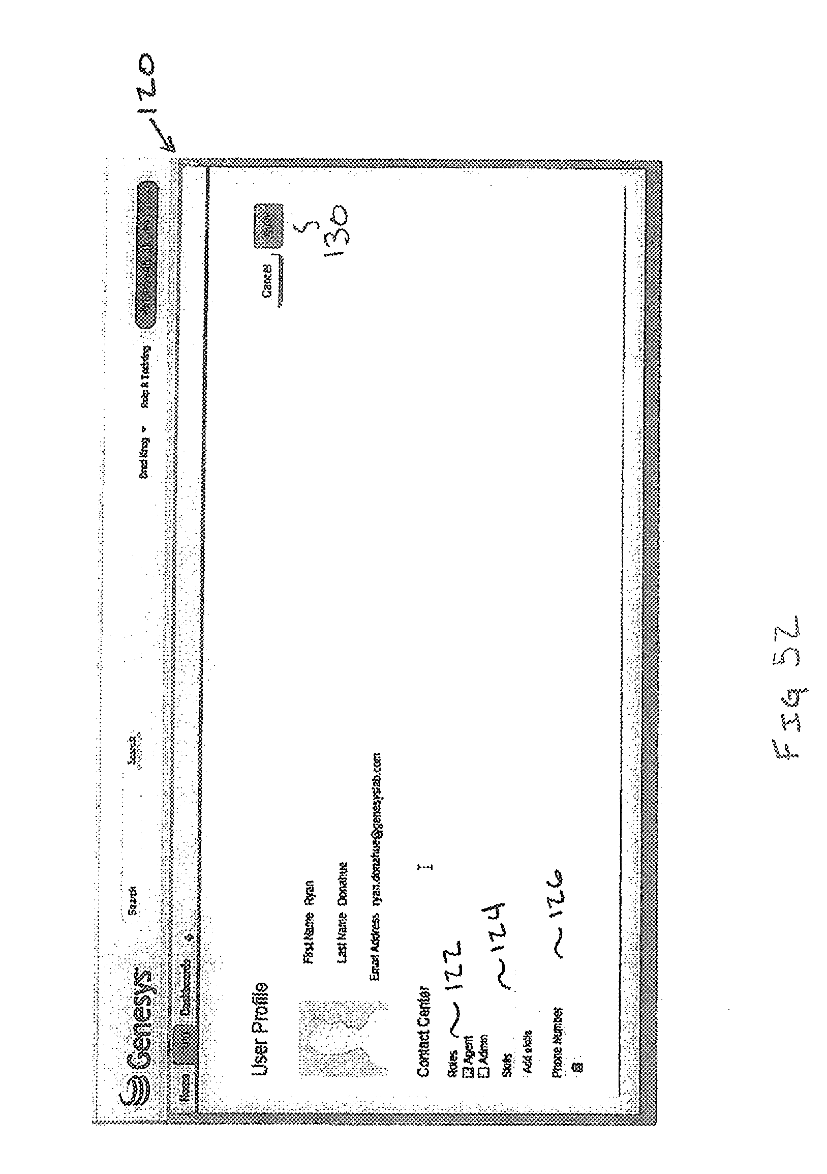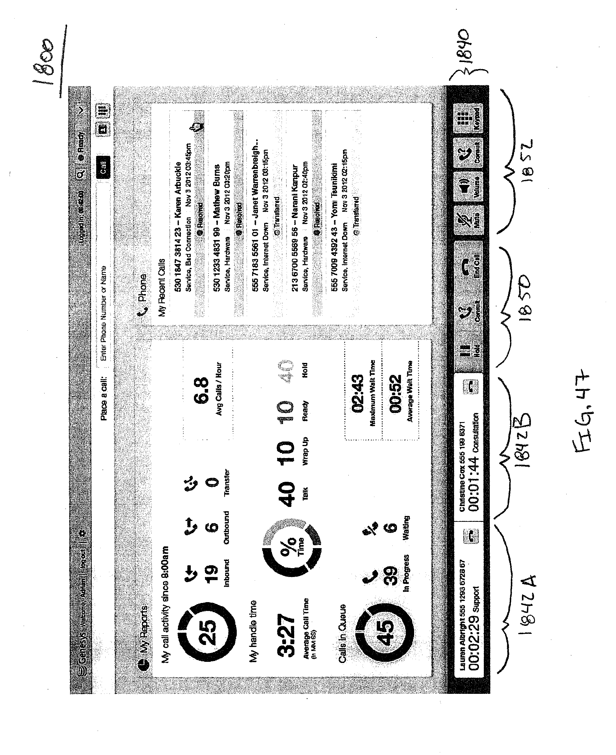 FIG. 59 is a screen shot of an exemplary UI page 190 displaying a dashboard 192 for an administrator to monitor activity of an operating contact center. According to one embodiment, the dashboard is generated by the specialized application 52. The dashboard may include real-time and historical data associated with a particular contact center. Additionally, the dashboard may include data from the third party web portal. The dashboard may present the contact center data using configurable charts and graphs, such that the administrator may readily and easily understand the status of the contact center. Information displayed on the dashboard may include, but is not limited to, number of users logged in, a historical login record, call activity, call duration, call time, hold time, and sales information.
