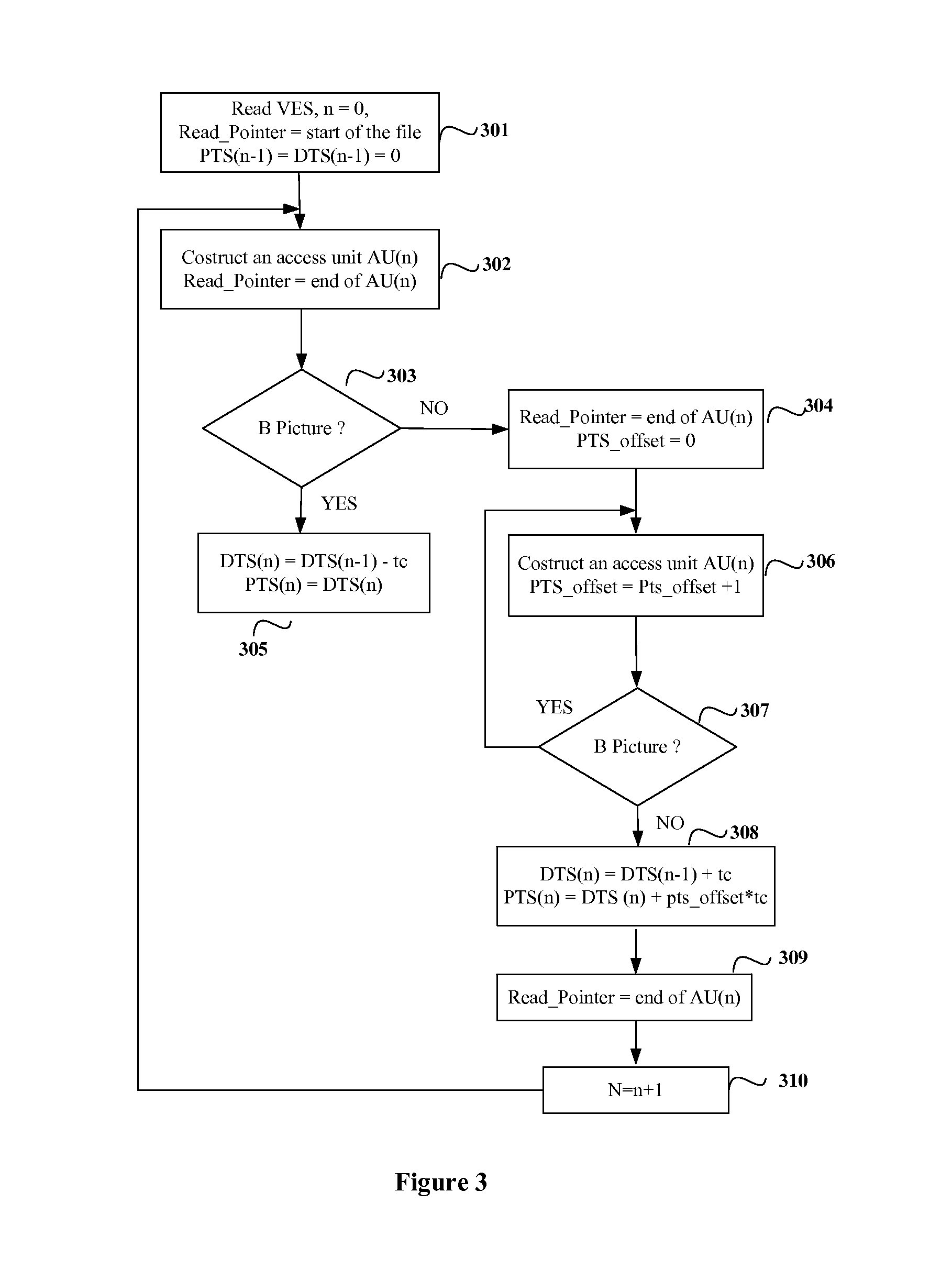 In step 304, end point of the AU is noted and PTS offset is set as zero. For other frames I or P, in step 306, next access units are constructed, and in step 307 the next AUs are checked for the number of B frames (pts_offset) that precede before the next I or P frames occurs. Once this information is available, in step 308 DTS and PTS are calculated as dts(n)=dts(n−1)+tc and pts(n)=dts(n)+pts_offset*tc.