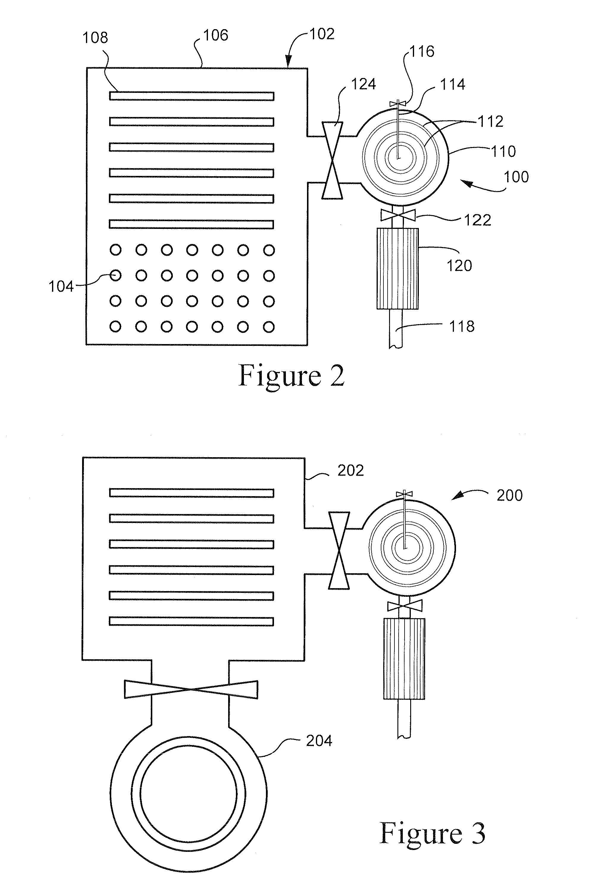 FIG. 3 illustrates a compact condenser 200 connected to a freeze dryer 202 having an external condenser 204. The construction and operation of the compact condenser 200 is the same as that of the compact condenser 100 shown in FIG. 2.