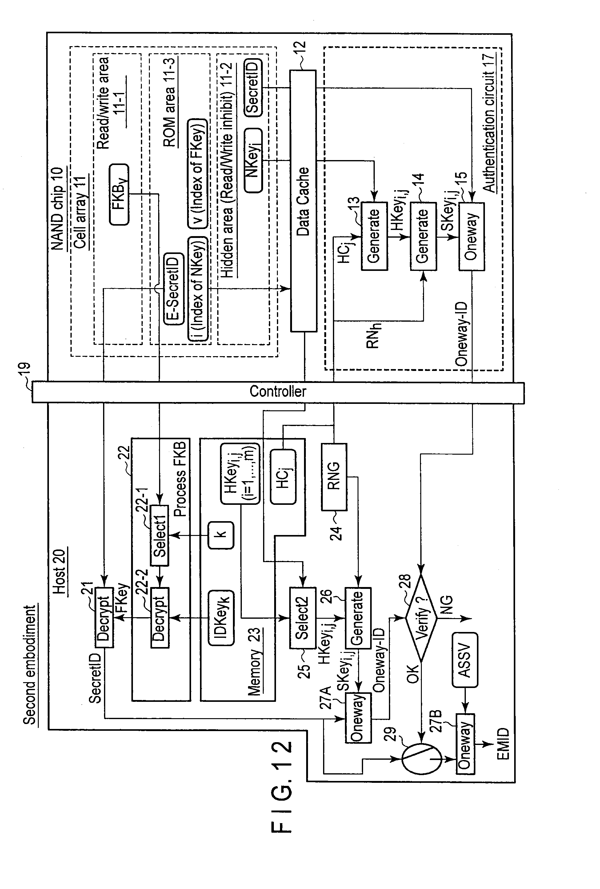 The memory card 55 includes the authentication function and the function to be authenticated according to at least one of the above embodiments. The host device 20 verifies the authenticity of SecretID of the NAND flash memory 10 by the authentication process shown in the above embodiments. After the authenticity is verified, the host device 20 executes the calculation process of EMID by using the method shown in the second embodiment based on the secret identification information SecretID.