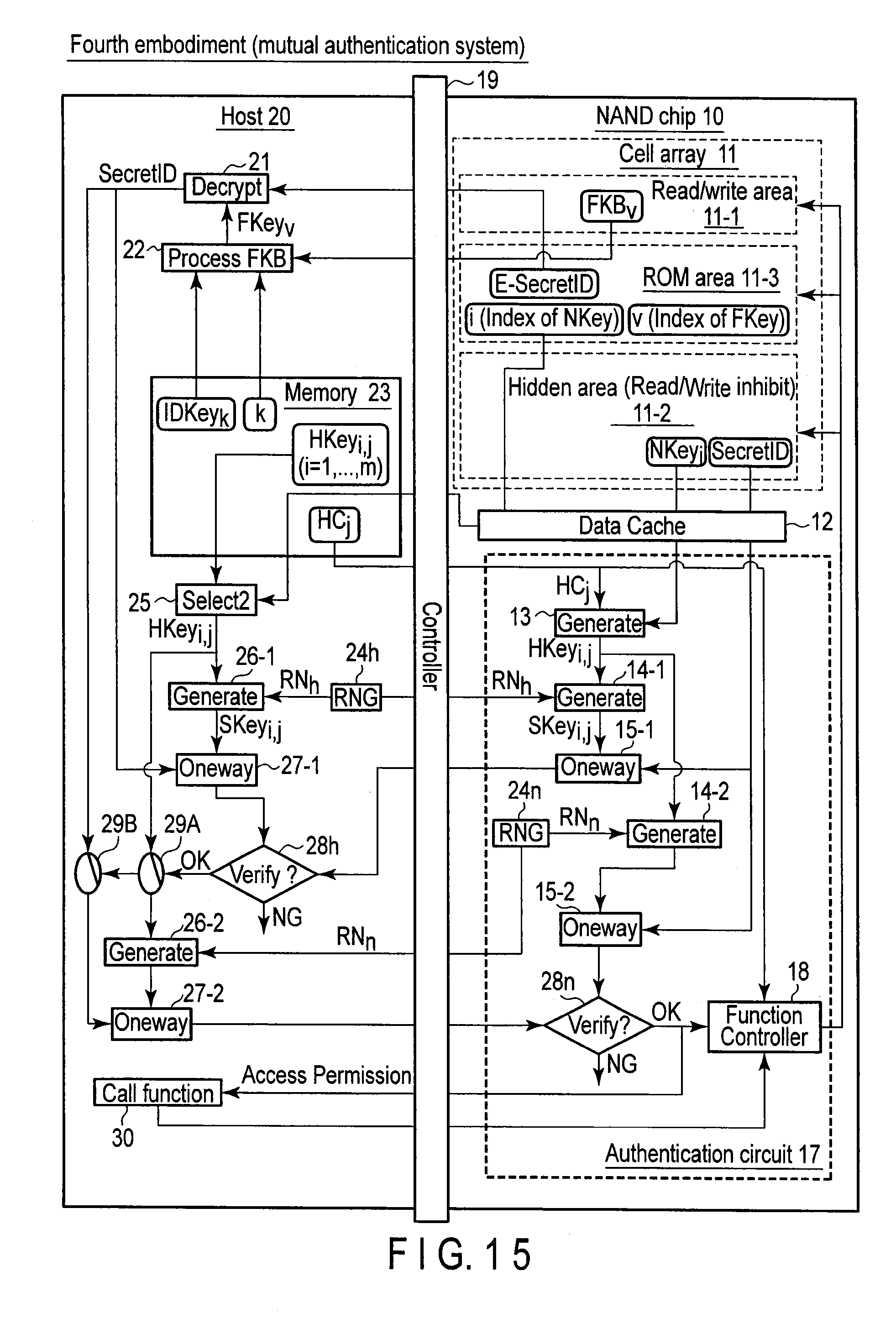 The present embodiment is an example of using the authentication function and the function to be authenticated included in the NAND flash memory 10 in the memory card 55 via the card socket 550, but is also applicable to a configuration in which the NAND packages are directly embedded in the host device 20 and the host device 20 directly controls the NAND packages. In this case, the memory card 55 may be replaced by the NAND package.