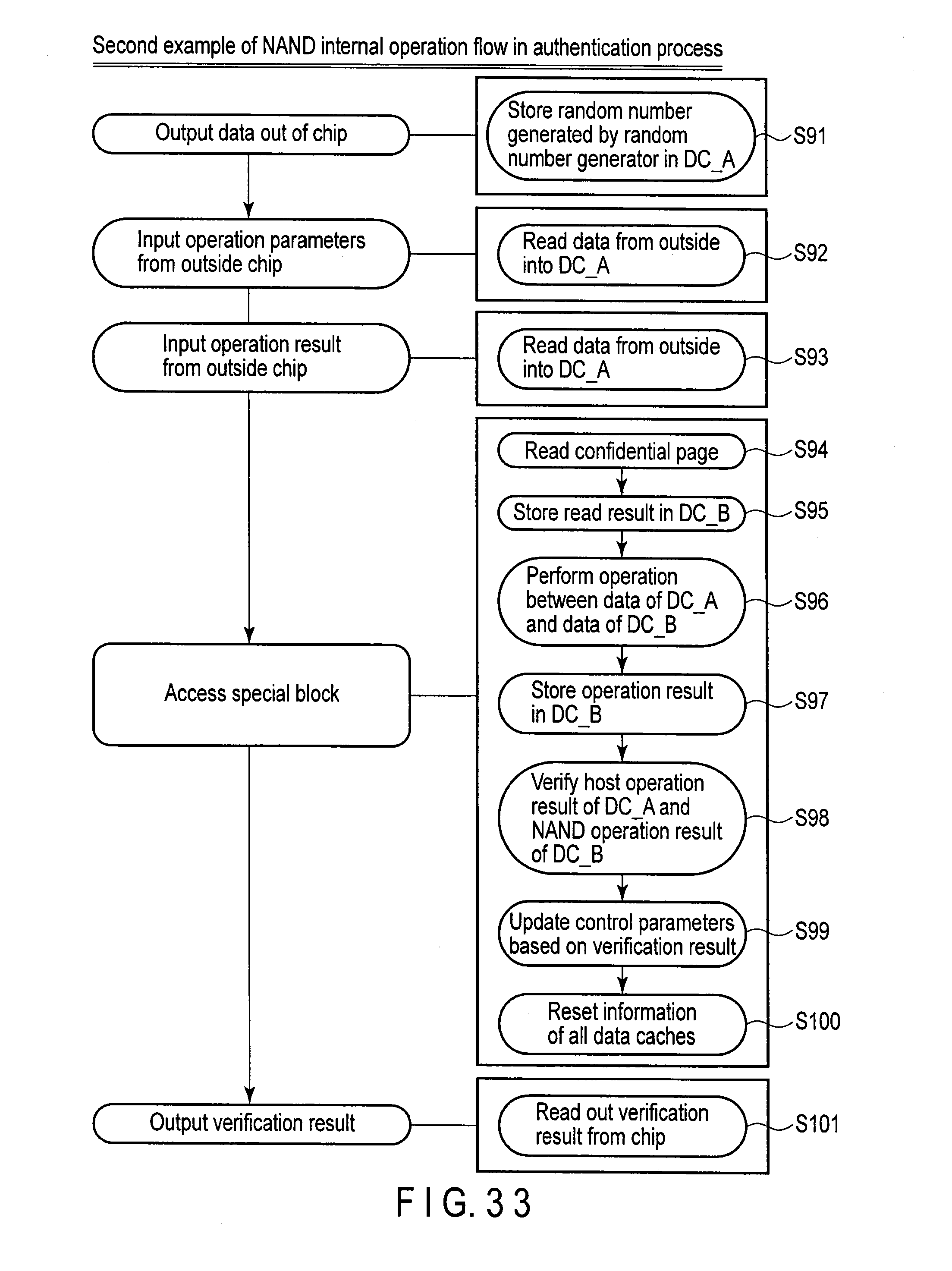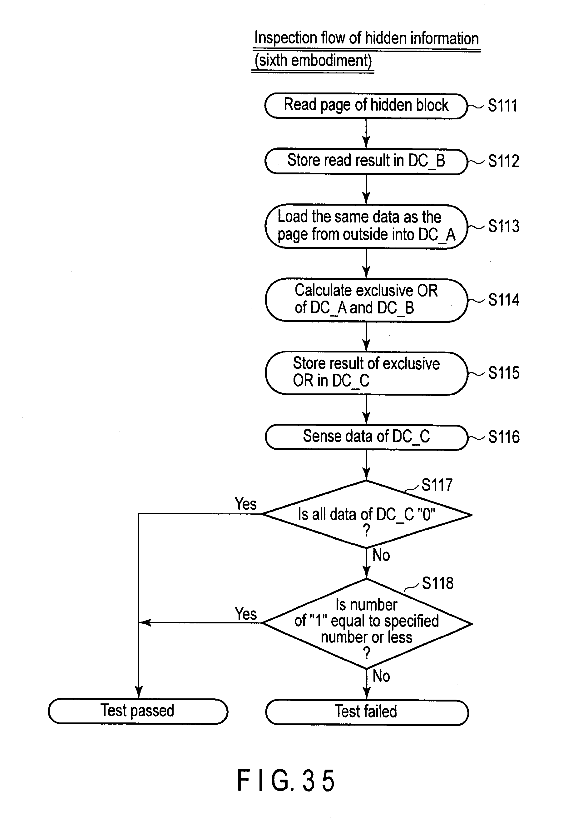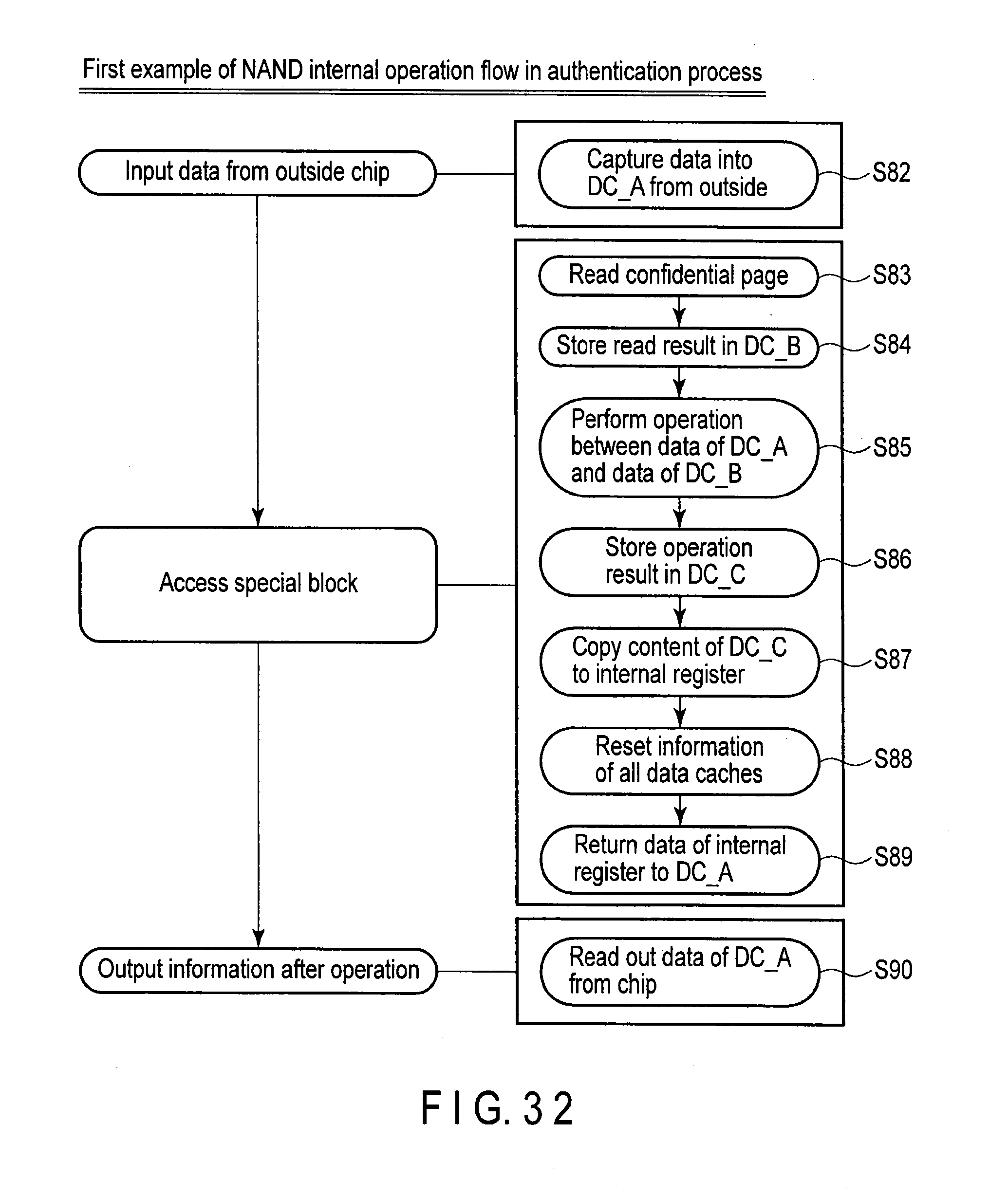 A configuration example of the sense amplifier and the peripheral circuit thereof is shown as in FIG. 45. In the second modification, as shown in FIG. 45, data cache 12 includes data caches (latch circuits) DC_A, DC_B, DC_C, and DC_S and only DC_A is connected to a data line via a column control circuit and is used to exchange data with units outside the chip. DC_S is a latch used to control the operation of the sense amplifier in accordance with data. DC_B, DC_C, and DC_S are connected in parallel with a bus (LBUS) between DC_A and the sense amplifier and used as data caches and it is necessary to exchange data with the outside via DC_A. The column control circuit connects DC_A associated with the column address to a data line. When a NAND flash memory is used for normal operation, the column address supplied by an address control circuit is used, but the address specified by an operator is used when an authentication sequence of the present proposal is performed. Whether to use a normal address or an address of an operator can be switched by a mode switching signal.
