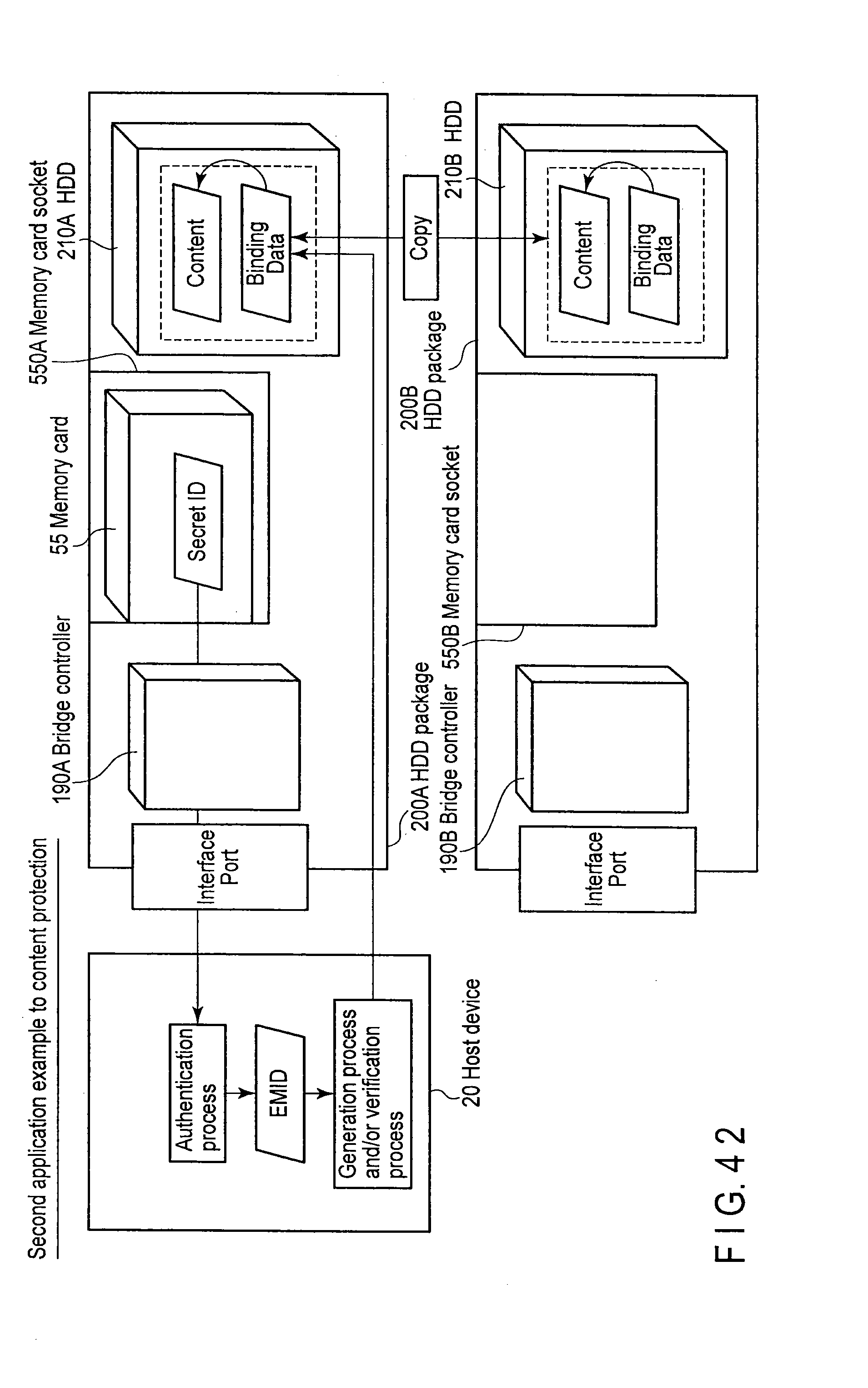 Further, as an application example applicable to the host device 20 having the card socket 550, if a plurality of the similar host devices 20 exists, content can be reproduced by any of the host devices 20 by connecting the memory card 55 and the HDD package 200 to the other host device 20. Content and Binding Data may be recorded in the card 55, instead of the HDD 210, or in both.