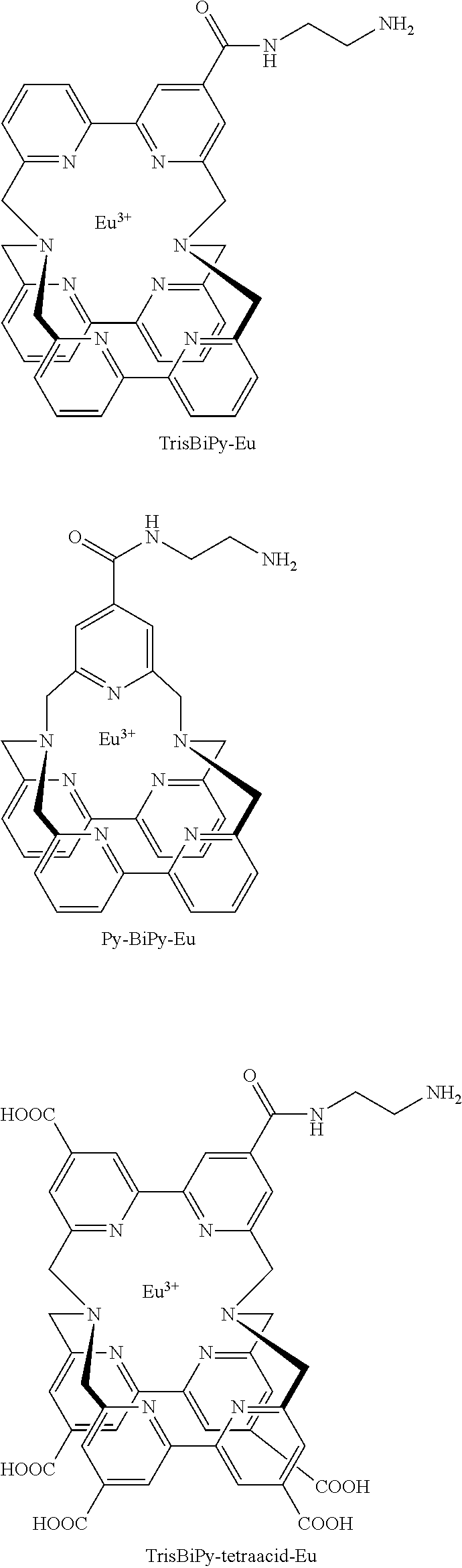 Furthermore, for each assay, the fluorescence signals measured on solutions obtained by cascade ½ dilution (so as to obtain a concentration range) from a stock solution containing a mixture of 50 nM of antibody—Lumi4® Tb and 50 nM of antibody—d2 were measured simultaneously with the samples, and a relationship was established between the signal obtained at 665 nm and that measured at 620 nm for each antibody concentration. The resulting curve was used to calculate the contribution of the Lumi4®-Tb fluorescence at 665 nm (F665Tb) on the basis of the signal emitted by the samples at 620 nm. The TR-FRET signal was expressed in the following way: