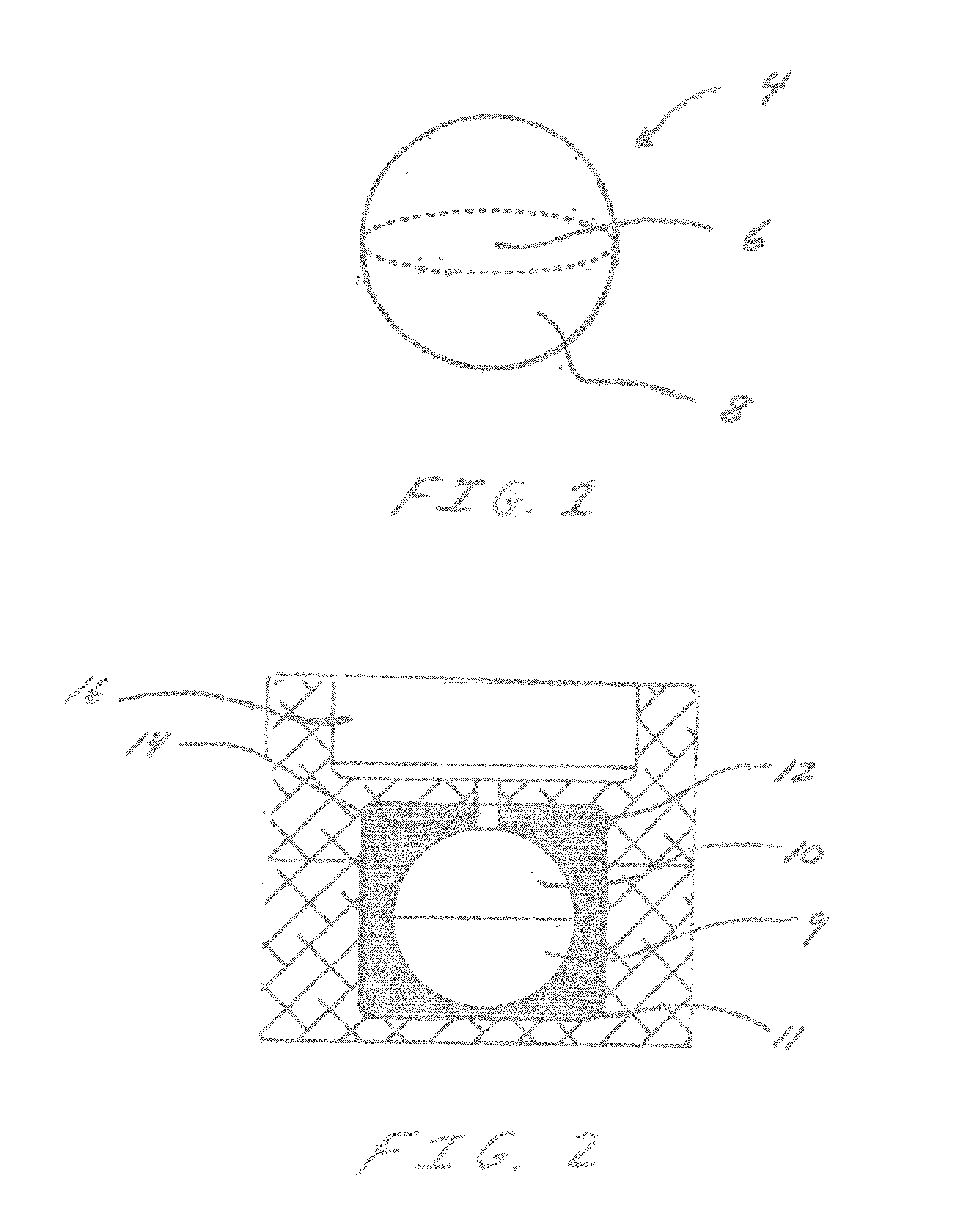 Core Dimensions and Volumes Dimensions of Total Total Volume Volume Core Layers Diameter Volume of MC of IC MC* of 0.05″ 0.2″ 0.07 cc 0.06 cc 0.01 cc thickness and IC** of 0.1″ diameter. MC of 0.05″ 1.2″ 14.8 cc 3.4 cc 11.4 cc thickness and IC of 1.1″ diameter. MC of 0.40″ 0.9″ 6.25 cc 6.24 cc 0.01 cc thickness and IC of 0.1″ diameter. MC of 0.40″ 1.3″ 18.9 cc 17.8 cc 1.07 cc thickness and IC of 0.5″ diameter. *MC—intermediate core layer **IC—inner core layer Core Dimensions and Volumes Dimensions of Total Total Volume Volume Core Layers Diameter Volume of OC of MC OC* of 0.2″ 0.6″ 1.85 cc 1.78 cc 0.06 cc thickness; MC** of 0.05″ thickness; and IC*** of 0.1″ diameter. OC of 0.1″ 1.6″ 35.1 cc 11.6 cc 12.1 cc thickness; MC of 0.15″ thickness; and IC of 1.1″ diameter. OC of 0.75″ 1.7″ 42.1 cc 42.04 cc 0.06 cc thickness; MC of 0.05″ thickness and IC of 0.1″ diameter. *OC—outer core layer **MC—intermediate core layer ***IC—inner core layer EXAMPLES