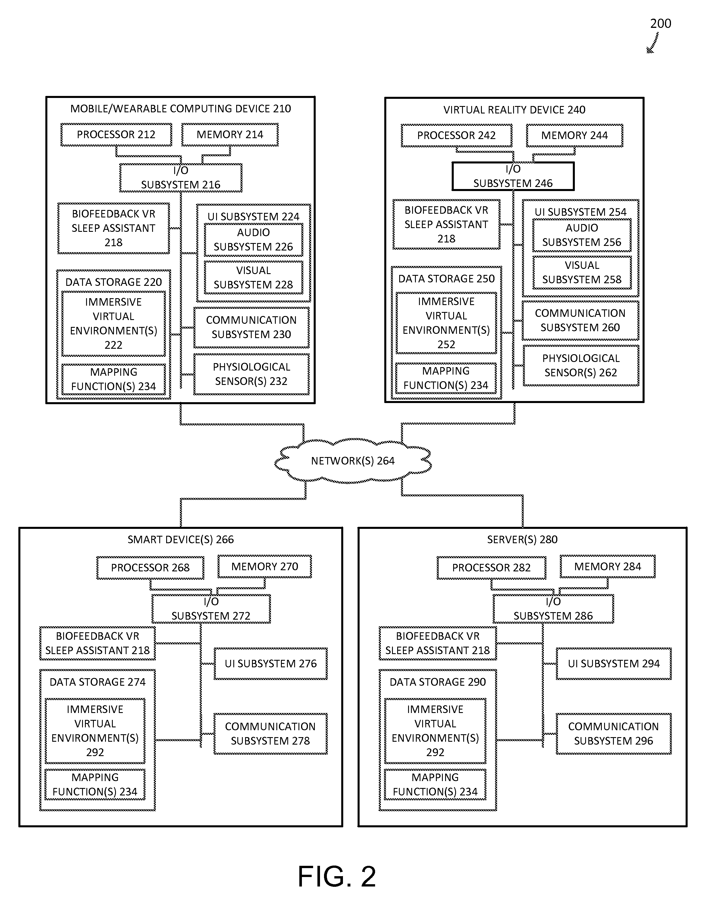In yet another embodiment, the physiological feedback data may be used to detect a state of full sleep, or a state sufficiently close to full sleep, and turn off the sleep assistant 218 after certain physiological conditions have been met. As an example, the system 100 can detect, based on the physiological signals, whether a person has fallen asleep or wishes to discontinue using the system 100 as follows. When the person begins using the system 100, they begin by consciously slowing their breathing rate, and the system 100 detects a low breathing rate. However, when people fall asleep, they lose the voluntary control of their own breathing. Therefore, once the person falls asleep, their breathing rate returns to “normal,” and the system 100 detects an increase in the breathing rate relative to the previously-slowed breathing rate (e.g., the breathing rate voluntarily slowed by the user performing a relaxation technique while conscious). The system 100 can thus turn off the sleep assistant application 218 when the system 100 detects a normal breathing rate for a certain period of time (e.g. when the person falls asleep) after having previously detected a low breathing rate for a certain period of time. A return to a normal breathing rate could also mean that the user has discontinued the voluntary slow breathing the person does not want use the device anymore. In this case as well, the system 100 can turn off the sleep assistant application 218 in response to the return to a normal breathing rate. In this way, the sleep assistant 218 is configured to guide individuals toward sleep, starting from a conscious level (which typically occurs at the beginning of the night, when the person is still awake), through intermediate stages in which users use the VR biofeedback system, up to the point at which when they fall sleep (unconsciousness). During the intermediate stages, the system 100 automatically adjusts the immersive virtual environment (by increasing the sense of presence or degree of immersiveness) so that the user progressively feels that the (unreal) virtual environment is actually their real (physical) environment. As the user's sense of presence in the virtual environment increases, the user's mind is distracted from aspects of their real environment that normally disrupt sleep (such as physical features of the room, emotional connections with the physical environment, and thoughts of worry and rumination).